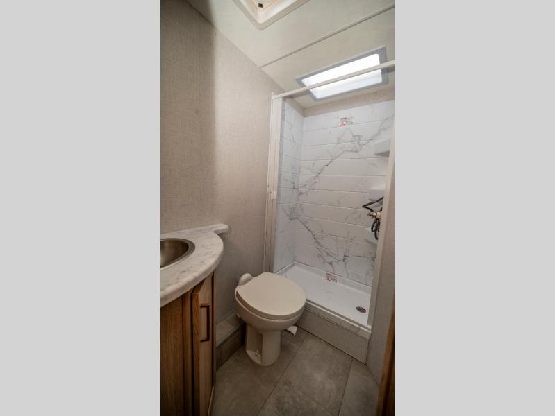 It won't be hard to find comfort in this coach for five! You can freshen up in the rear corner full bath once you've set up camp, then make lunch on the two burner gas cooktop or convection microwave with an air fryer. There is also a 12V refrigerator for cold items and a flip-up countertop for more space. Whether you dine at the Dream Dinette or take your plate outdoors under the 15' power awning, you're sure to have a great time in this motorhome. There is a semi-private bedroom with a 60" x 74" RV queen bed slide and bedroom TV prep if you want the option to watch movies in bed. And your guests can take the Dream Dinette and cab-over bunk at night!
