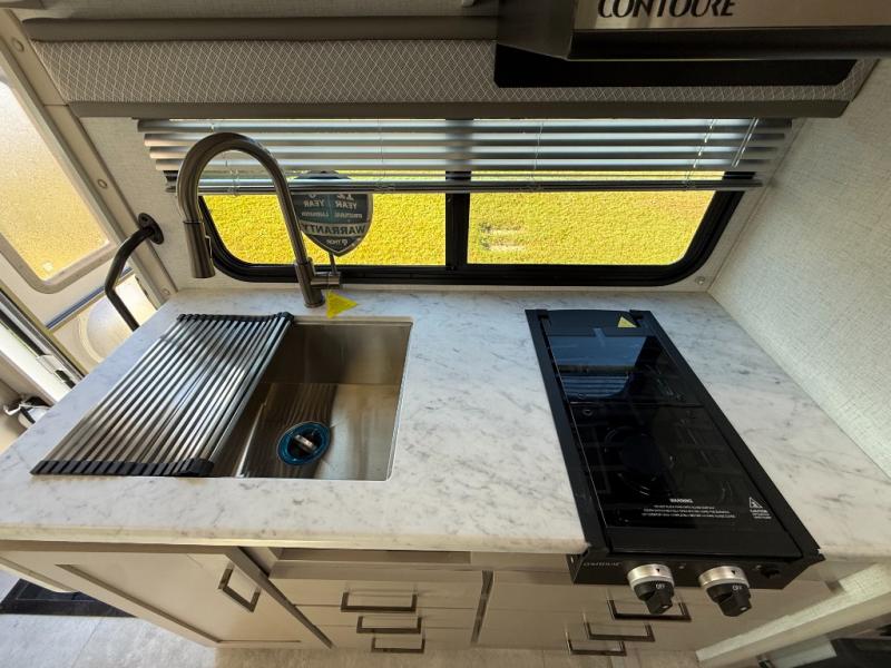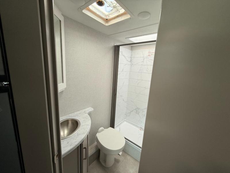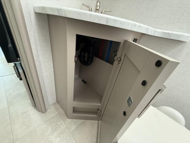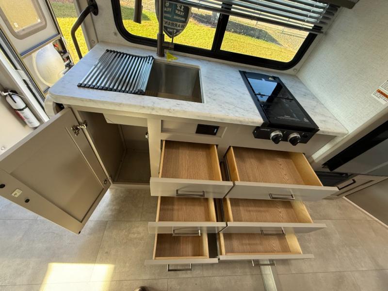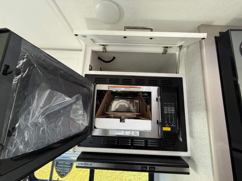 It won't be hard to find comfort in this coach for five! You can freshen up in the rear corner full bath once you've set up camp, then make lunch on the two burner gas cooktop or convection microwave with an air fryer. There is also a 12V refrigerator for cold items and a flip-up countertop for more space. Whether you dine at the Dream Dinette or take your plate outdoors under the 15' power awning, you're sure to have a great time in this motorhome. There is a semi-private bedroom with a 60" x 74" RV queen bed slide and bedroom TV prep if you want the option to watch movies in bed. And your guests can take the Dream Dinette and cab-over bunk at night!