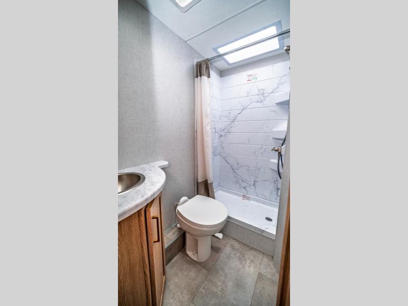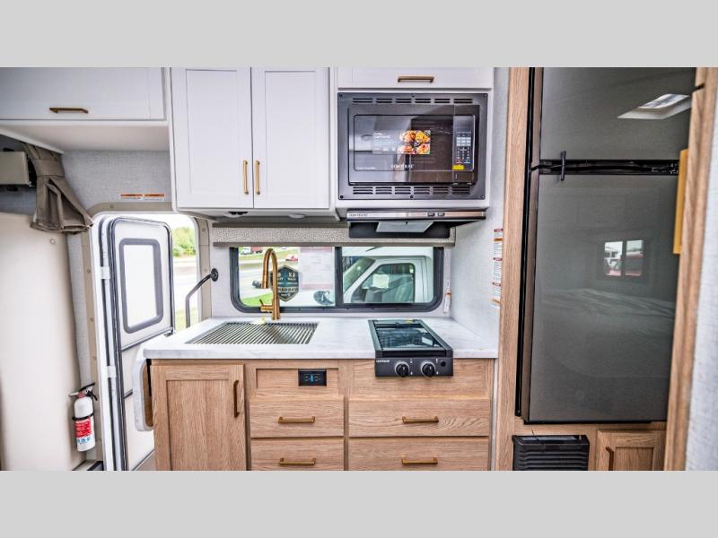 It won't be hard to find comfort in this coach for five! You can freshen up in the rear corner full bath once you've set up camp, then make lunch on the two burner gas cooktop or convection microwave with an air fryer. There is also a 12V refrigerator for cold items and a flip-up countertop for more space. Whether you dine at the Dream Dinette or take your plate outdoors under the 15' power awning, you're sure to have a great time in this motorhome. There is a semi-private bedroom with a 60" x 74" RV queen bed slide and bedroom TV prep if you want the option to watch movies in bed. And your guests can take the Dream Dinette and cab-over bunk at night!