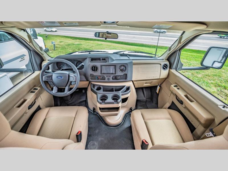 With any Chateau ESpec Class C gas motorhome by Thor Motor Coach, you will find convenient amenities, a modern interior, and a reliable Ford E-Series chassis, with an optional Chevy chassis on select models to power your adventures. There is welded tubular aluminum roof and sidewall cage construction, a one-piece fiberglass front cap, and a premium one-piece domed roof membrane for added strength. Residential vinyl flooring will be easy to keep clean, and you'll love the sleek look of the Hampton Collection two-toned cabinets. These motorhomes also include a 50 State 4.0 kW dual gas/LP generator and a 30-amp shoreline power cord to keep you going, along with a tankless water heater and 13,500 roof front A/C to ensure your comfort!