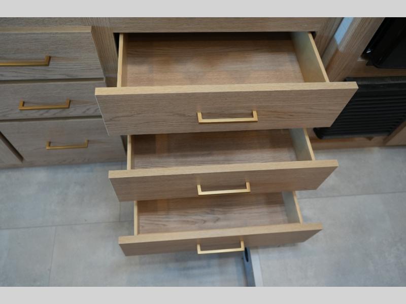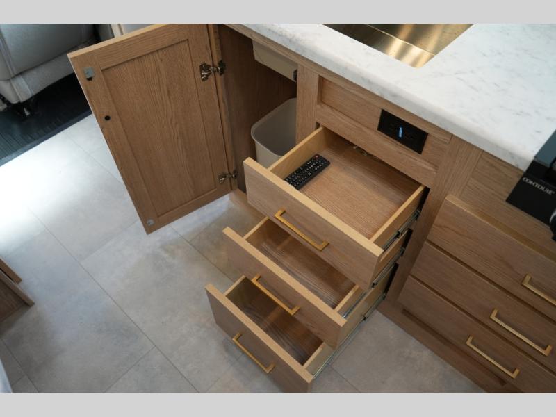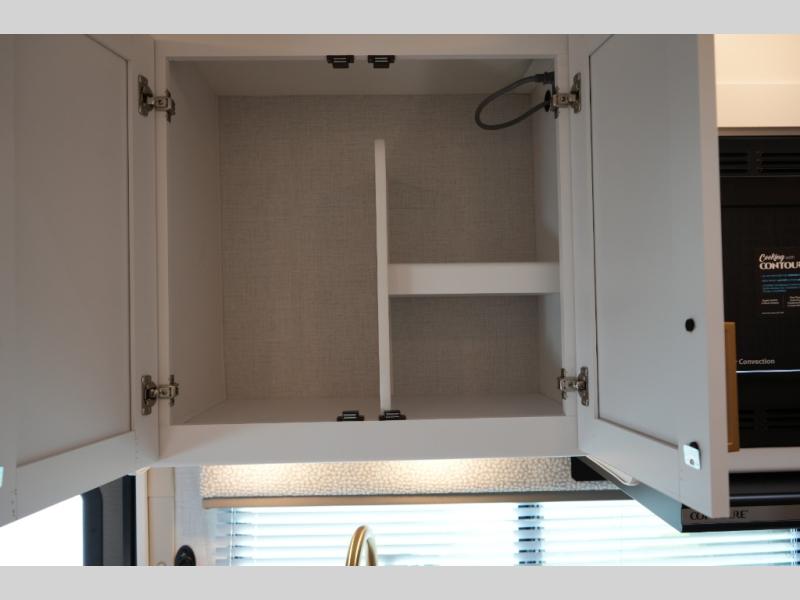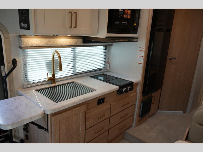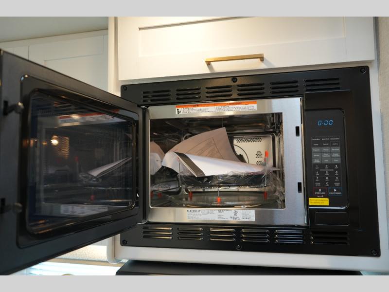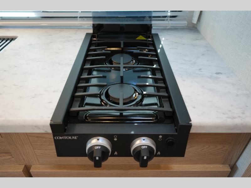 Well-Equipped Kitchen – Two-burner gas cooktop, convection microwave with air fryer, 12V refrigerator, and flip-up countertop