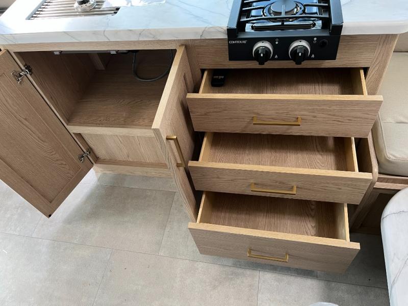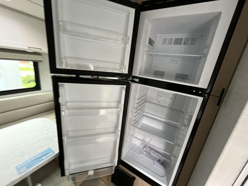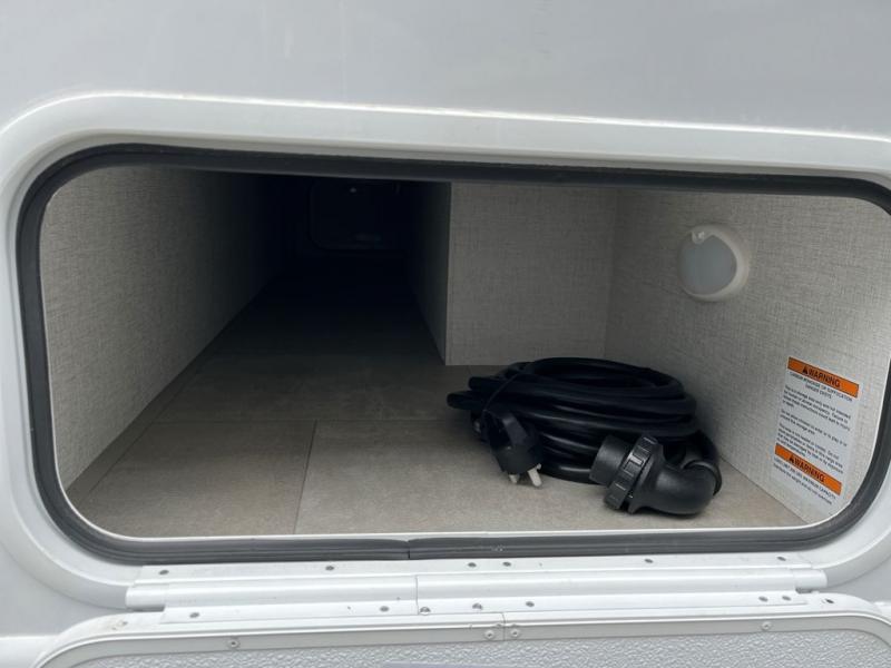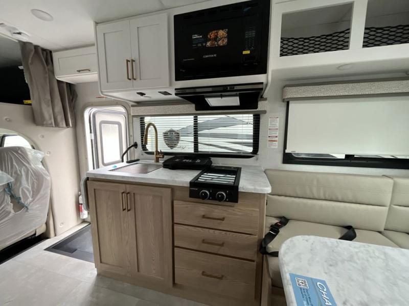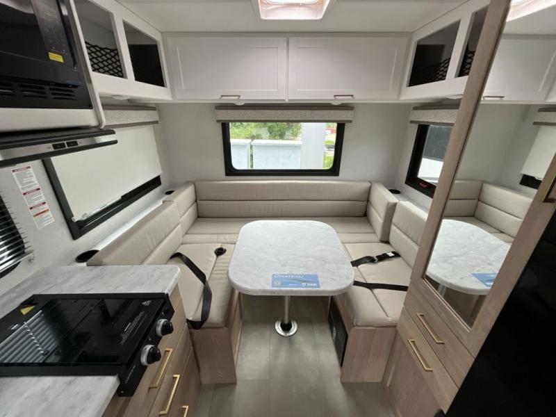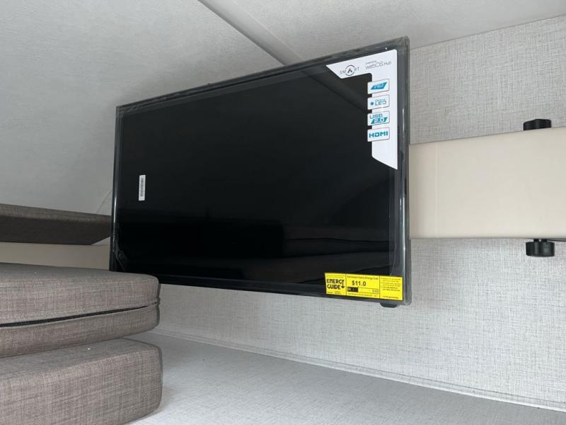 This compact, yet cozy coach is perfect for trips to the campground each weekend! Once you've reached your destination, you can set up the 11' power awning, unload the exterior storage compartments, and relax in your camp chairs. The two burner gas cooktop and convection microwave with an air fryer will let you make meals each day, and there is a 12V refrigerator to keep food fresh. A flip-up counter is another great feature that will give you more prep space! You can freshen up in the wet bath, grab your night clothes from the closet, then convert the U-shaped dinette into a 54" x 77" bed for a great night's rest!