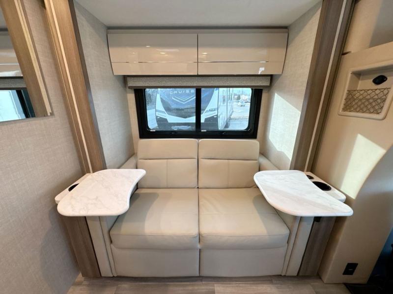 The perfect coach for two whether you are a couple or not! This Compass AWD model features a set of twin beds that can easily convert to a king bed if you like. Enjoy the added space thanks to a slide out jack-knife sofa with a removable pedestal table. This table is handy for dining when you are stopped. You will appreciate the kitchen amenities for light meals and snacks while on the road, plus the onboard bath offers a 27" x 27" radius shower, toilet, and sink which is convenient as well. There are also two 32" Smart TVs in this coach, one over the side entry opposite the seating in front, and one back in the sleeping area at the foot of the roadside twin bed. A built-in skylight offers the ability to stargaze in the front of the coach on a clear night.