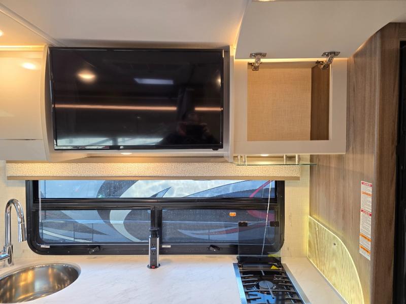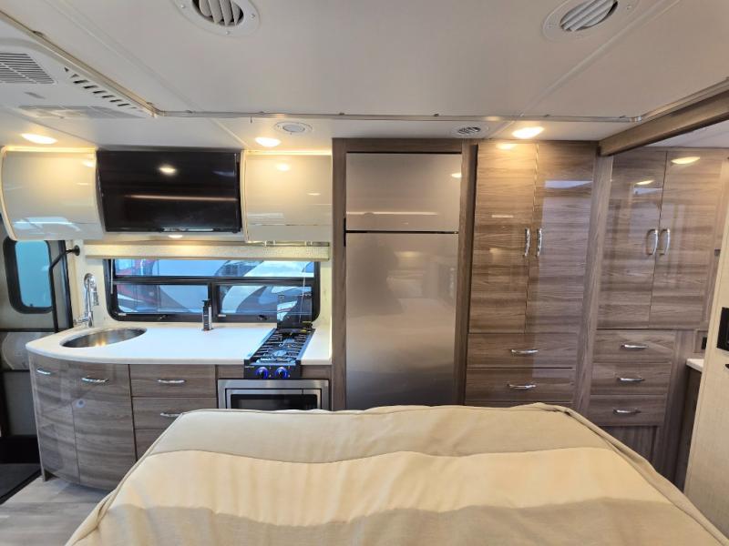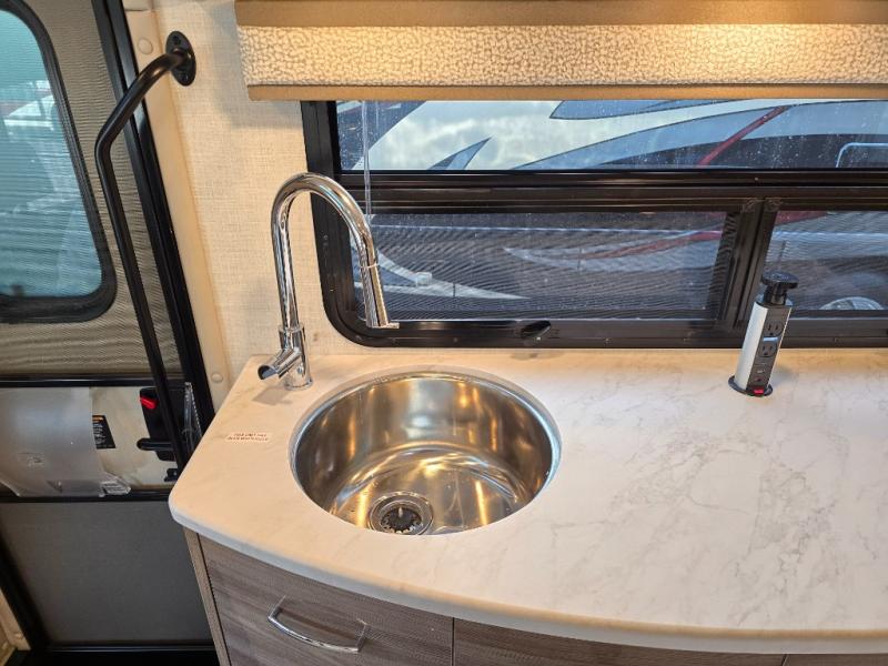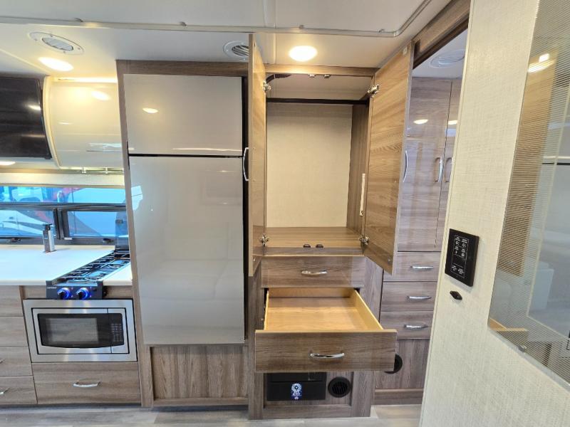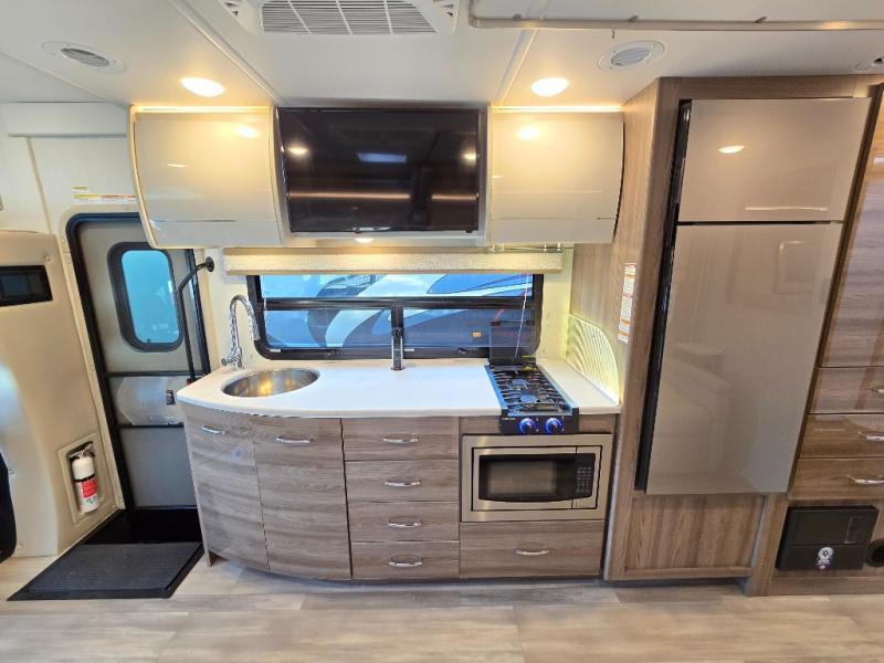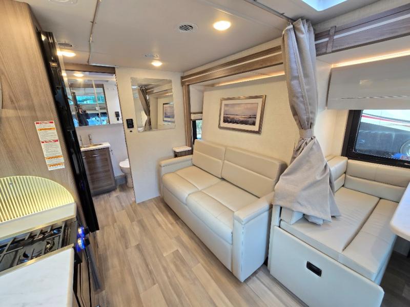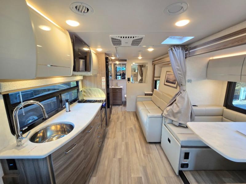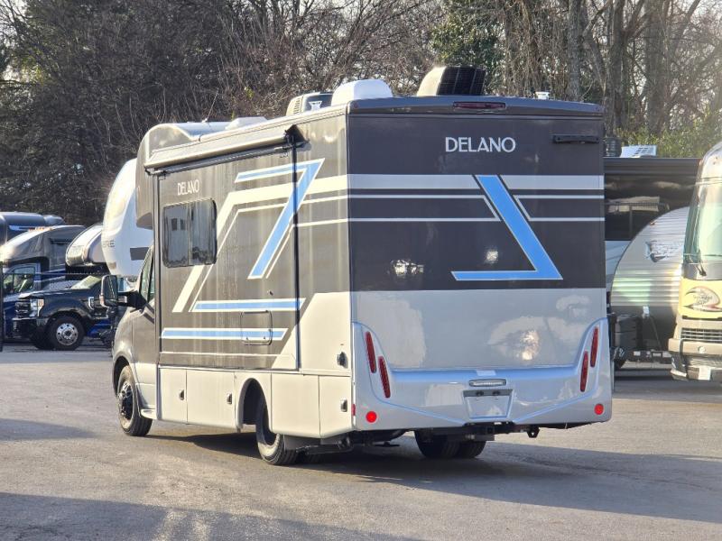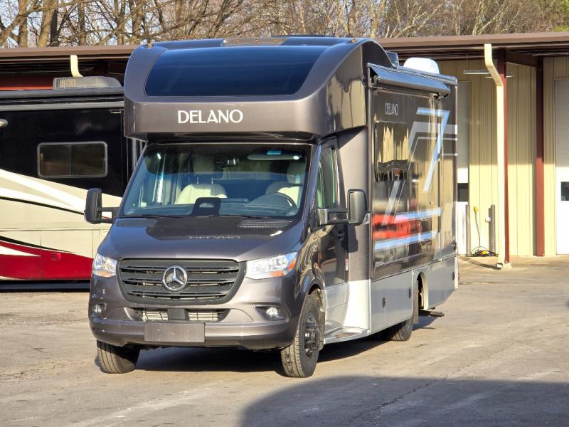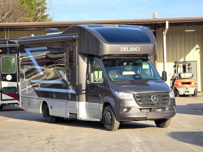 Luxury comes standard in the Delano Sprinter Class C diesel motorhomes by Thor Motor Coach. You will find it so easy to maneuver the road with the Mercedes-Benz Safety package that includes features such as active braking assist and distance regulator distronic plus that will help keep a safe distance from vehicles in front of you, and you can add the optional blind spot detection system for even more convenience. The frameless windows and the full-body paint package with gel coated sidewalls is sure to be eye-catching, plus there is invisible front paint protection for added defense against the elements. Each model includes the Rapid Camp+ multiplex wiring control system that will make set-up easier than ever, a Winegard ConnecT 2.0 WiFi/4G/TV antenna to keep you connected to the outside world, and premium one-piece Crossflex roofing material that is ultra durable. The Delano Sprinter also includes many interior comforts, like the easy-to-clean residential vinyl flooring, the Euro-style cabinetry, and the Leatherette furniture!
