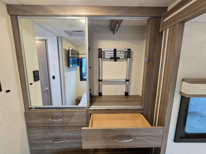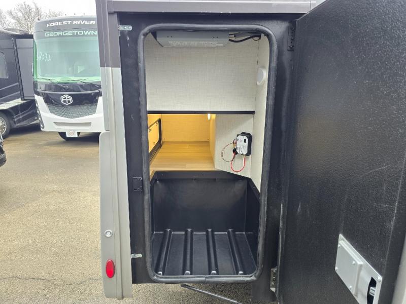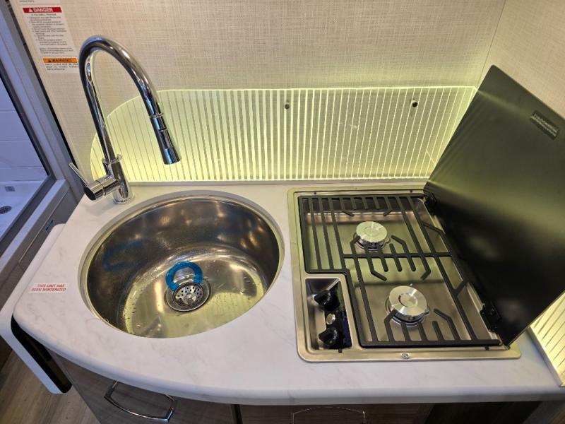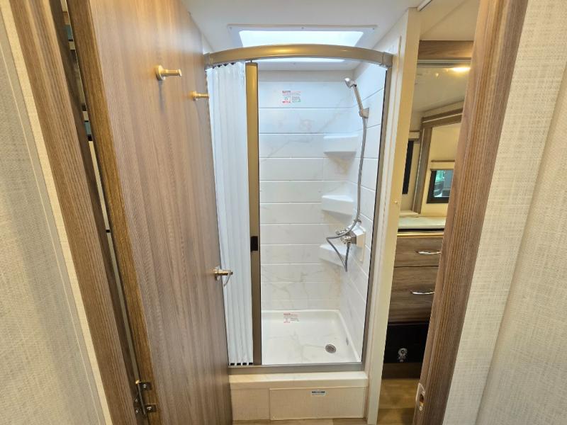 You'll enjoy every minute spent in this double slide out coach that can sleep up to five each night. The main living area is made spacious thanks to the dinette slide out, and there is theater seating across from the 39" mid-ship Smart TV to watch your favorite shows. A cab-over bunk features a built-in skylight for star gazing at night, and the rear private bedroom will feel just like home. Here, you'll enjoy the flip-up full-size bed within the slide out, plus a 32" Smart TV and a wardrobe to keep your things tidy. There is a private toilet and sink across the hall from the 24" x 32" shower so two people can freshen up at once; how convenient! In the morning, prepare breakfast on the two burner gas cooktop, and the flip-up countertop will provide more space to cut fresh fruit!