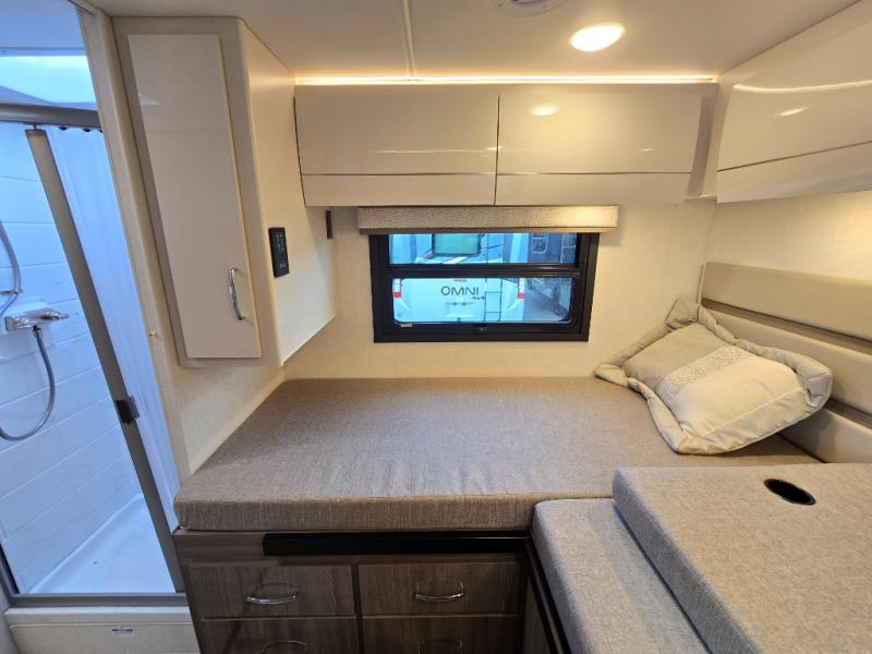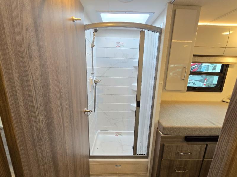 Experience a comfortable road trip in this motorhome! You will get a good night's rest on the two rear twin 31" x 76" beds that can convert into a king-size bed with a privacy curtain and two closets to store your clothes. After a long day of traveling, rinse the day off in the 24" x 32" shower while another uses the private toilet and sink. Fill your bellies with delicious home cooked meals with the two burner cooktop, then enjoy them at the theater seating with removable table. There is extra sleeping space with the 30" x 80" bunk over cab and the built-in skylight above it adds extra natural lighting!