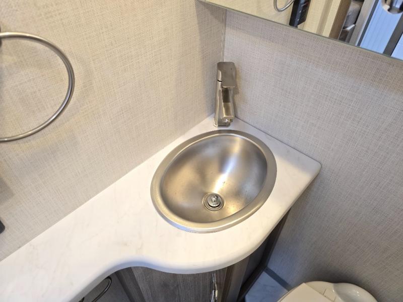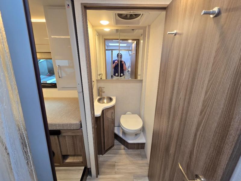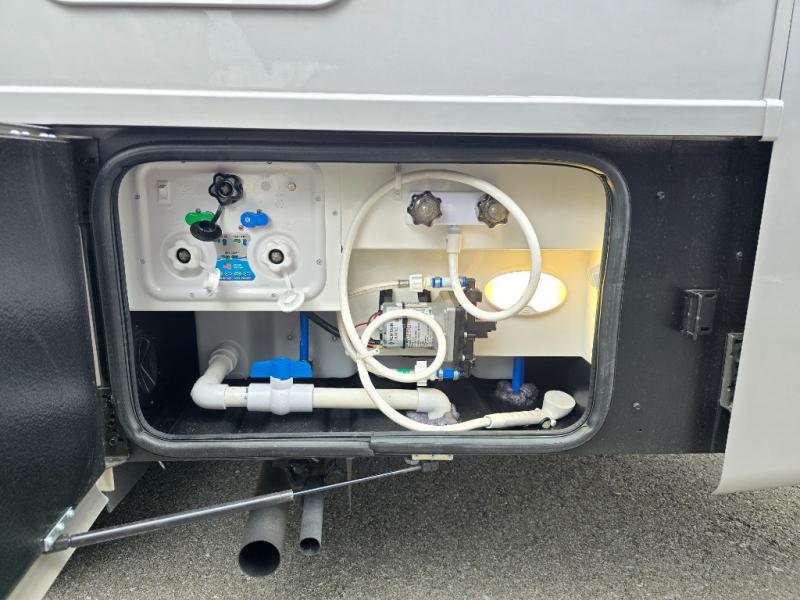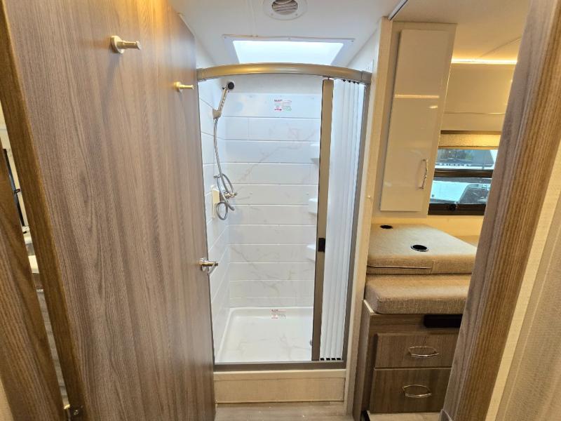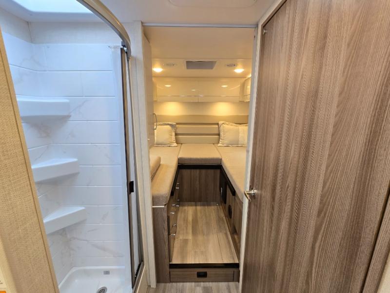 Experience a comfortable road trip in this motorhome! You will get a good night's rest on the two rear twin 31" x 76" beds that can convert into a king-size bed with a privacy curtain and two closets to store your clothes. After a long day of traveling, rinse the day off in the 24" x 32" shower while another uses the private toilet and sink. Fill your bellies with delicious home cooked meals with the two burner cooktop, then enjoy them at the theater seating with removable table. There is extra sleeping space with the 30" x 80" bunk over cab and the built-in skylight above it adds extra natural lighting!