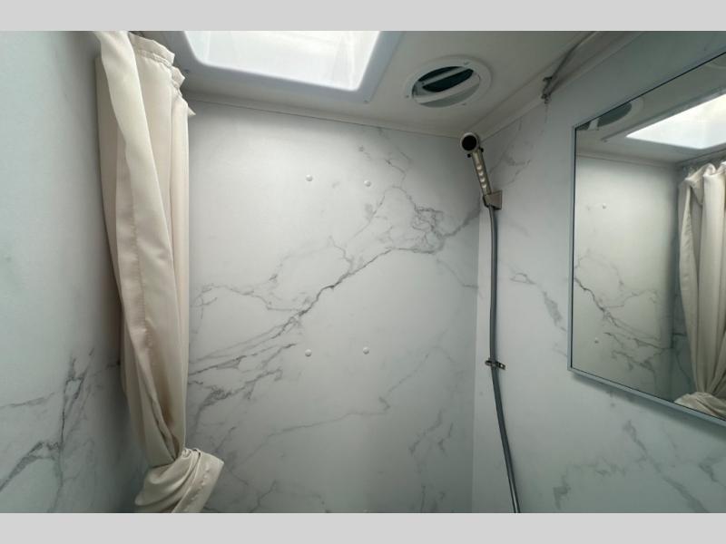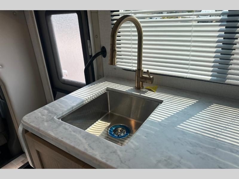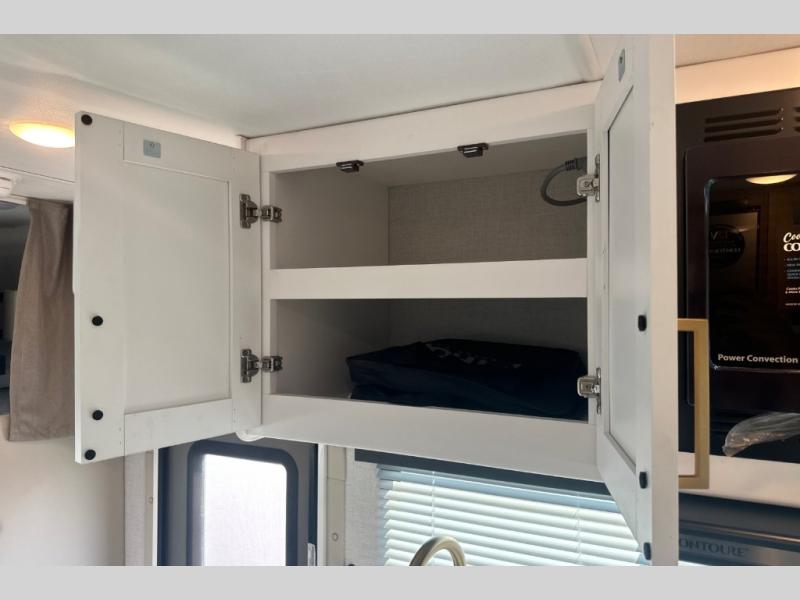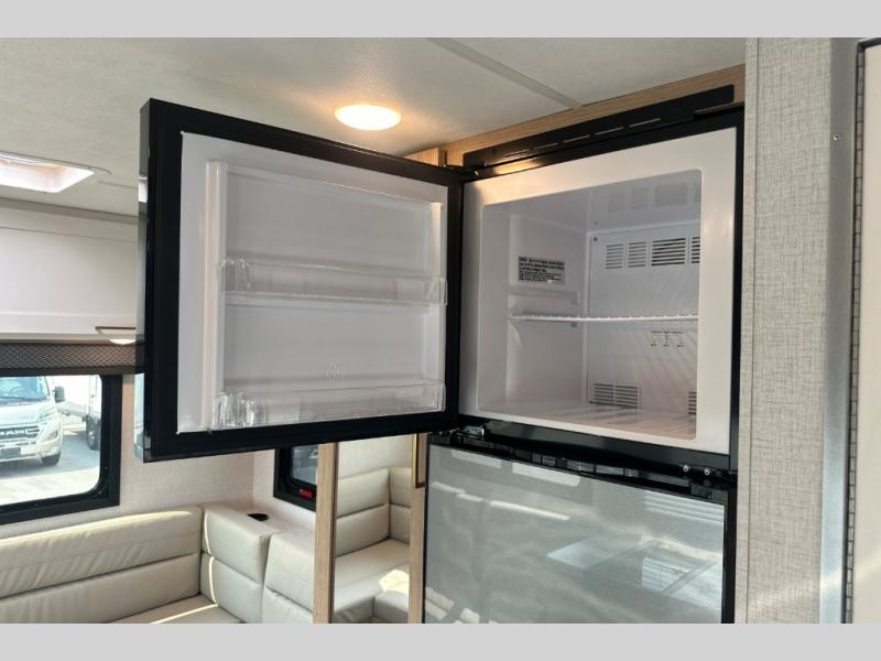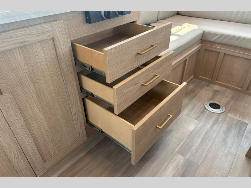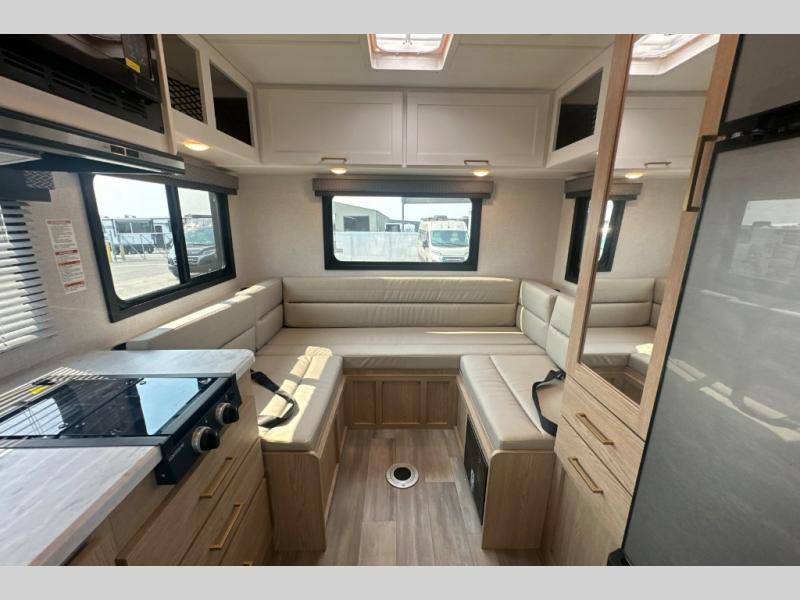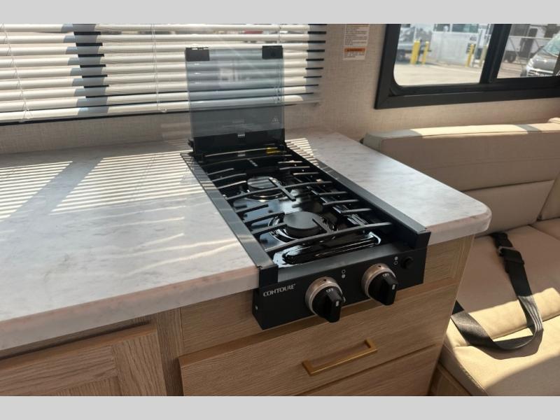 This compact, yet cozy coach is perfect for trips to the campground each weekend! Once you've reached your destination, you can set up the 11' power awning, unload the exterior storage compartments, and relax in your camp chairs. The two burner gas cooktop and convection microwave with an air fryer will let you make meals each day, and there is a 12V refrigerator to keep food fresh. A flip-up counter is another great feature that will give you more prep space! You can freshen up in the wet bath, grab your night clothes from the closet, then convert the U-shaped dinette into a 54" x 77" bed for a great night's rest!