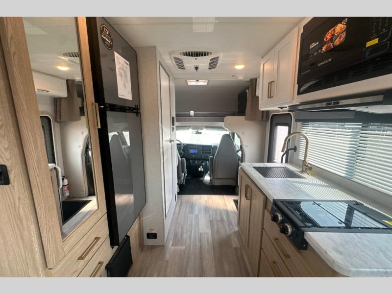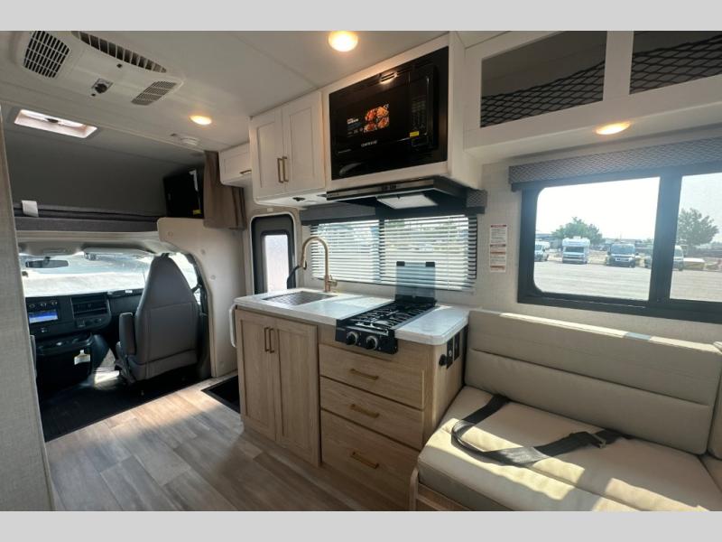 With any Four Winds ESpec Class C gas motorhome by Thor Motor Coach, you will find convenient amenities, a modern interior, and a reliable Ford E-Series chassis, with an optional Chevy chassis on select models to power your adventures. There is welded tubular aluminum roof and sidewall cage construction, a one-piece fiberglass front cap, and a one-piece domed roof membrane for added strength. Residential vinyl flooring will be easy to keep clean, and you'll love the sleek look of the Hampton Collection, two-toned cabinets. These motorhomes also include a 50 state 4.0 kW dual gas/LP generator and a 30-amp shoreline power cord to keep you going, along with a tankless water heater and 13,500 roof front A/C to ensure your comfort!