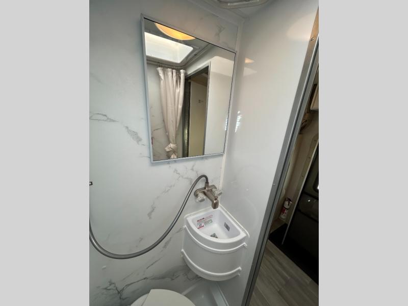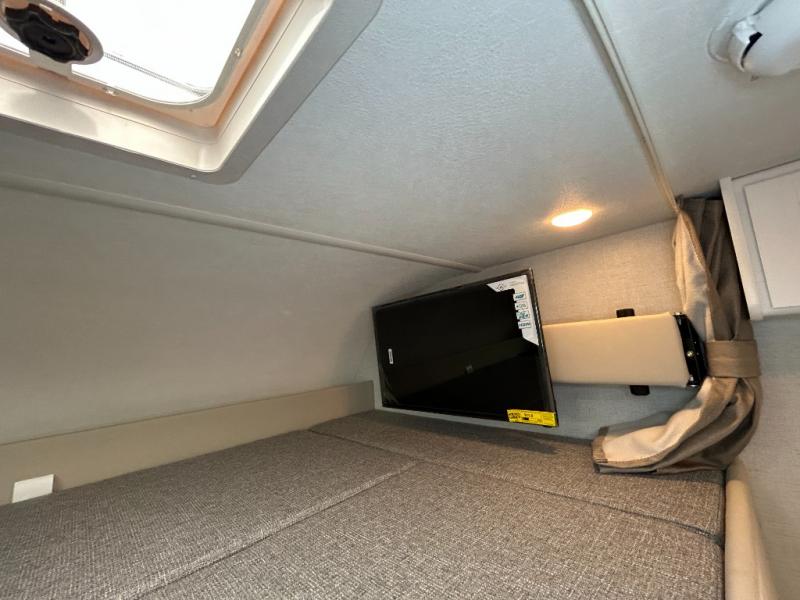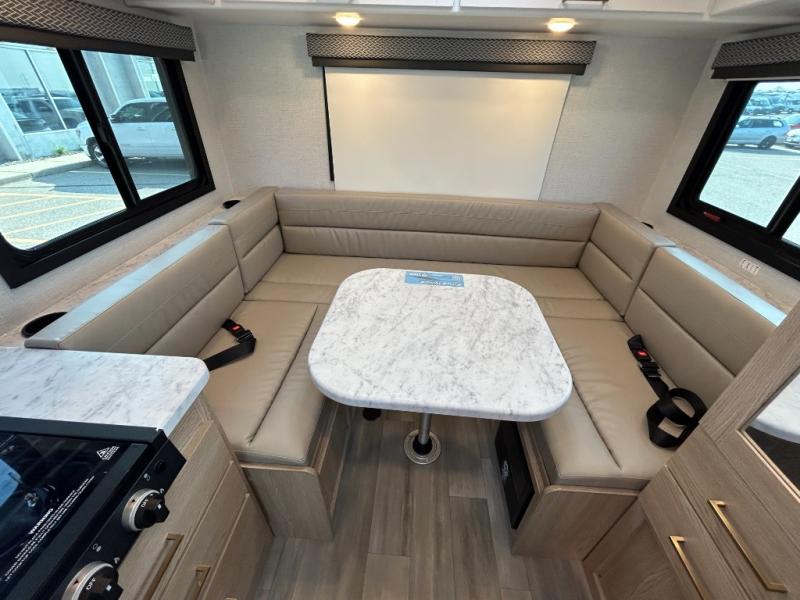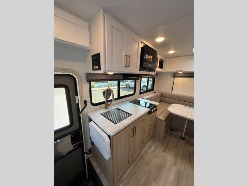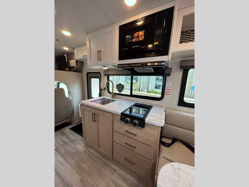 This compact, yet cozy coach is perfect for trips to the campground each weekend! Once you've reached your destination, you can set up the 11' power awning, unload the exterior storage compartments, and relax in your camp chairs. The two burner gas cooktop and convection microwave with an air fryer will let you make meals each day, and there is a 12V refrigerator to keep food fresh. A flip-up counter is another great feature that will give you more prep space! You can freshen up in the wet bath, grab your night clothes from the closet, then convert the U-shaped dinette into a 54" x 77" bed for a great night's rest!