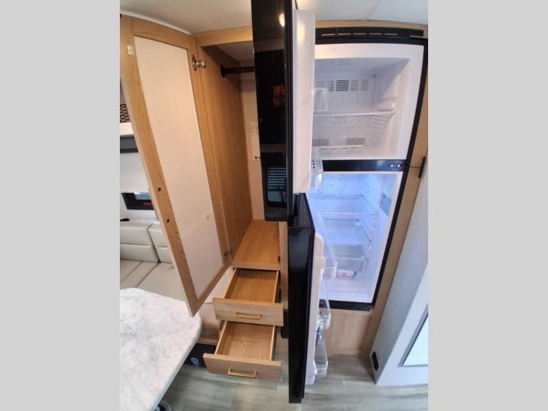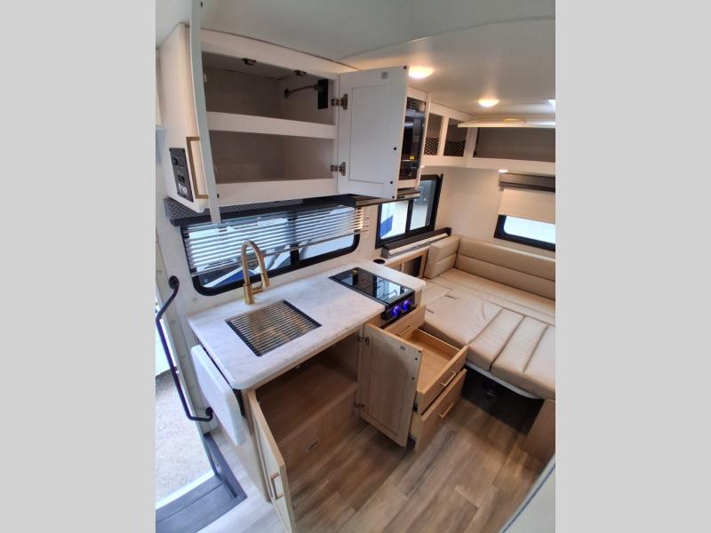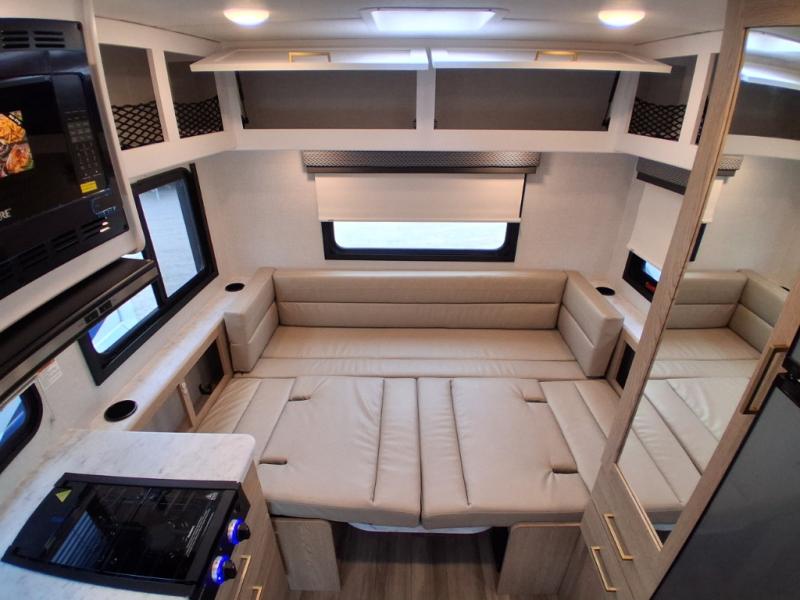 This compact, yet cozy coach is perfect for trips to the campground each weekend! Once you've reached your destination, you can set up the 11' power awning, unload the exterior storage compartments, and relax in your camp chairs. The two burner gas cooktop and convection microwave with an air fryer will let you make meals each day, and there is a 12V refrigerator to keep food fresh. A flip-up counter is another great feature that will give you more prep space! You can freshen up in the wet bath, grab your night clothes from the closet, then convert the U-shaped dinette into a 54" x 77" bed for a great night's rest!