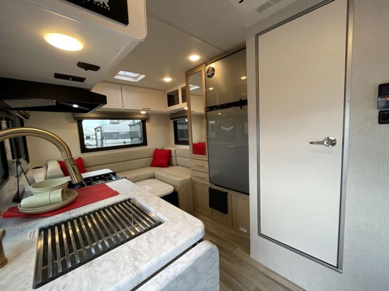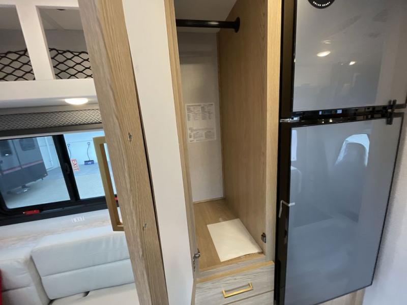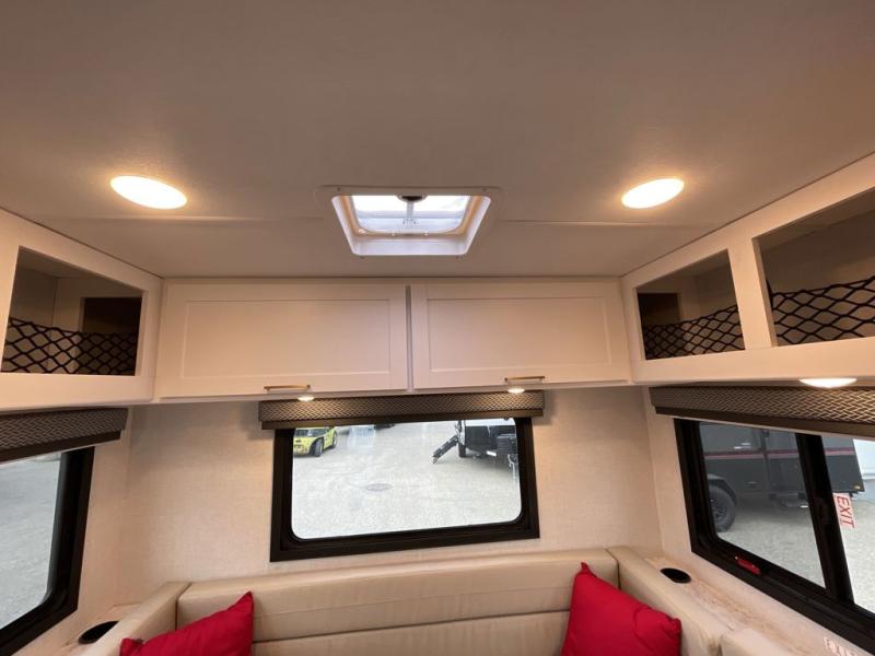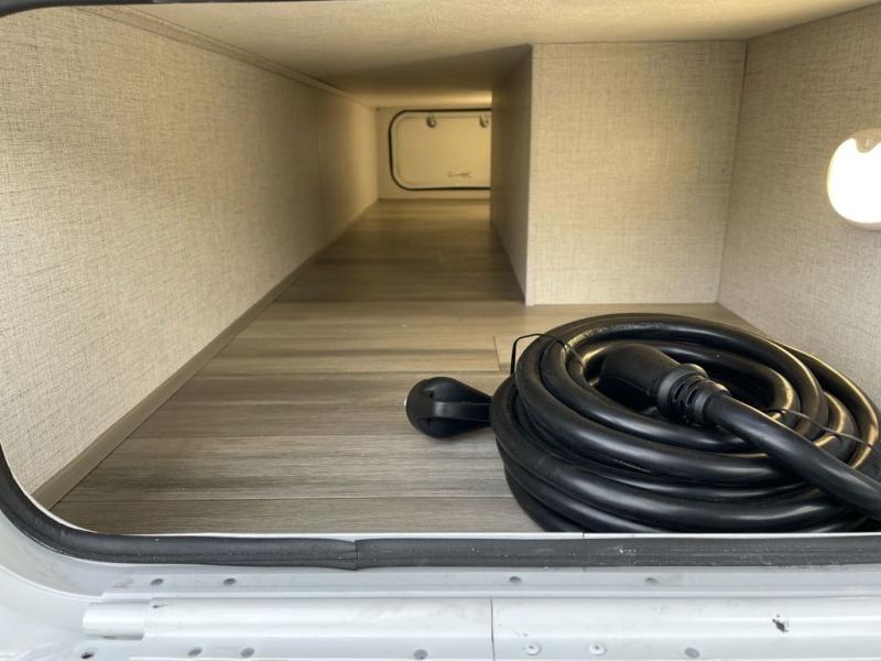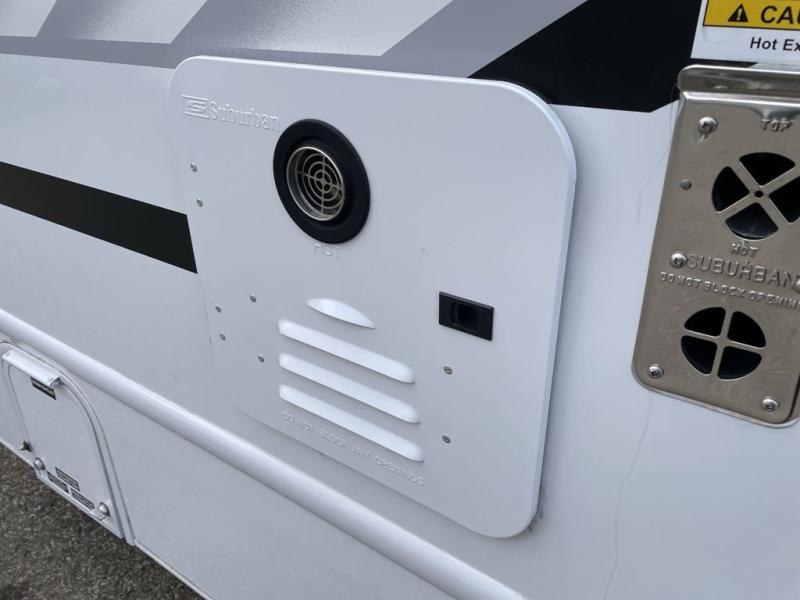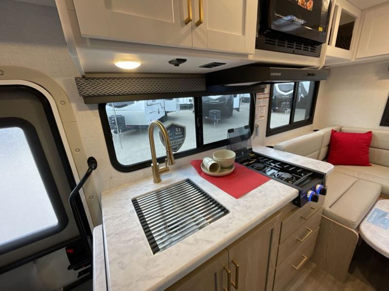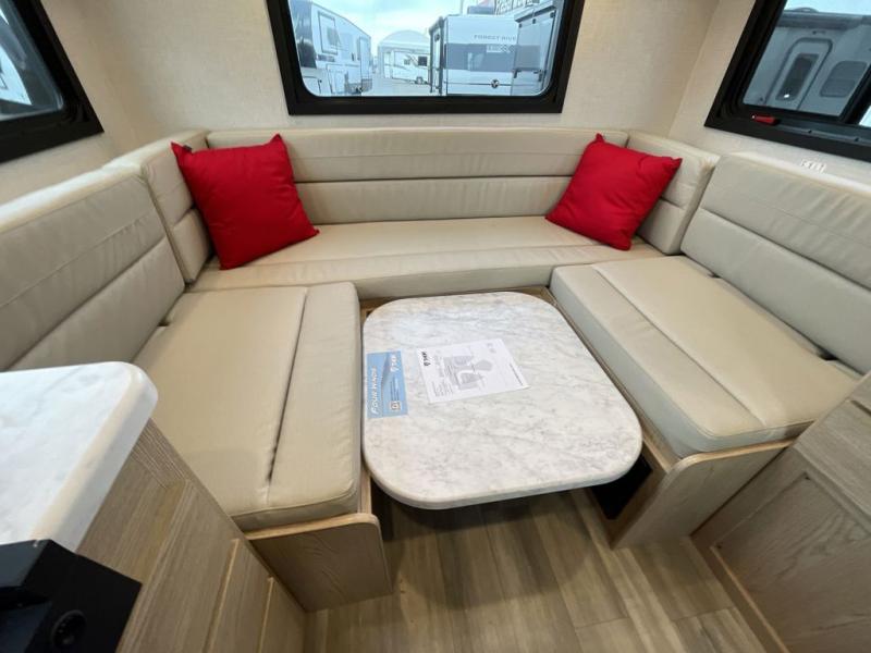 This compact, yet cozy coach is perfect for trips to the campground each weekend! Once you've reached your destination, you can set up the 11' power awning, unload the exterior storage compartments, and relax in your camp chairs. The two burner gas cooktop and convection microwave with an air fryer will let you make meals each day, and there is a 12V refrigerator to keep food fresh. A flip-up counter is another great feature that will give you more prep space! You can freshen up in the wet bath, grab your night clothes from the closet, then convert the U-shaped dinette into a 54" x 77" bed for a great night's rest!