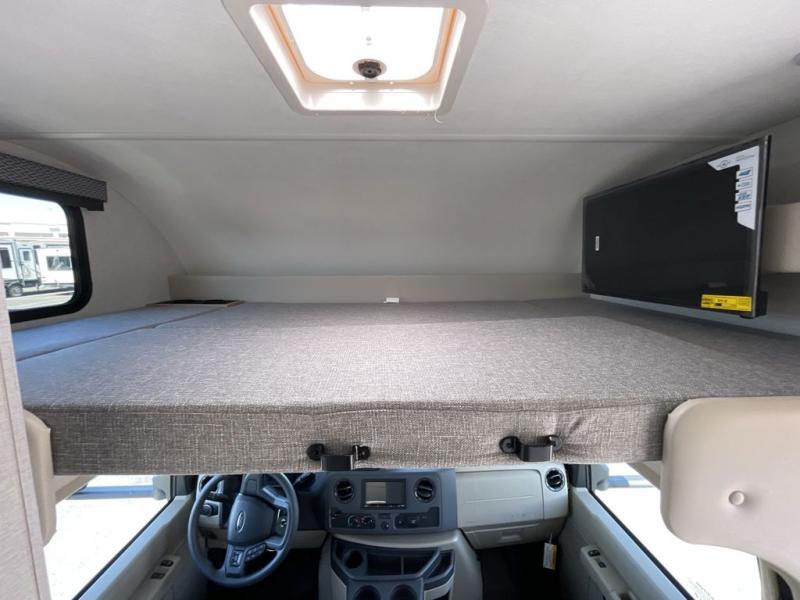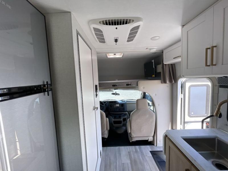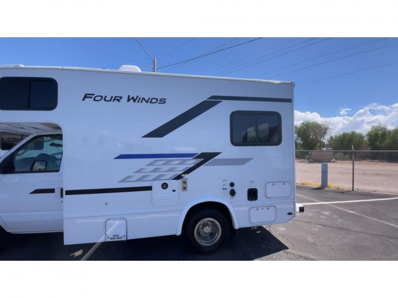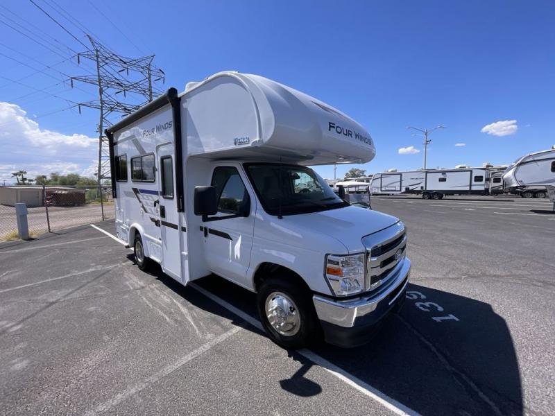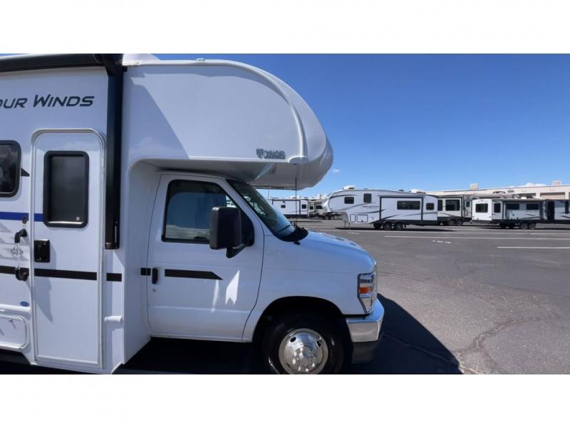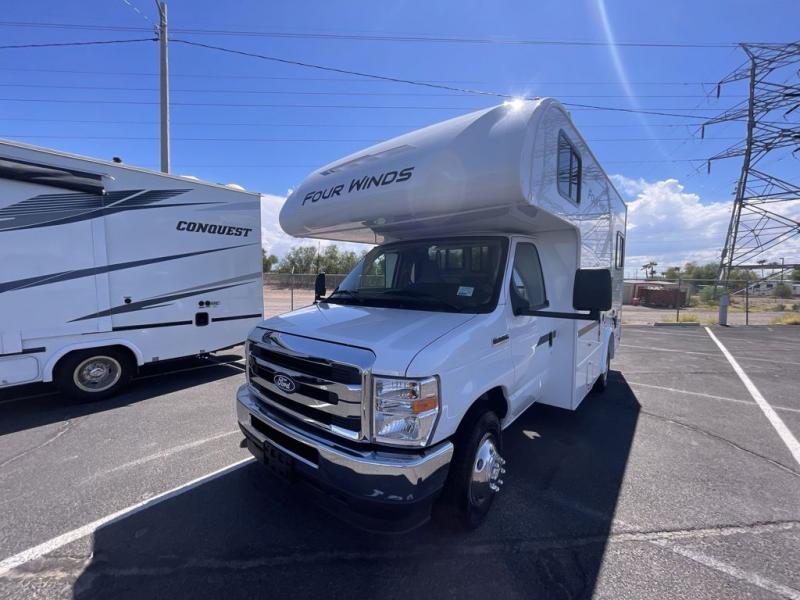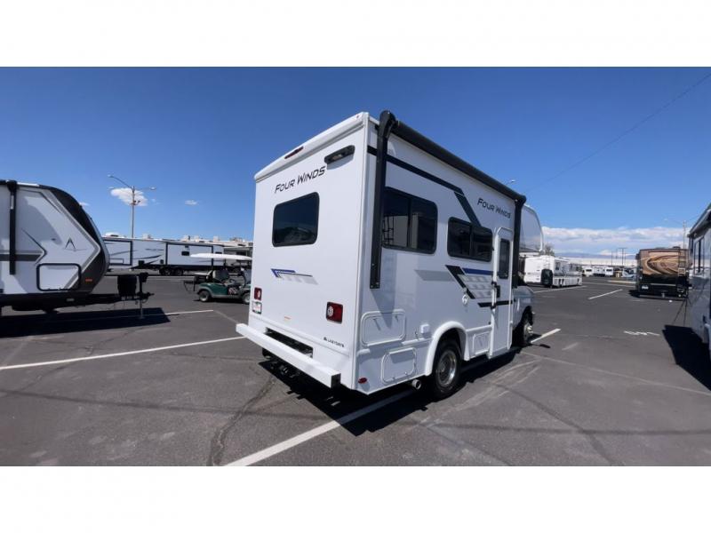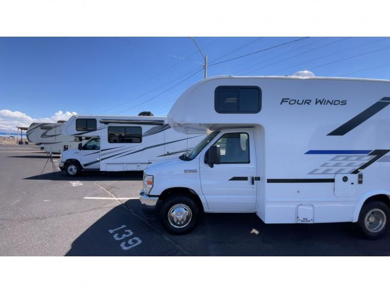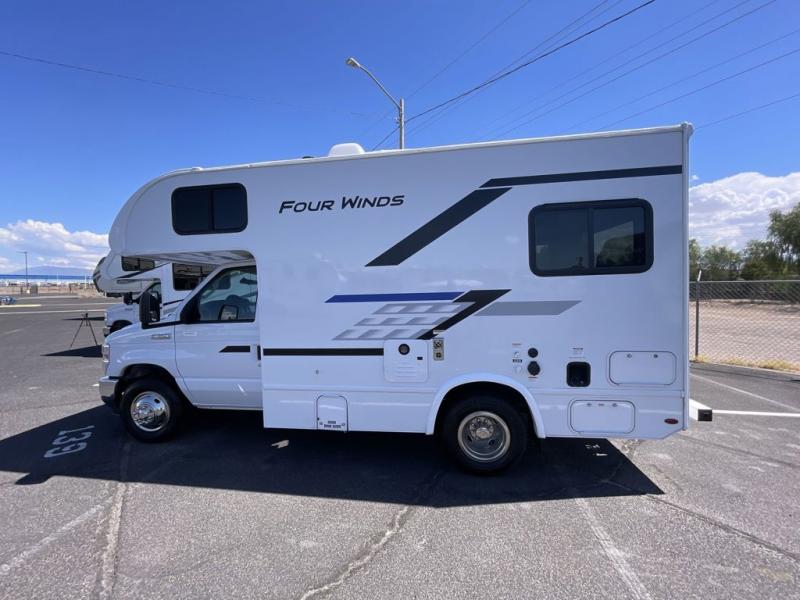 With any Four Winds ESpec Class C gas motorhome by Thor Motor Coach, you will find convenient amenities, a modern interior, and a reliable Ford E-Series chassis, with an optional Chevy chassis on select models to power your adventures. There is welded tubular aluminum roof and sidewall cage construction, a one-piece fiberglass front cap, and a one-piece domed roof membrane for added strength. Residential vinyl flooring will be easy to keep clean, and you'll love the sleek look of the Hampton Collection, two-toned cabinets. These motorhomes also include a 50 state 4.0 kW dual gas/LP generator and a 30-amp shoreline power cord to keep you going, along with a tankless water heater and 13,500 roof front A/C to ensure your comfort!