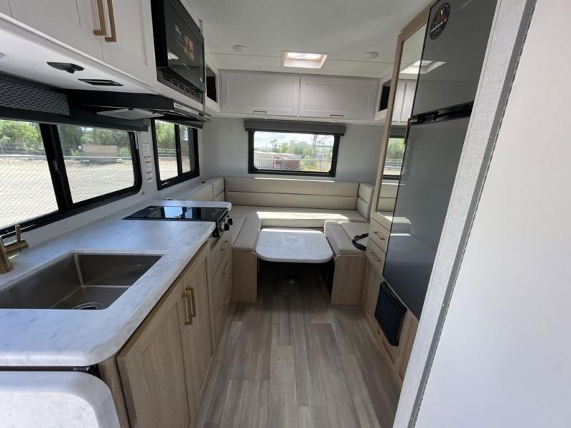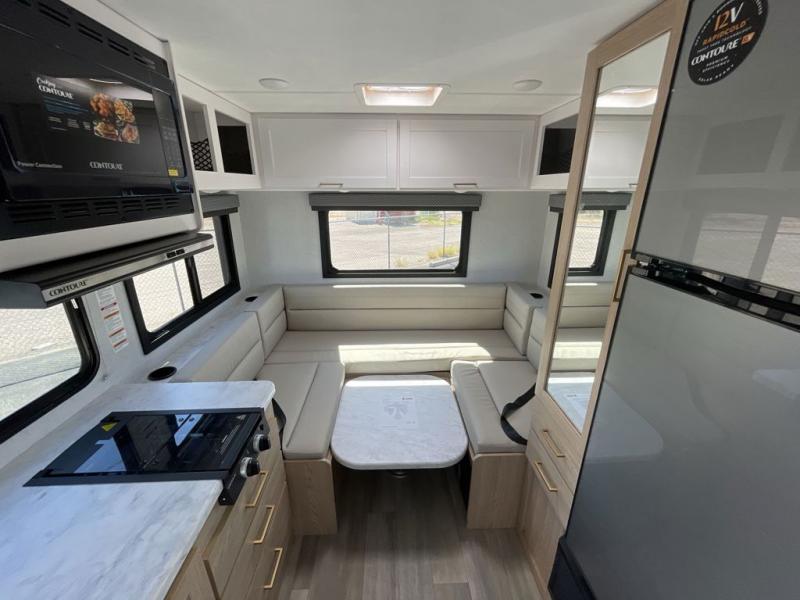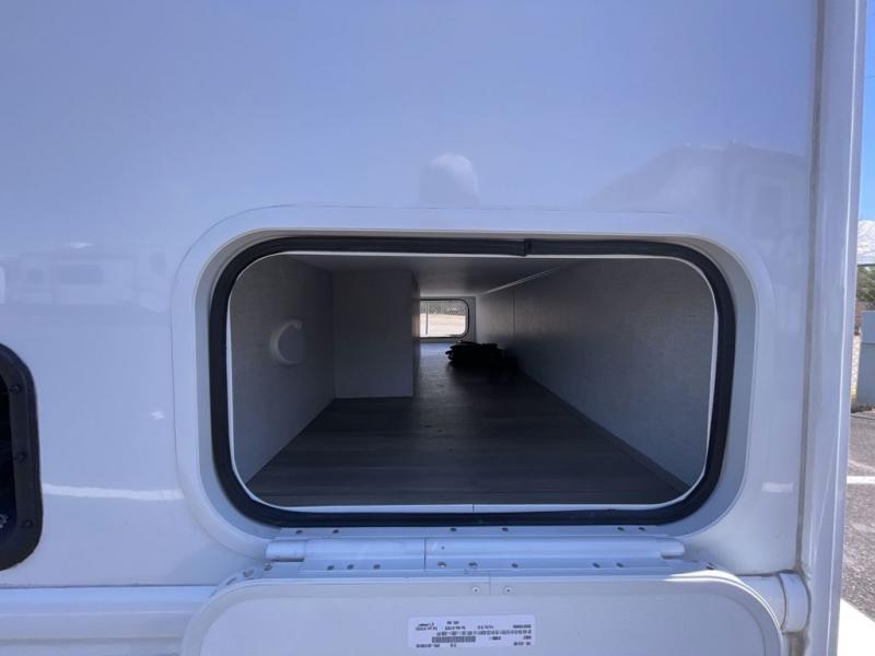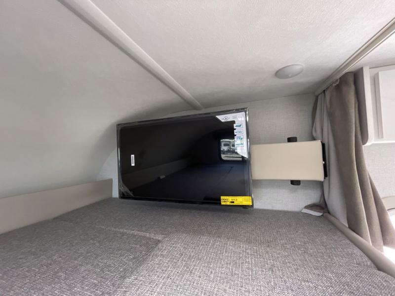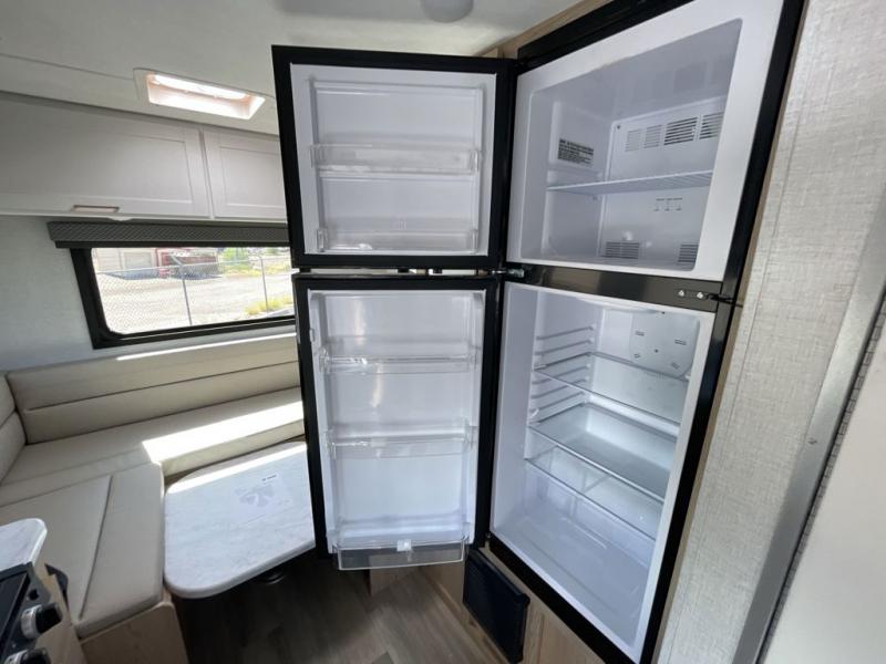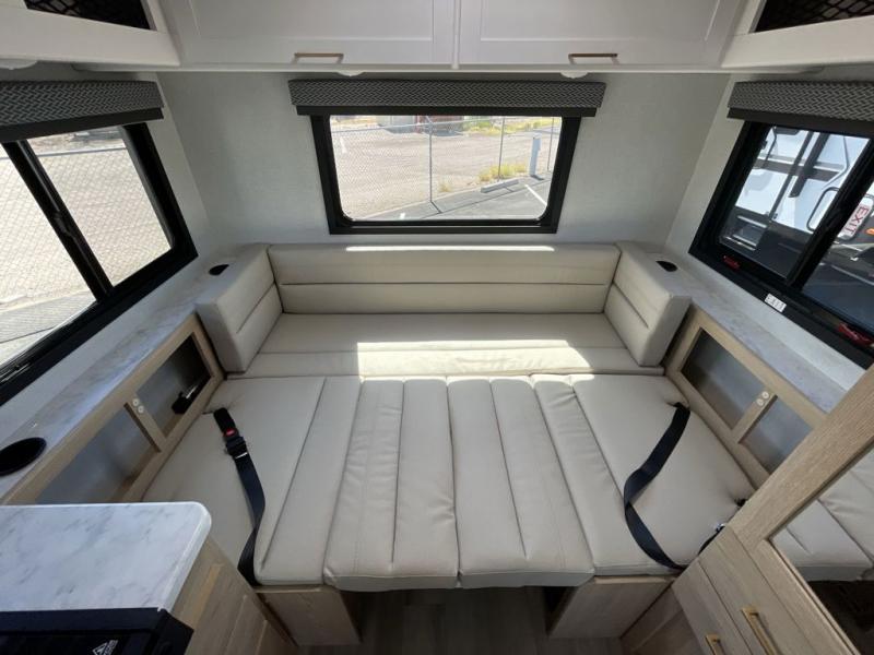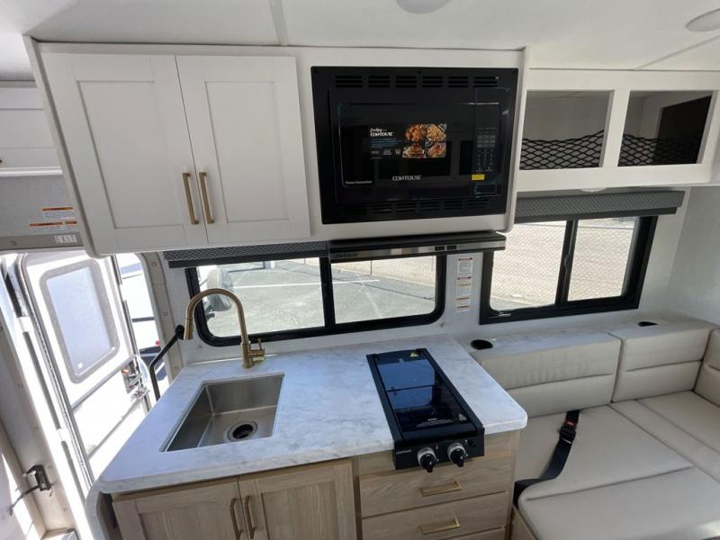 This compact, yet cozy coach is perfect for trips to the campground each weekend! Once you've reached your destination, you can set up the 11' power awning, unload the exterior storage compartments, and relax in your camp chairs. The two burner gas cooktop and convection microwave with an air fryer will let you make meals each day, and there is a 12V refrigerator to keep food fresh. A flip-up counter is another great feature that will give you more prep space! You can freshen up in the wet bath, grab your night clothes from the closet, then convert the U-shaped dinette into a 54" x 77" bed for a great night's rest!