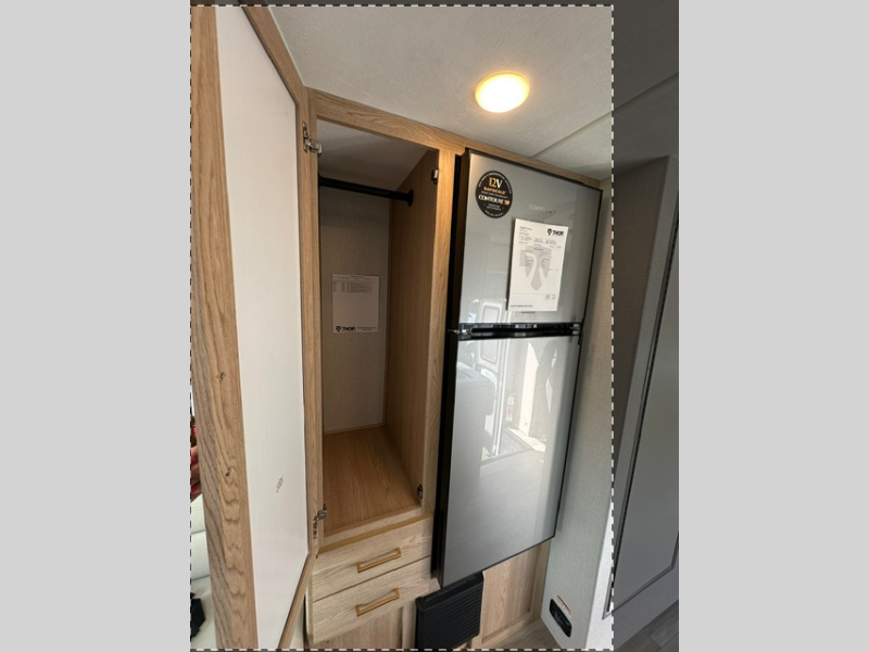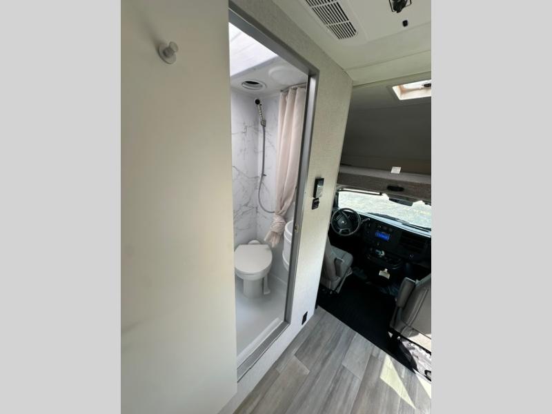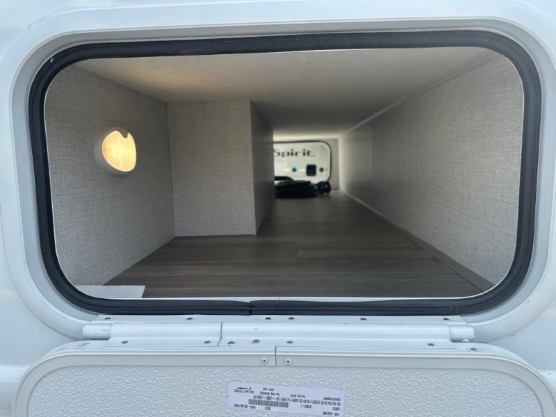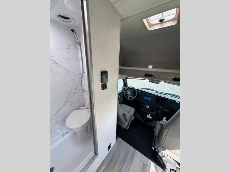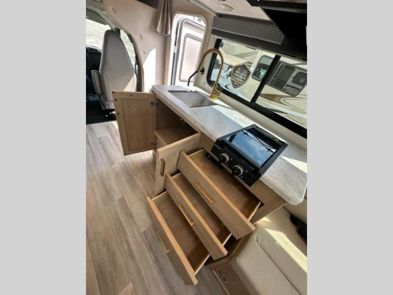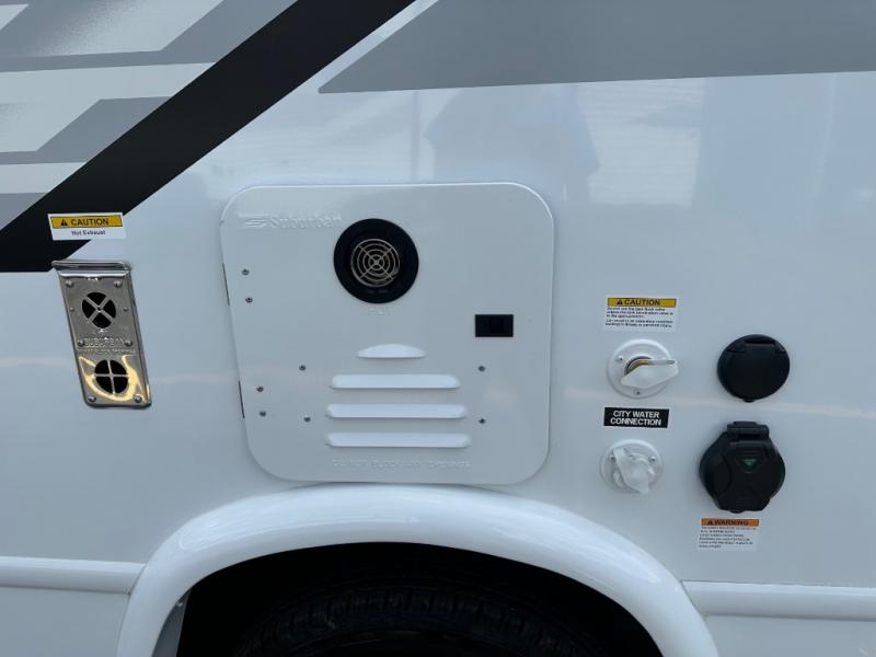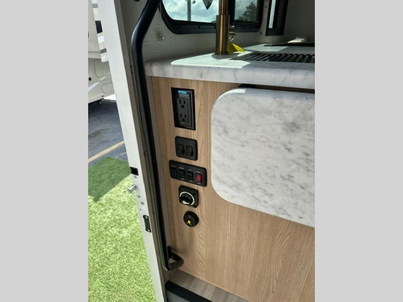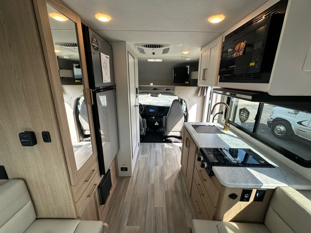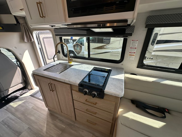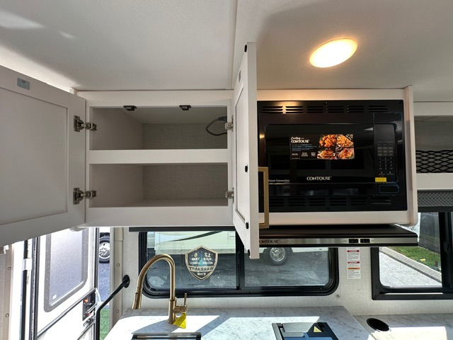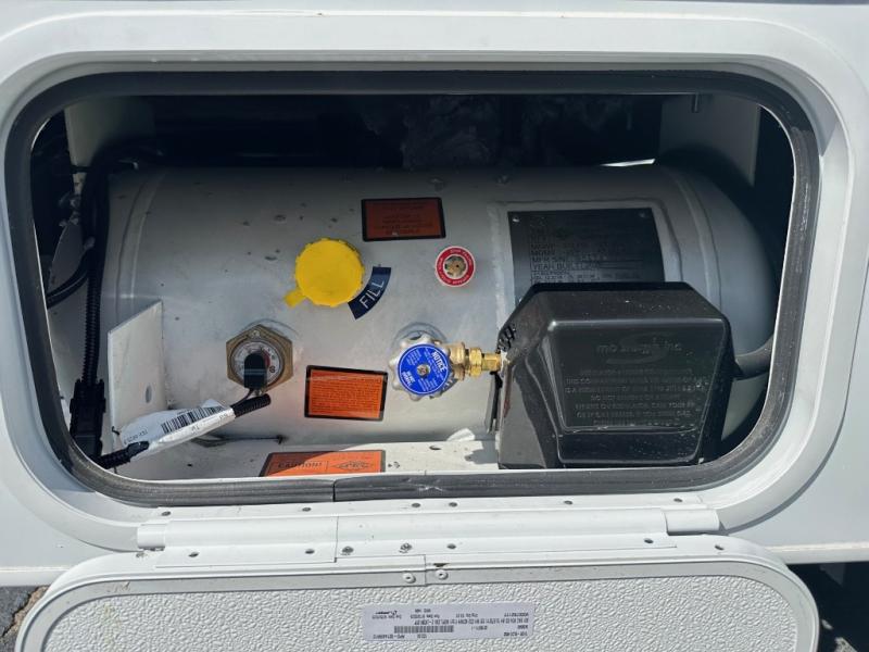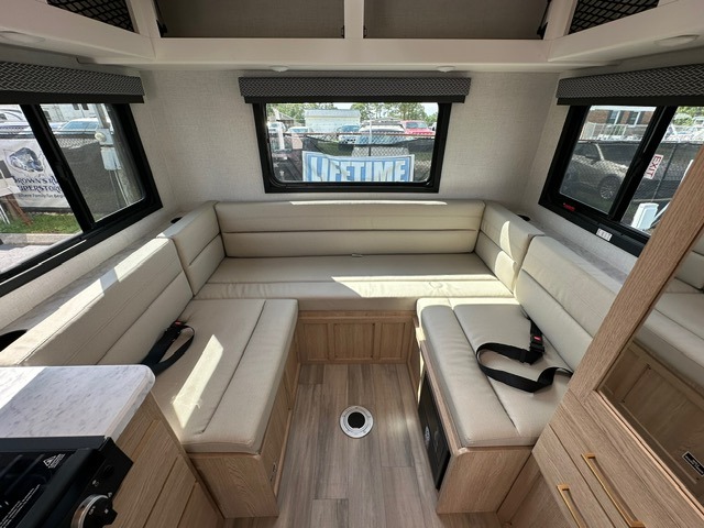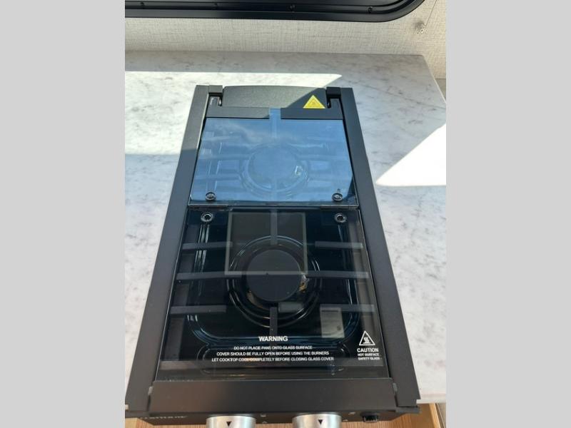 This compact, yet cozy coach is perfect for trips to the campground each weekend! Once you've reached your destination, you can set up the 11' power awning, unload the exterior storage compartments, and relax in your camp chairs. The two burner gas cooktop and convection microwave with an air fryer will let you make meals each day, and there is a 12V refrigerator to keep food fresh. A flip-up counter is another great feature that will give you more prep space! You can freshen up in the wet bath, grab your night clothes from the closet, then convert the U-shaped dinette into a 54" x 77" bed for a great night's rest!