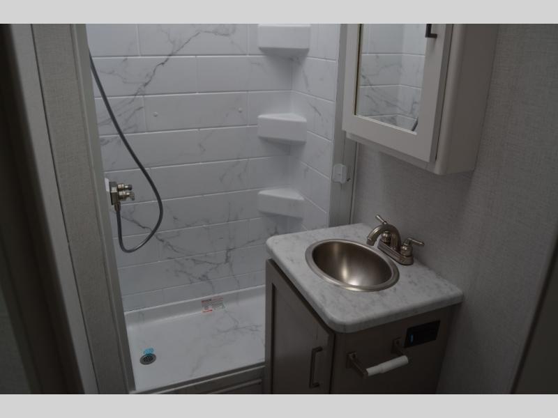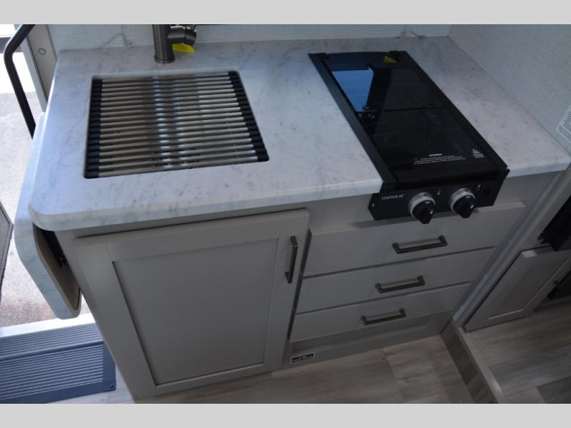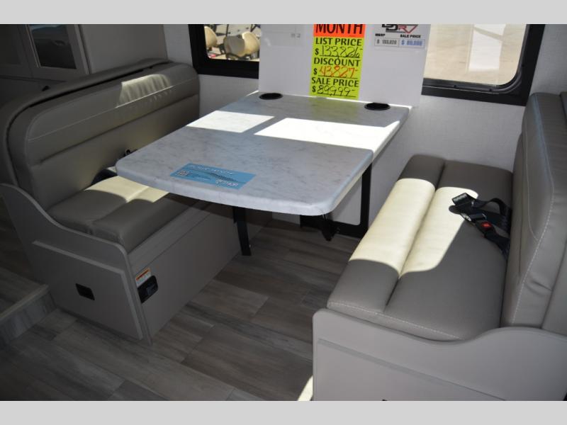 It won't be hard to find comfort in this coach for five! You can freshen up in the rear corner full bath once you've set up camp, then make lunch on the two burner gas cooktop or convection microwave with an air fryer. There is also a 12V refrigerator for cold items and a flip-up countertop for more space. Whether you dine at the Dream Dinette or take your plate outdoors under the 15' power awning, you're sure to have a great time in this motorhome. The rear corner full-size bed will provide a comfy place to rest your head at night, while your guests take the dinette and cab-over bunk!
