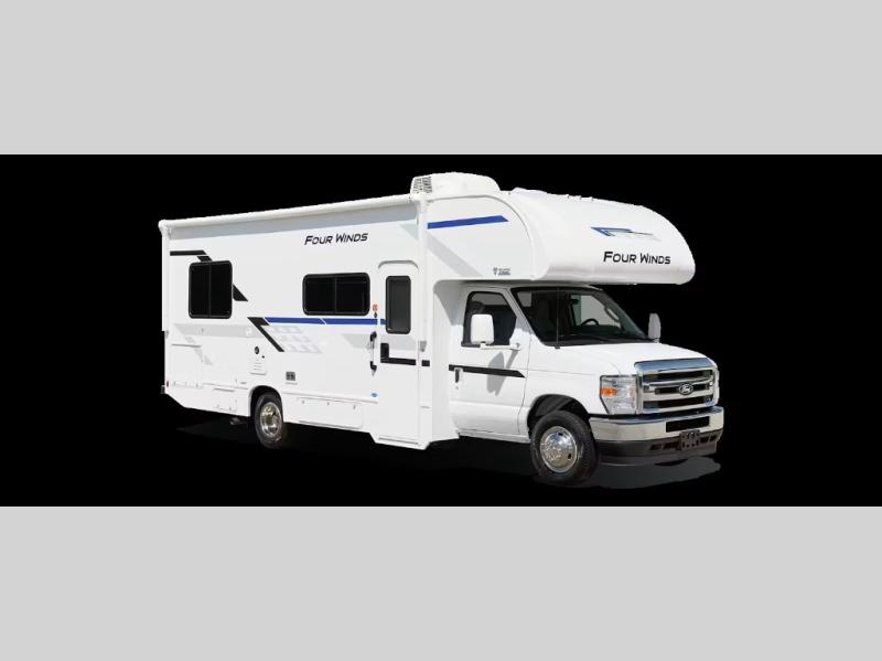 With any Four Winds ESpec Class C gas motorhome by Thor Motor Coach, you will find convenient amenities, a modern interior, and a reliable Ford E-Series chassis, with an optional Chevy chassis on select models to power your adventures. There is welded tubular aluminum roof and sidewall cage construction, a one-piece fiberglass front cap, and a one-piece domed roof membrane for added strength. Residential vinyl flooring will be easy to keep clean, and you'll love the sleek look of the Hampton Collection, two-toned cabinets. These motorhomes also include a 50 state 4.0 kW dual gas/LP generator and a 30-amp shoreline power cord to keep you going, along with a tankless water heater and 13,500 roof front A/C to ensure your comfort!