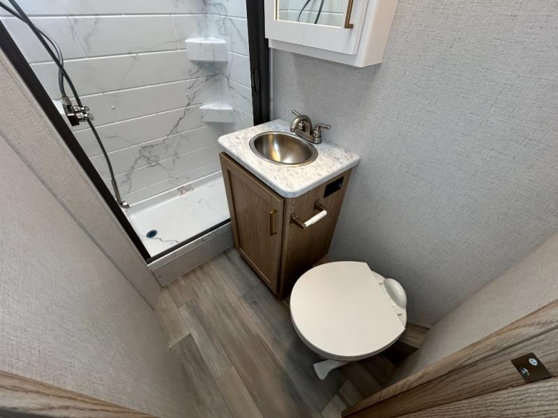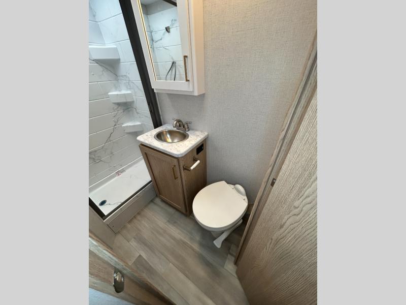 It won't be hard to find comfort in this coach for five! You can freshen up in the rear corner full bath once you've set up camp, then make lunch on the two burner gas cooktop or convection microwave with an air fryer. There is also a 12V refrigerator for cold items and a flip-up countertop for more space. Whether you dine at the Dream Dinette or take your plate outdoors under the 15' power awning, you're sure to have a great time in this motorhome. The rear corner full-size bed will provide a comfy place to rest your head at night, while your guests take the dinette and cab-over bunk!