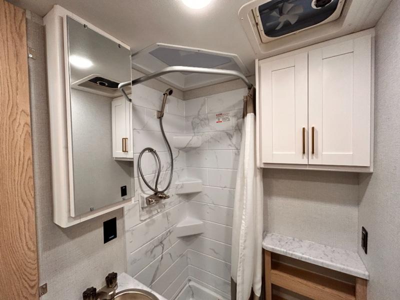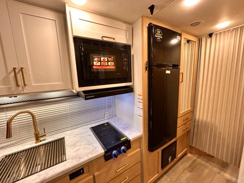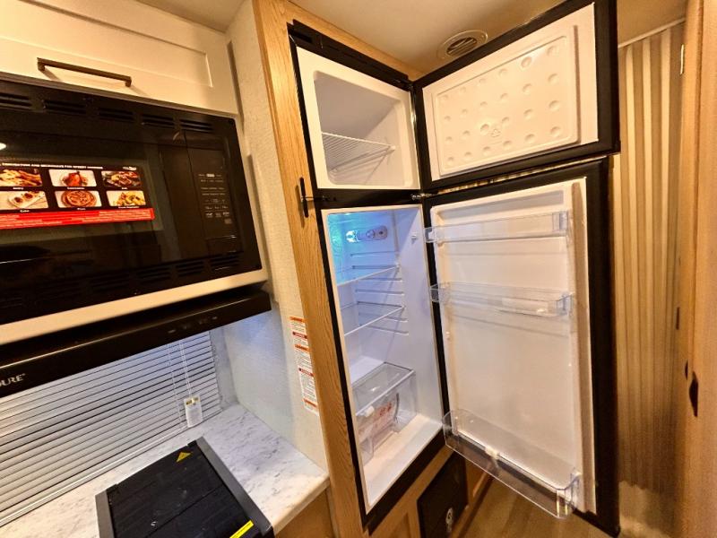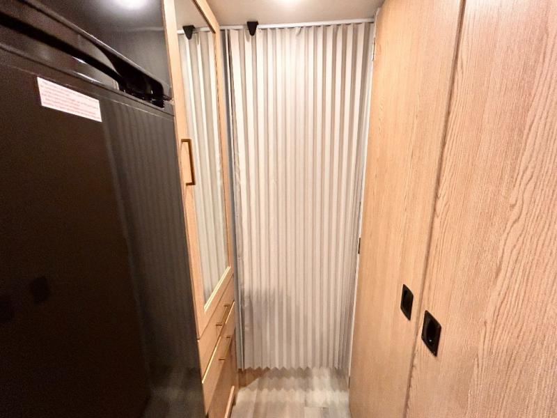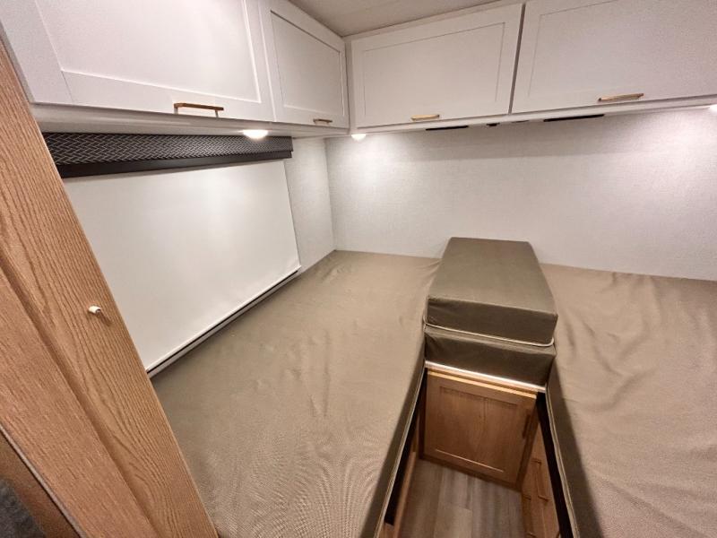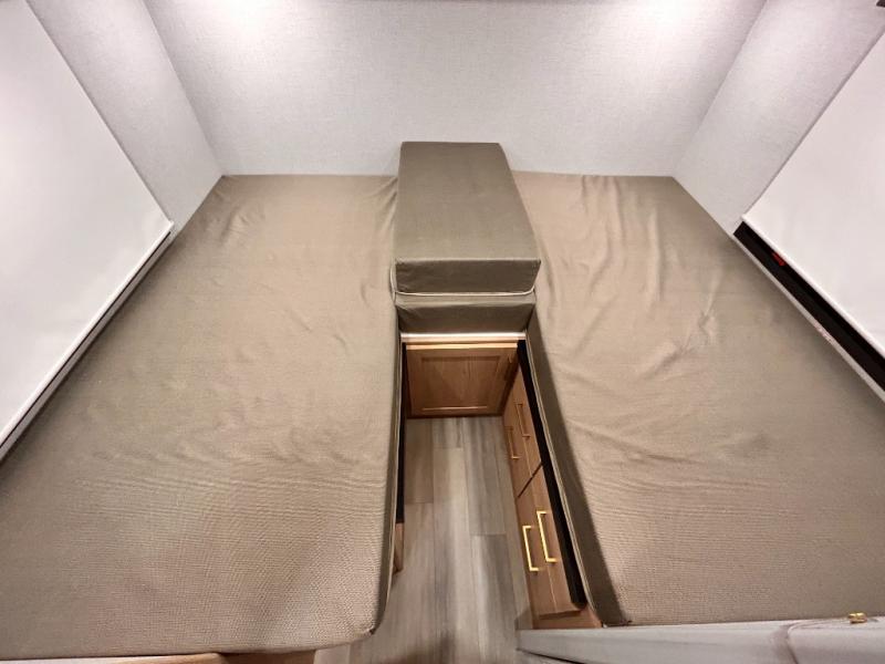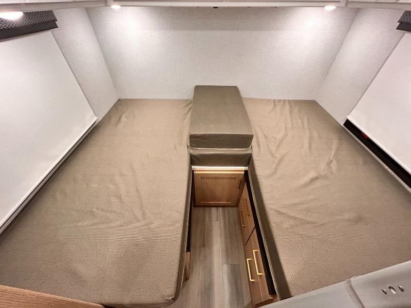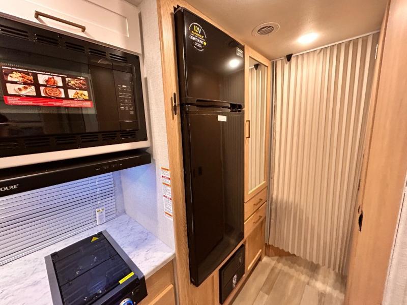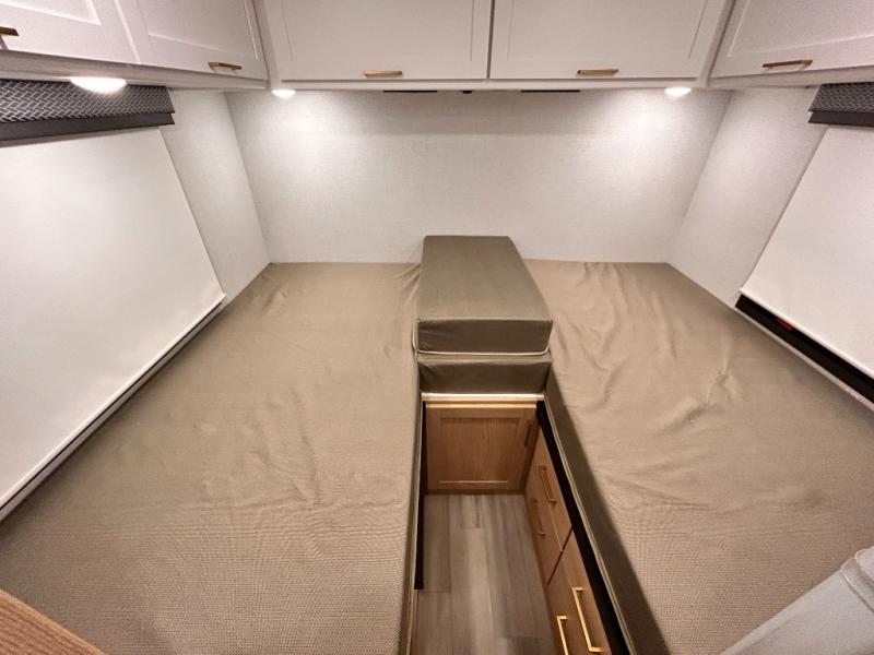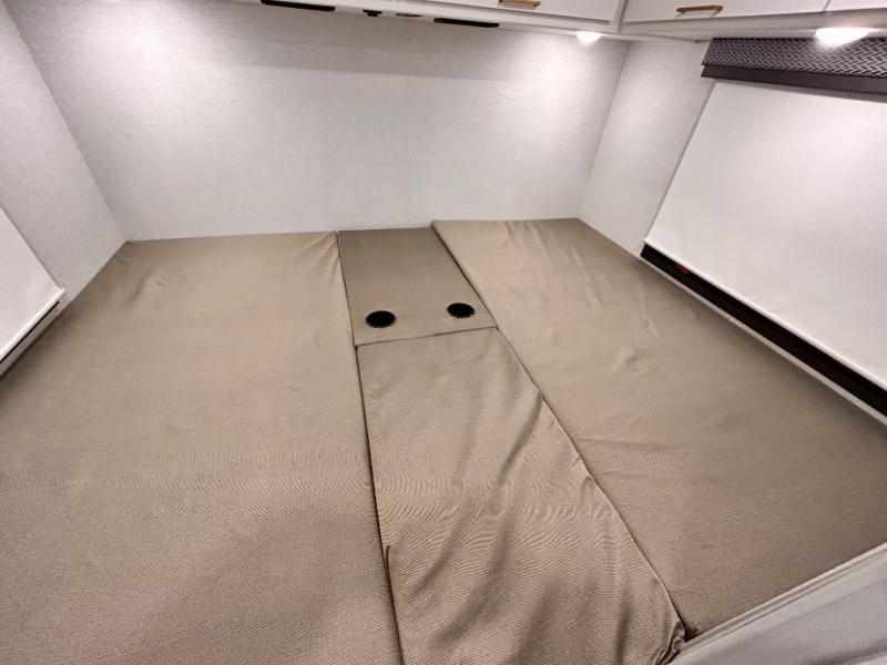 It won't be hard to find comfort in this coach for five! You can freshen up in the mid-coach full bath once you've set up camp, then make lunch on the two burner gas cooktop or convection microwave with an air fryer. There is also a 12V refrigerator for cold items and a flip-up countertop for more space. Whether you dine at the Dream Dinette slide out or take your plate outdoors under the 17' 6" power awning, you're sure to have a great time in this motorhome. The semi-private rear bedroom includes a privacy curtain, two twin beds with a king-size bed conversion, plus TV prep if you want the option to watch shows in bed. And any guests you may have can sleep on the dinette and 52" x 96" cab-over sleeping space!