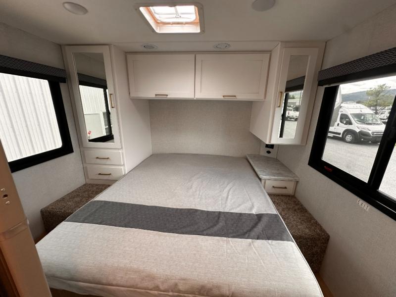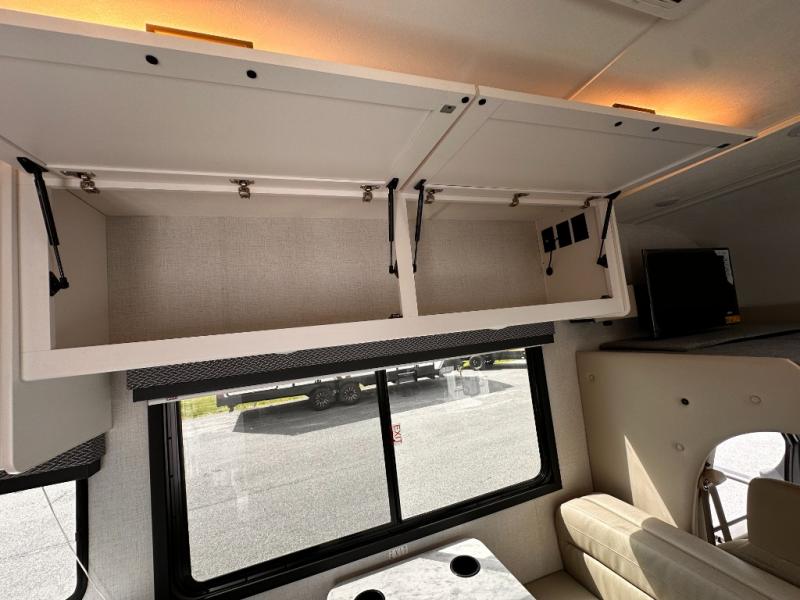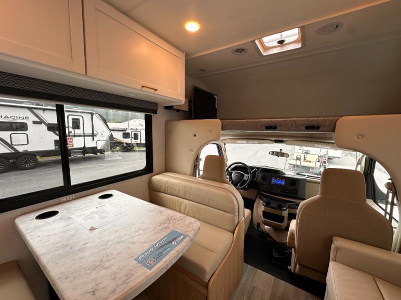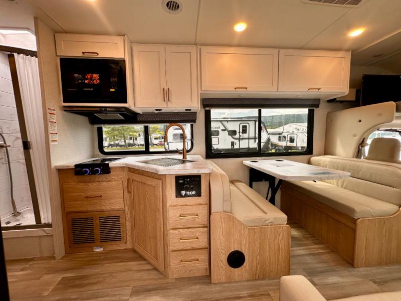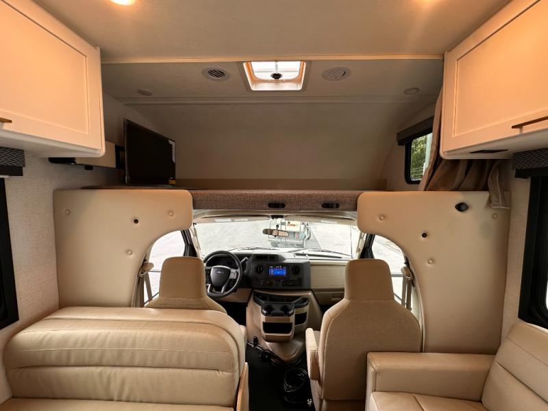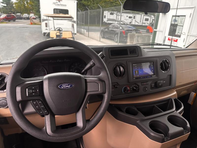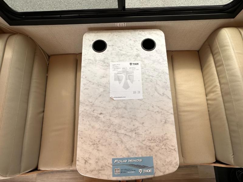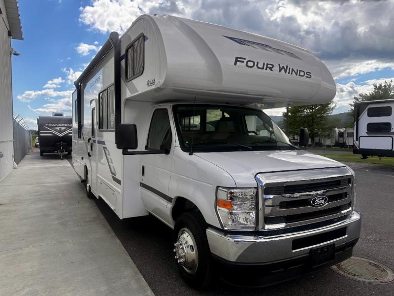 With any Four Winds ESpec Class C gas motorhome by Thor Motor Coach, you will find convenient amenities, a modern interior, and a reliable Ford E-Series chassis, with an optional Chevy chassis on select models to power your adventures. There is welded tubular aluminum roof and sidewall cage construction, a one-piece fiberglass front cap, and a one-piece domed roof membrane for added strength. Residential vinyl flooring will be easy to keep clean, and you'll love the sleek look of the Hampton Collection, two-toned cabinets. These motorhomes also include a 50 state 4.0 kW dual gas/LP generator and a 30-amp shoreline power cord to keep you going, along with a tankless water heater and 13,500 roof front A/C to ensure your comfort!