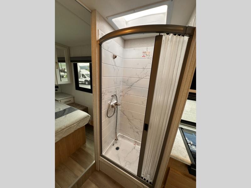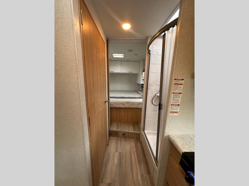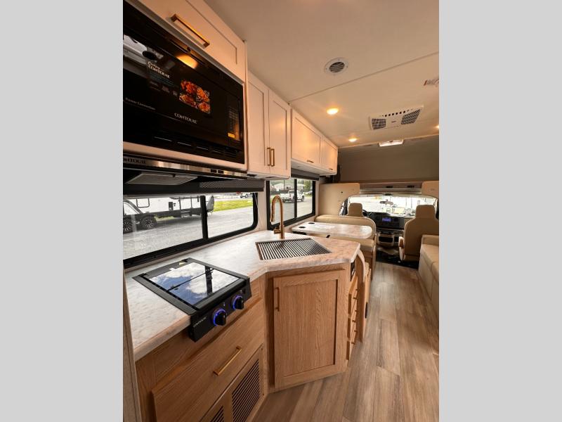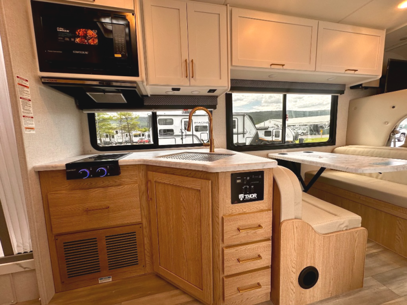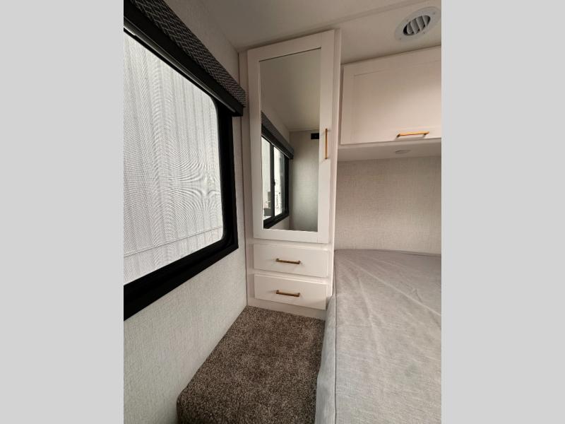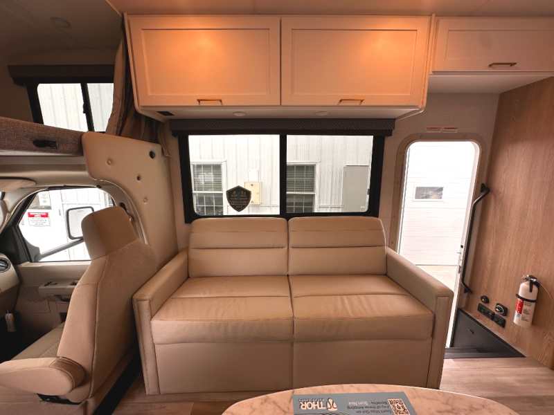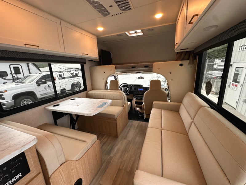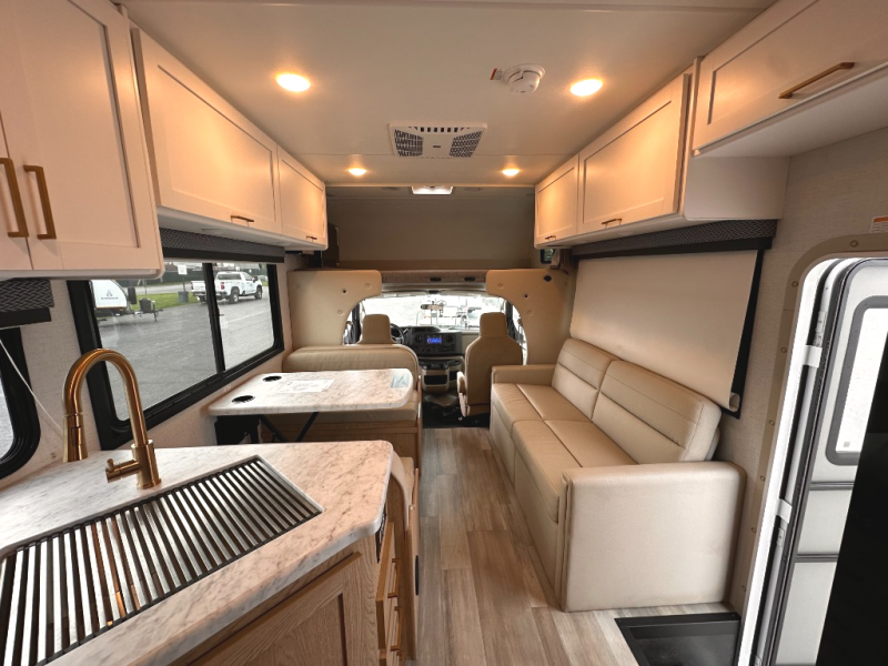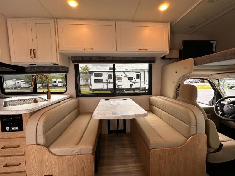 With any Four Winds ESpec Class C gas motorhome by Thor Motor Coach, you will find convenient amenities, a modern interior, and a reliable Ford E-Series chassis, with an optional Chevy chassis on select models to power your adventures. There is welded tubular aluminum roof and sidewall cage construction, a one-piece fiberglass front cap, and a one-piece domed roof membrane for added strength. Residential vinyl flooring will be easy to keep clean, and you'll love the sleek look of the Hampton Collection, two-toned cabinets. These motorhomes also include a 50 state 4.0 kW dual gas/LP generator and a 30-amp shoreline power cord to keep you going, along with a tankless water heater and 13,500 roof front A/C to ensure your comfort!