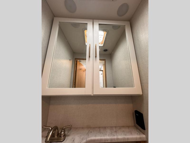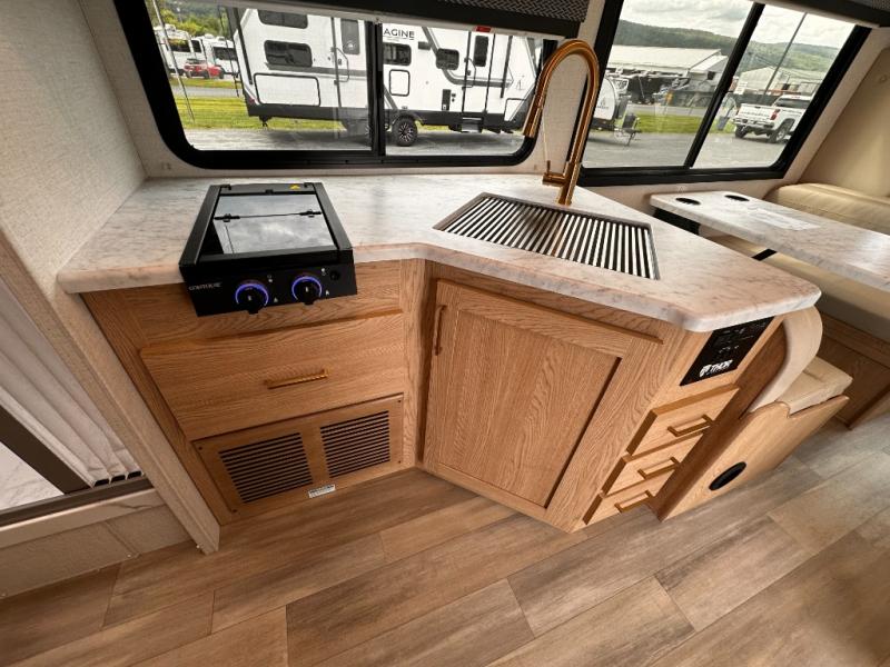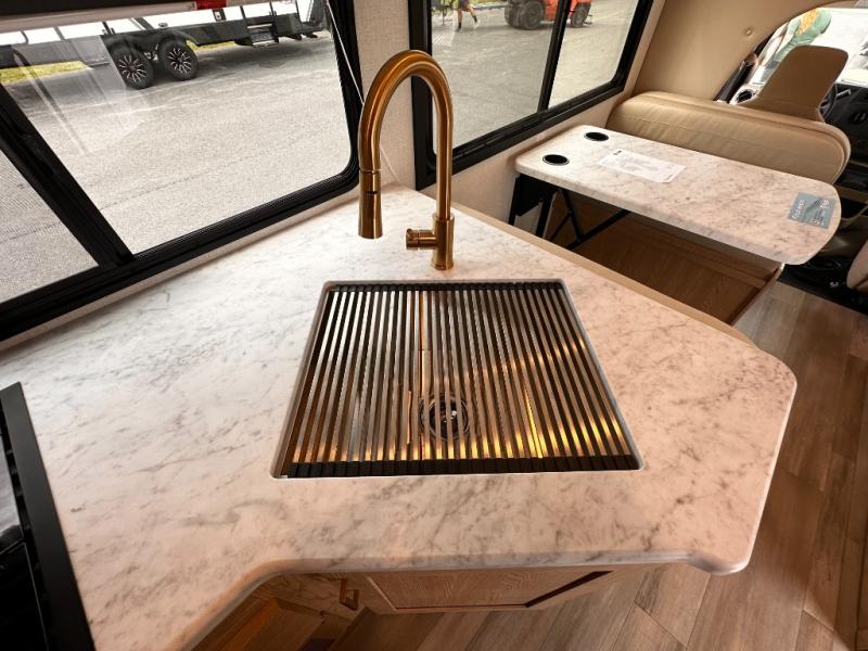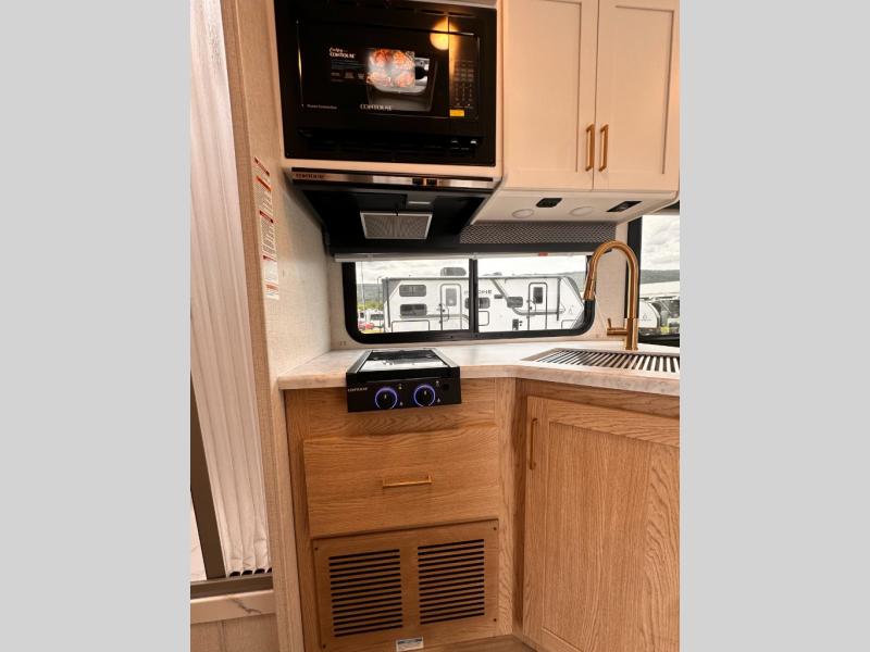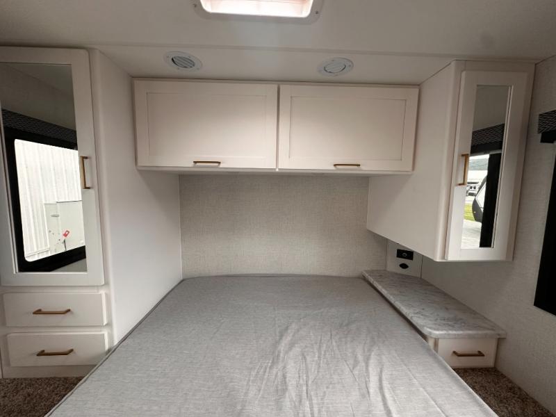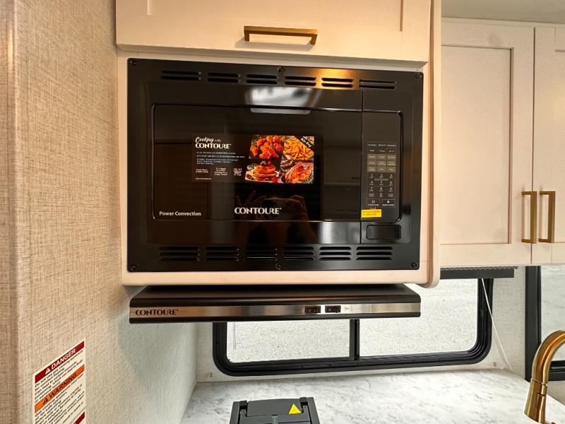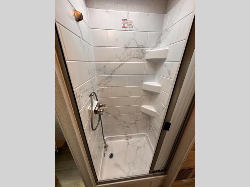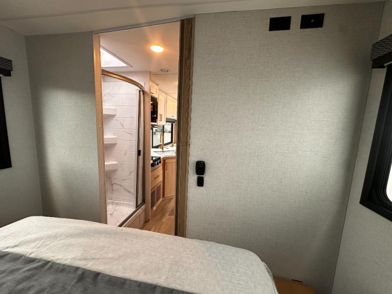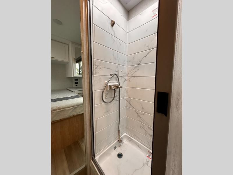 Whether you are couple or a family, this coach offers so many comforts you might never go back home! There is a rear bedroom offering a walk-around queen bed with storage on each side, and a split bathroom allowing two people to get ready at once. You'll love the living room furniture that can double as sleeping space for overnight guests, along with the cab-over bunk. There are full kitchen amenities such as a gas cooktop and microwave, plus the 12V refrigerator is next to the mid-coach entry allowing you to grab a beverage on your way out to relax under the power awning with integrated LED lighting. There is more to enjoy like the 32" Smart TV with swivel for the perfect view of the game, the dream dinette for dining and working, the sofa to relax on, and the cab over bunk to take a nap.