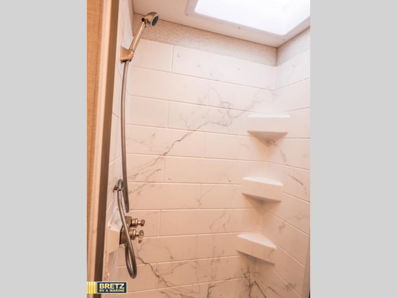 Perfect for a couple or a growing family, this coach will allow you to enjoy inside comforts and outdoor scenery where ever you drive and park! You will have great views out of the many windows when you are indoors, and the power awning offers an outdoor living area protected by the elements when you want some fresh air. The cook will love the large single bowl stainless steel sink with a single handle faucet with a pull-down sprayer when cleaning fruits and veggies, the gas cooktop and microwave when making meals, as well as the 12V refrigerator to hold all the cold items. The slide out creates even more floor space, the furniture offers a place to dine and visit as well as sleep, and the private bedroom with a full bathroom just steps away will complete the deal! You will also appreciate the optional exterior kitchen and optional exterior TV for more choices!