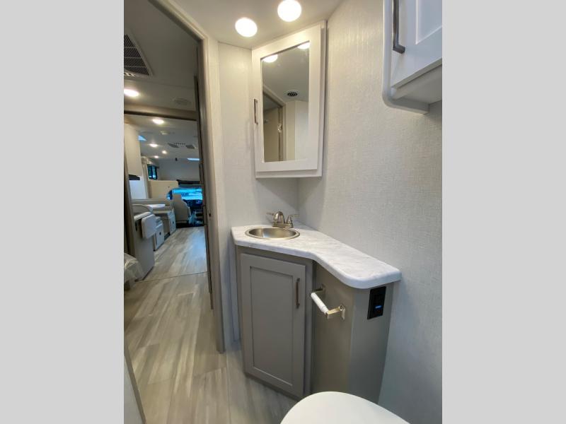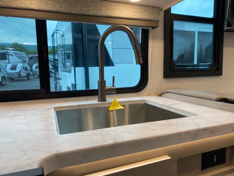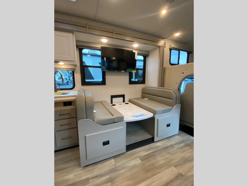 Easily head out for fun at a state park, the lake or your friend's ranch. This coach is easy to maneuver on the road or in town thanks to its compact size, yet has so many conveniences, you might not return home. The front cab over bunk is a perfect sleeping space for guests, the 40" Smart TV allows you to watch shows when you want some inside time, and the 71" Dream Dinette gives you a place to dine and relax. The cook will love all the kitchen amenities at their fingertips, plus the flip-up countertop extension is super handy. The rear corner bedroom offers a king bed slide for more floor space, a privacy curtain and a closet, plus the full bathroom is a few steps away.