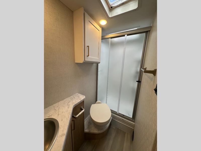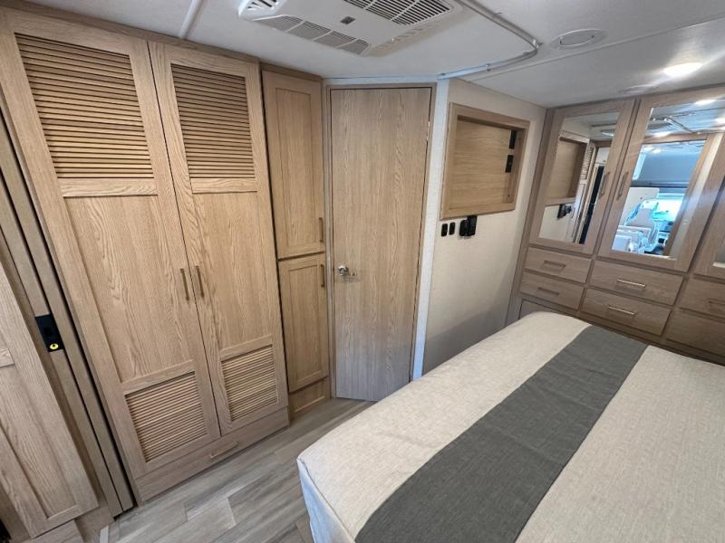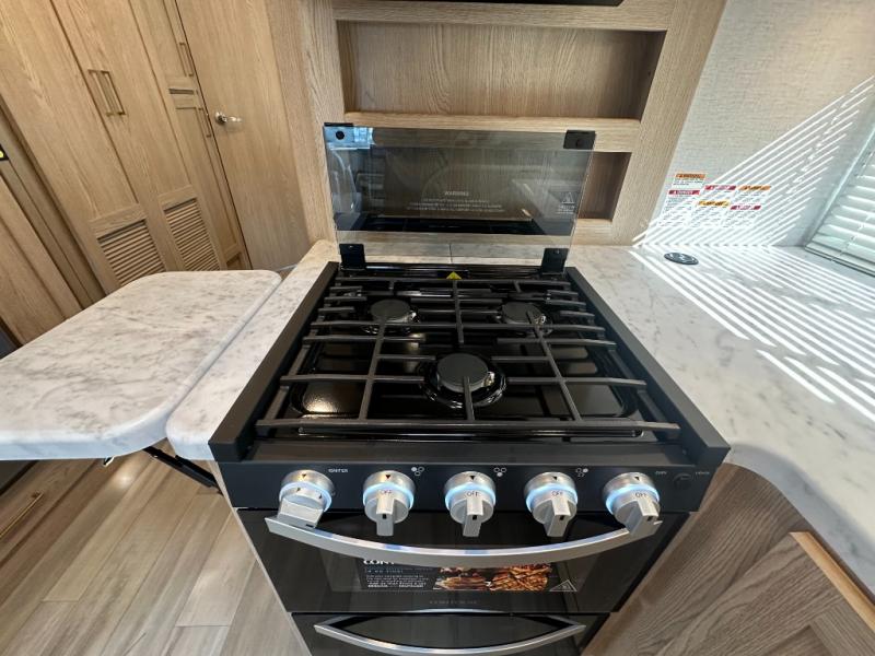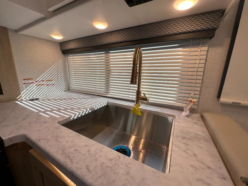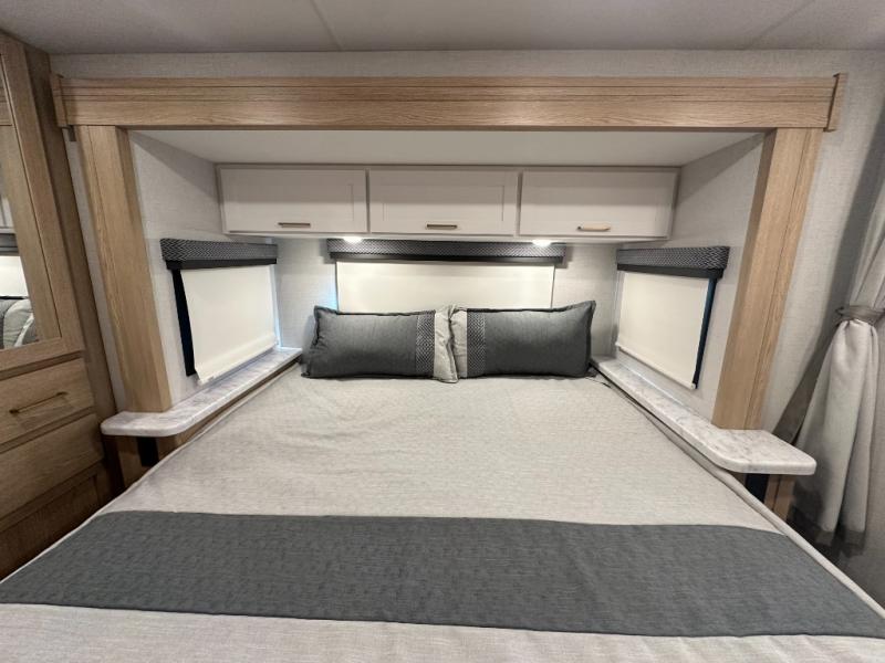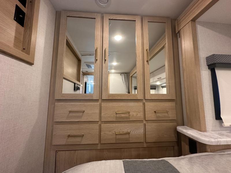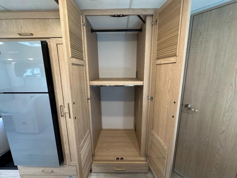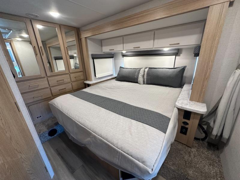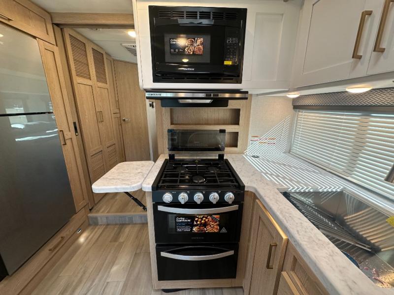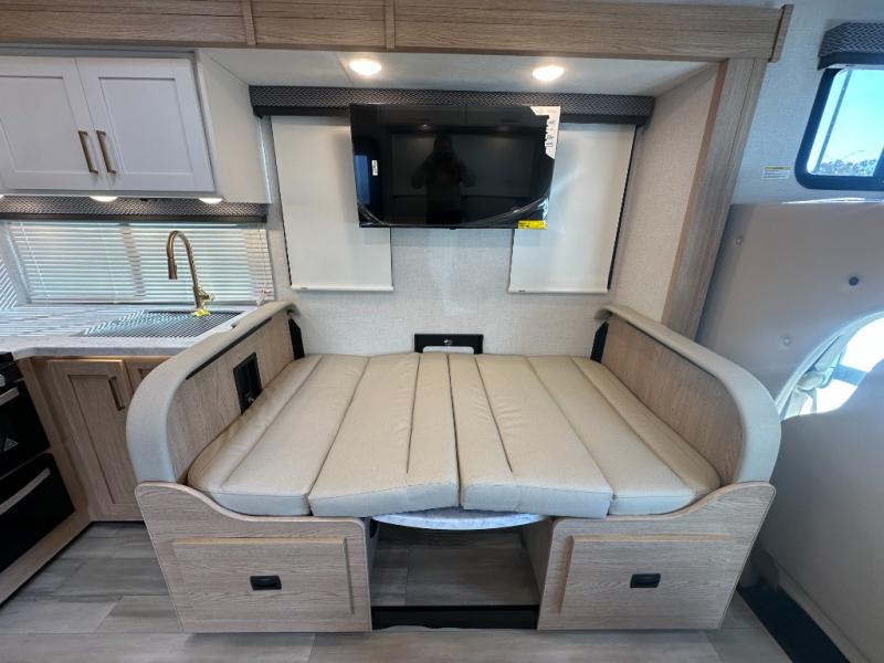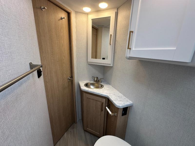Easily head out for fun at a state park, the lake or your friend's ranch. This coach is easy to maneuver on the road or in town thanks to its compact size, yet has so many conveniences, you might not return home. The front cab over bunk is a perfect sleeping space for guests, the 40" Smart TV allows you to watch shows when you want some inside time, and the 71" Dream Dinette gives you a place to dine and relax. The cook will love all the kitchen amenities at their fingertips, plus the flip-up countertop extension is super handy. The rear corner bedroom offers a king bed slide for more floor space, a privacy curtain and a closet, plus the full bathroom is a few steps away.