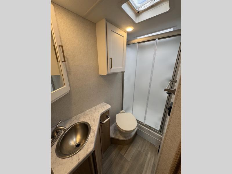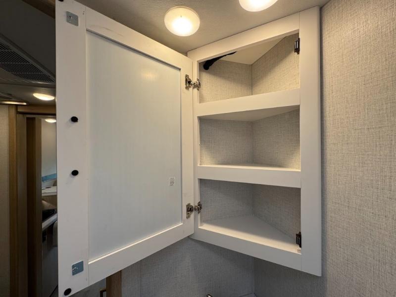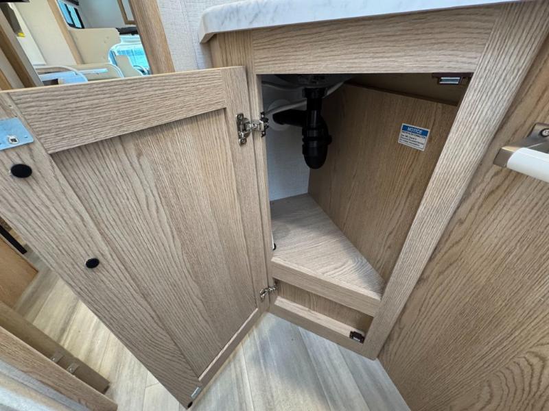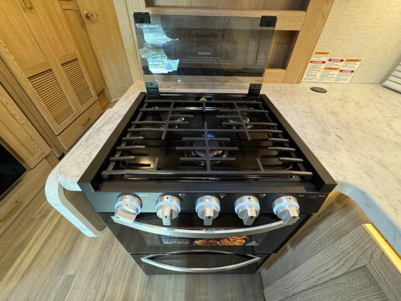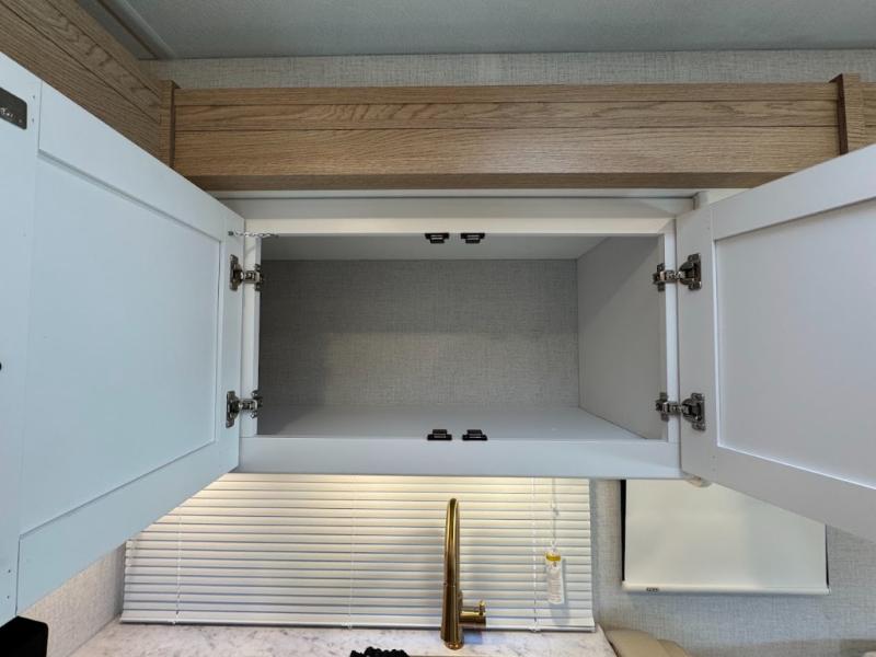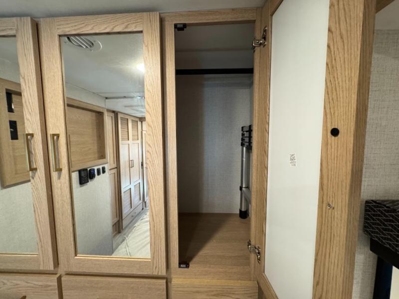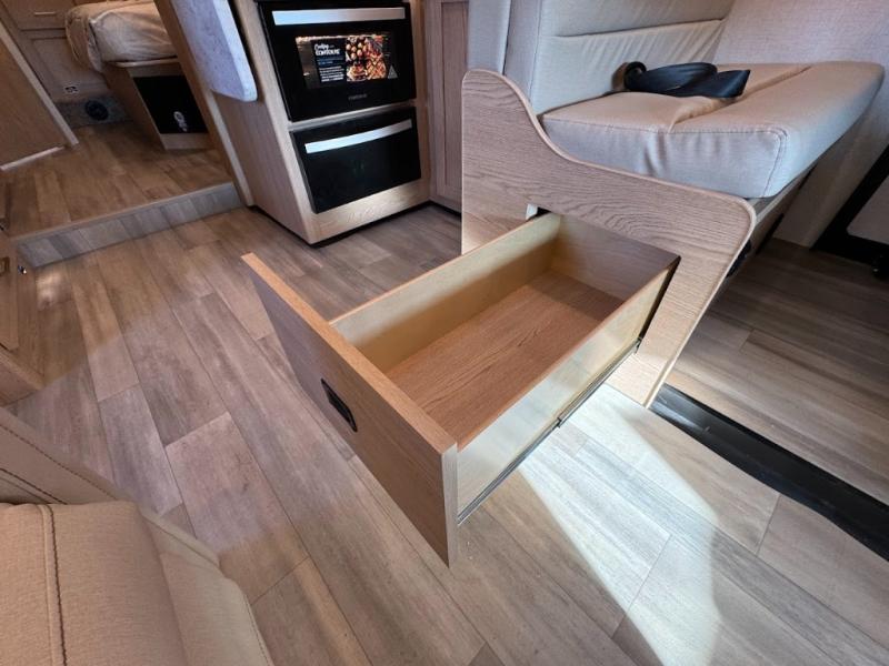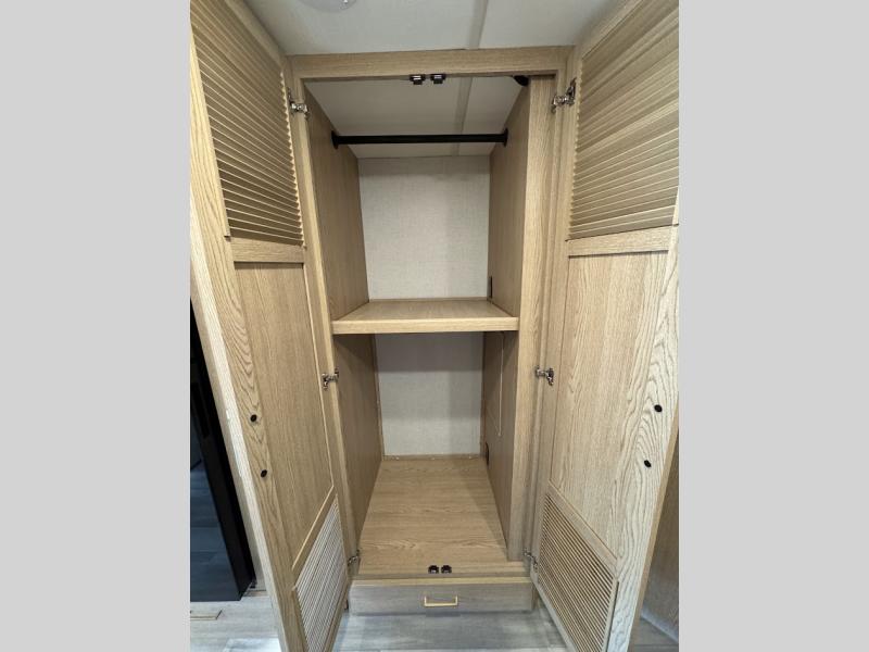 Easily head out for fun at a state park, the lake or your friend's ranch. This coach is easy to maneuver on the road or in town thanks to its compact size, yet has so many conveniences, you might not return home. The front cab over bunk is a perfect sleeping space for guests, the 40" Smart TV allows you to watch shows when you want some inside time, and the 71" Dream Dinette gives you a place to dine and relax. The cook will love all the kitchen amenities at their fingertips, plus the flip-up countertop extension is super handy. The rear corner bedroom offers a king bed slide for more floor space, a privacy curtain and a closet, plus the full bathroom is a few steps away.