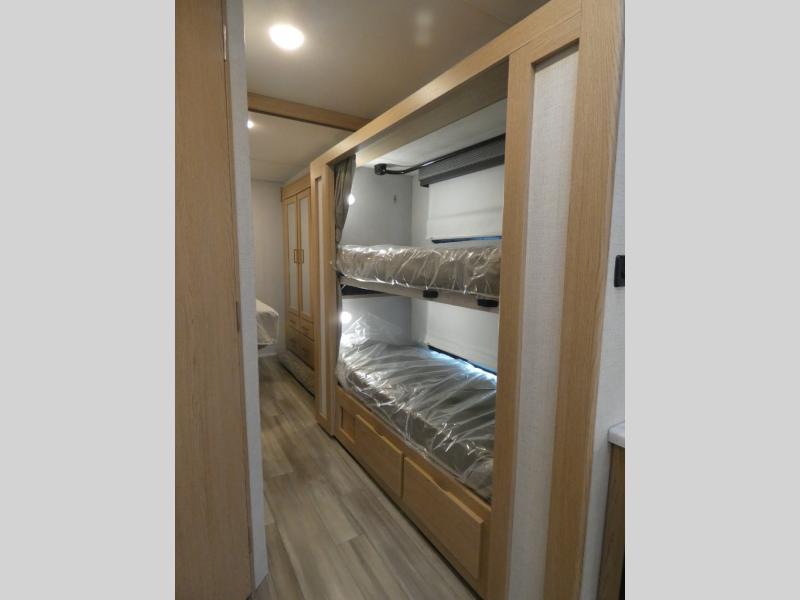 Planning a family vacation, a friend get-away or enjoy traveling with your partner? This coach offers a spacious interior thanks to the full-wall slide that stretches from behind the cab seats to the rear private bedroom. You can rest easy in your own queen bed with access to the double entry bathroom, your kids or guests will enjoy the bunk beds and cab over bunk to sleep on, plus the dream dinette and 68" jack-knife sofa offer even more sleeping space. And the kitchen amenities will impress anyone as they enter the mid-coach entrance. Everyone can watch the 40" mid-ship Smart TV in the living area, or head outside to relax under the power awning with integrated LED lighting.