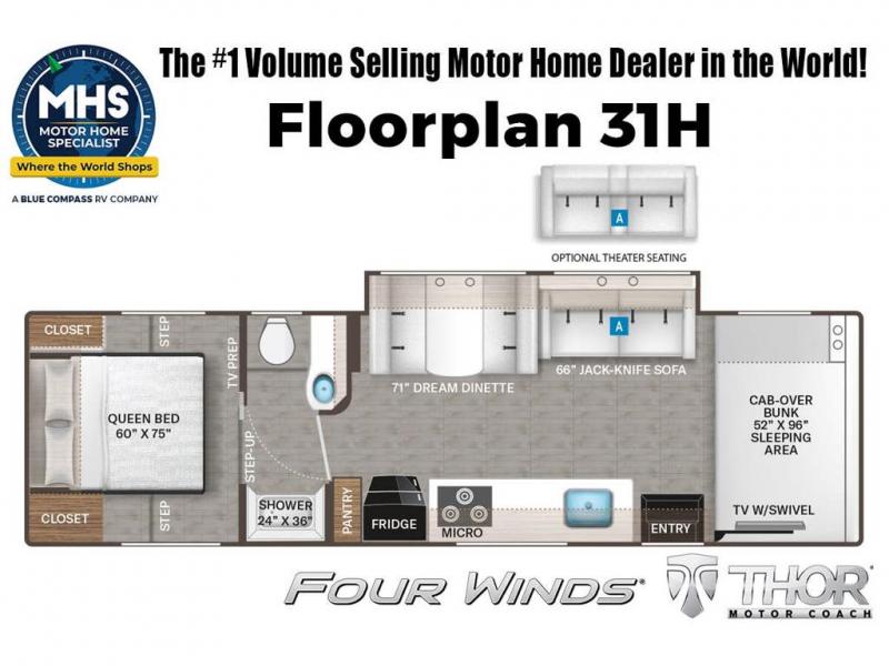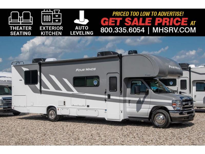 MSRP $173,764. The new 2026 Thor Motor Coach Four Winds Class C RV 31MV is approximately 32 feet 7 inches in length featuring the new Ford chassis with a 7.3L V8 engine. This beautiful RV features the SmoothTECH Ride Suspension System by Mor-Ryde, touchscreen dash radio with Apple Car Play and back-up monitor, a 3 burner gas cooktop with oven, large stainless steel sink, shower with glass door, and tankless water heater. Additional options include the partial paint, exterior pull-out kitchen w/griddle and 12V cooler, auto leveling jacks w/touch pad controls, heated remote exterior mirrors w/side cameras, leatherette driver/pass chairs, cabover child safety net and exterior TV on swivel bracket w/Bluetooth soundbar & radio. The Four Winds RV has an incredible list of standard features including keyless entry system, sun visor, power window & door locks, child safety tether, cab over bunk and so much more. Shop hundreds of class C gas RVs at 1 location! Choose from Fleetwood Altitude - Gulf Stream BT Cruiser - Thor Chateau - Four Winds - Geneva and Quantum - Entegra Coach Odyssey Odyssey SE and Esteem - East to West Entrada - Forest River Forester - Forester LE - Nexus Phantom - Viper and much more. We also sell quality pre-owned models such as Jayco Greyhawk – Redhawk - Redhawk SE - Thor Magnitude - Winnebago Spirit - and Minnie Winnie - Coachmen Freelander and Leprechaun - Forest River Sunseeker Classic - Sunseeker LE – Solera - Holiday Rambler Incline and much more. Visit MHSRV.com for our complete line-up and the sale prices that have made us the #1 volume selling motor home dealership in the world 12 years in a row! For additional details on this unit and our entire inventory including brochures, window sticker, videos, photos, reviews & testimonials as well as additional information about Motor Home Specialist and our manufacturers please visit us at MHSRV.com or call 800-335-6054. At Motor Home Specialist, we DO NOT charge any prep or orientation fees like you will find at other dealerships. All sale prices include a 200-point inspection, interior & exterior wash, detail service and a fully automated high-pressure rain booth test and coach wash that is a standout service unlike that of any other in the industry. You will also receive a thorough coach orientation with an MHSRV technician, a night stay in our delivery park featuring landscaped and covered pads with full hook-ups and much more! Read Thousands upon Thousands of 5-Star Reviews at MHSRV.com and See What They Had to Say About Their Experience at Motor Home Specialist. WHY PAY MORE? WHY SETTLE FOR LESS?