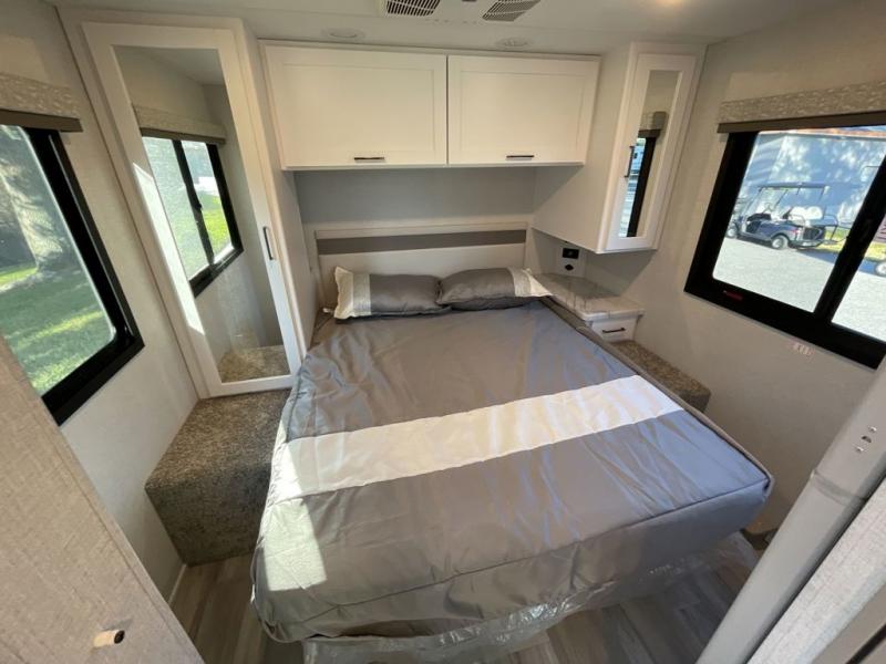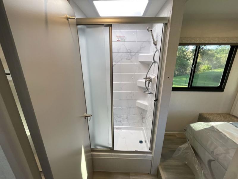 You and your spouse can go on your best adventures in this motorhome! You will have great views out of the many windows when you are indoors, and the power awning offers an outdoor living area protected by the elements when you want some fresh air. The cook will love the large single bowl stainless steel sink with a single handle faucet with a pull-down sprayer when cleaning fruits and veggies, the gas cooktop and microwave when making meals, as well as the 12V refrigerator to hold all the cold items. The slide out creates even more floor space, the 71" Dream Dinette and 66" jackknife sofa offers a place to dine and visit as well as sleep, and the rear private bedroom with a full bathroom just steps away will complete the deal! You will also appreciate the optional exterior TV to watch your favorite shows while breathing in fresh air!