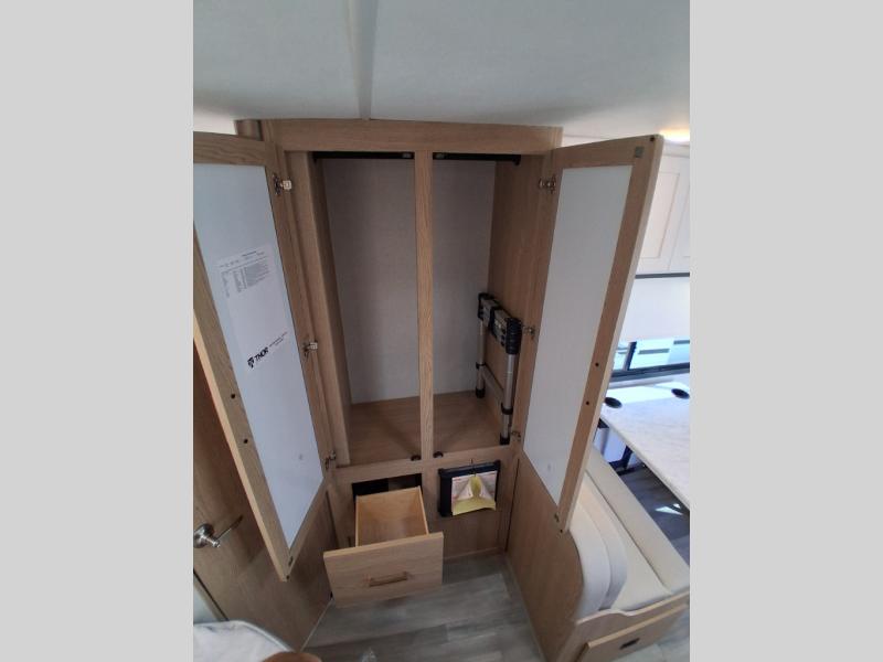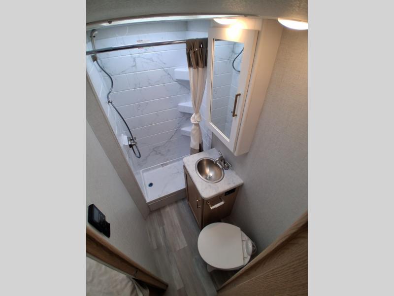 It won't be hard to find comfort in this coach for five! You can freshen up in the rear corner full bath once you've set up camp, then make lunch on the two burner gas cooktop or convection microwave with an air fryer. There is also a 12V refrigerator for cold items and a flip-up countertop for more space. Whether you dine at the Dream Dinette or take your plate outdoors under the 15' power awning, you're sure to have a great time in this motorhome. The rear corner full-size bed will provide a comfy place to rest your head at night, while your guests take the dinette and cab-over bunk!