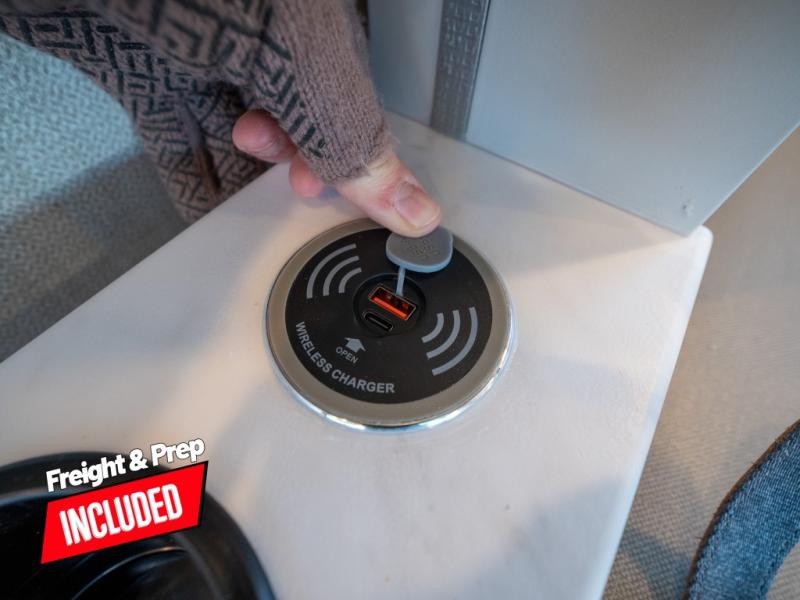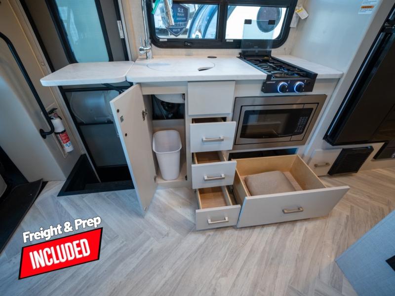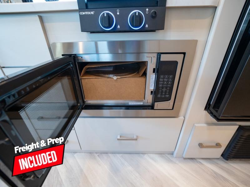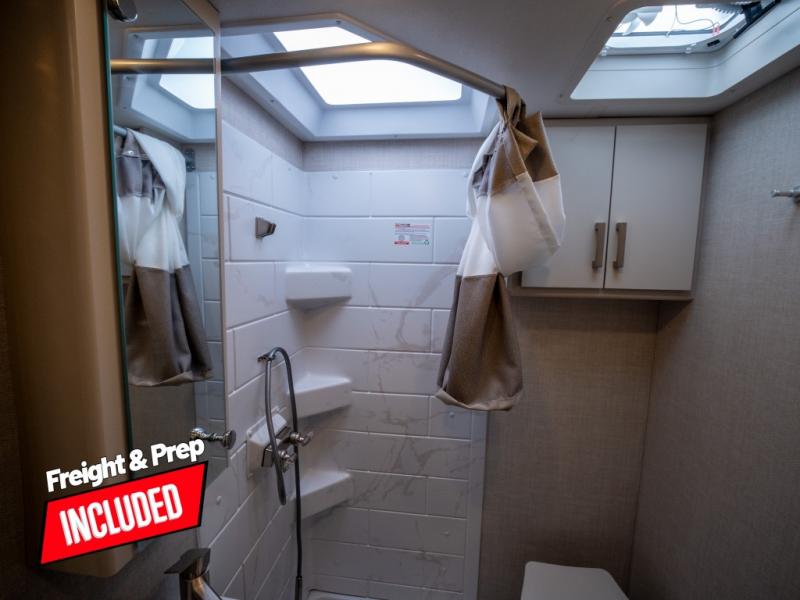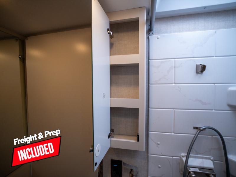 This is the perfect coach for two whether you are a couple or not! This Gemini AWD model features a set of twin beds that can easily convert to a king bed if you like. Enjoy the added space thanks to a slide out jack-knife sofa. This table is handy for dining when you are stopped. You will appreciate the kitchen amenities for light meals and snacks while on the road, plus the onboard bath offers a 27" x 27" radius shower, toilet and sink which is convenient as well. There are also two 32" TVs in this coach, one over the side entry opposite the seating in front, and one back in the sleeping area at the foot of the roadside twin bed. A built-in skylight offers the ability to stargaze in the front of the coach on a clear night.