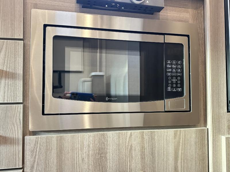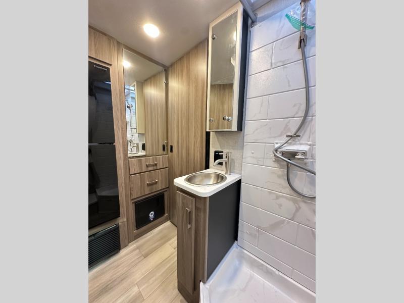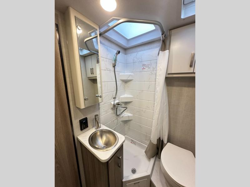 This is the perfect coach for two whether you are a couple or not! This Gemini AWD model features a set of twin beds that can easily convert to a king bed if you like. Enjoy the added space thanks to a slide out jack-knife sofa. This table is handy for dining when you are stopped. You will appreciate the kitchen amenities for light meals and snacks while on the road, plus the onboard bath offers a 27" x 27" radius shower, toilet and sink which is convenient as well. There are also two 32" TVs in this coach, one over the side entry opposite the seating in front, and one back in the sleeping area at the foot of the roadside twin bed. A built-in skylight offers the ability to stargaze in the front of the coach on a clear night.