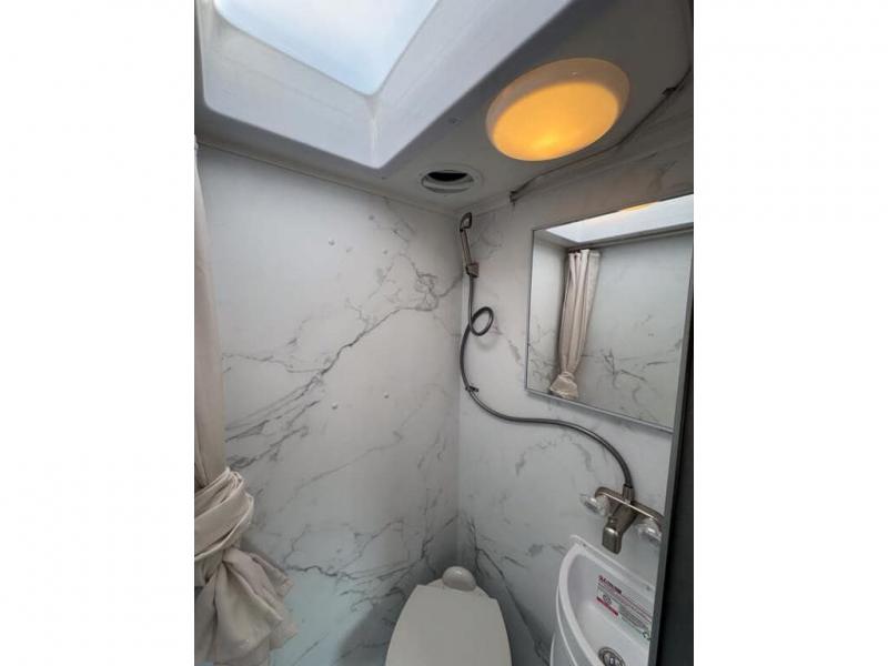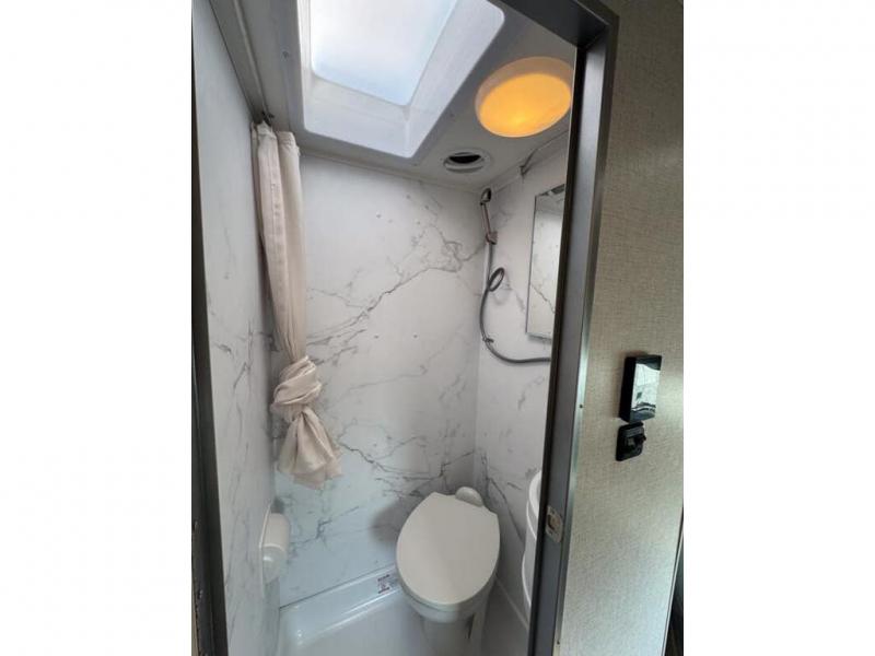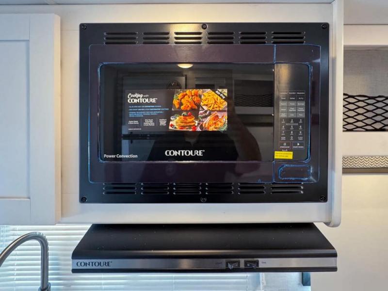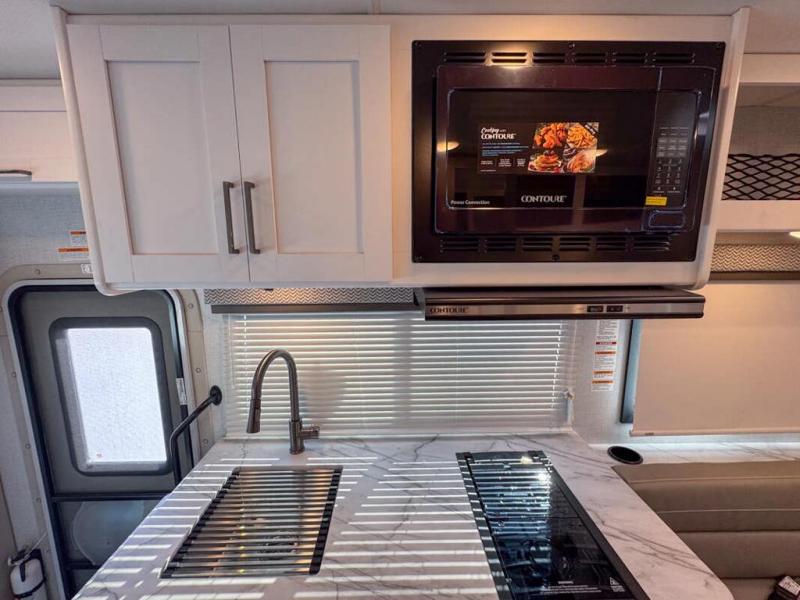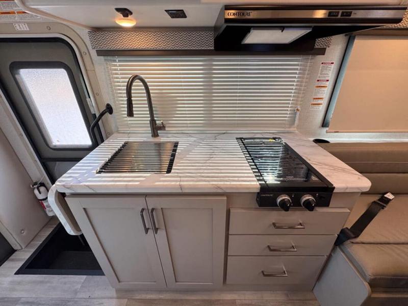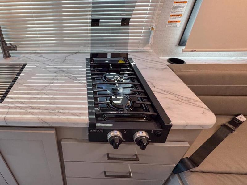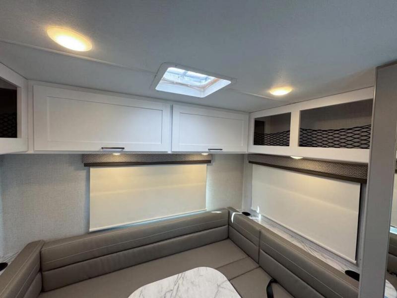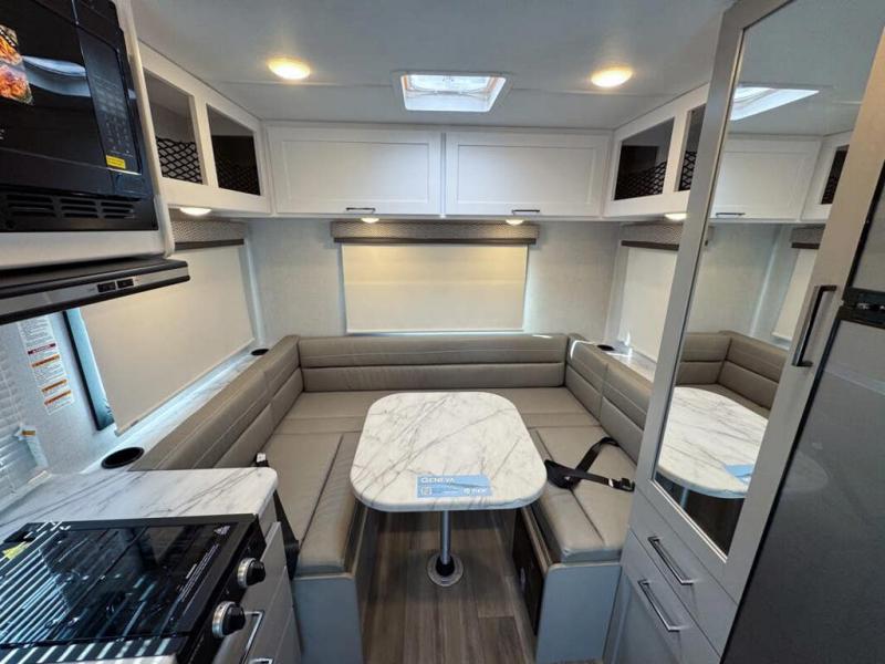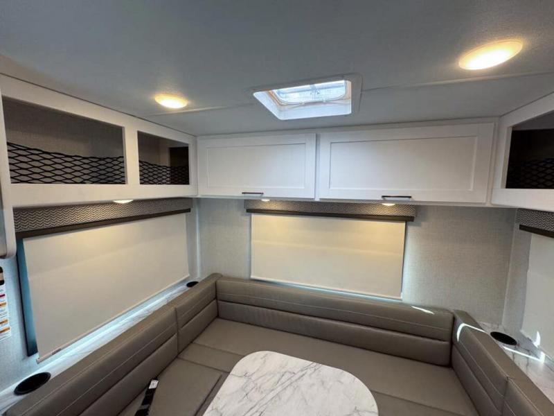 This cozy coach is perfect for three to four happy campers! Once you stop for the day, you can freshen up in the wet bath that includes a foot flush toilet, power vent, and shower skylight for more natural lighting. The two burner cooktop and convection microwave with an air fryer will let you make meals each day, and the 12V refrigerator will keep your food fresh. You'll also appreciate the flip-up countertop for more space to prep meals. There is a U-shaped dinette with a removable table that will convert to a 54" x 77" bed, while the little ones take the cab-over bunk with a 52" x 91" sleeping area.
