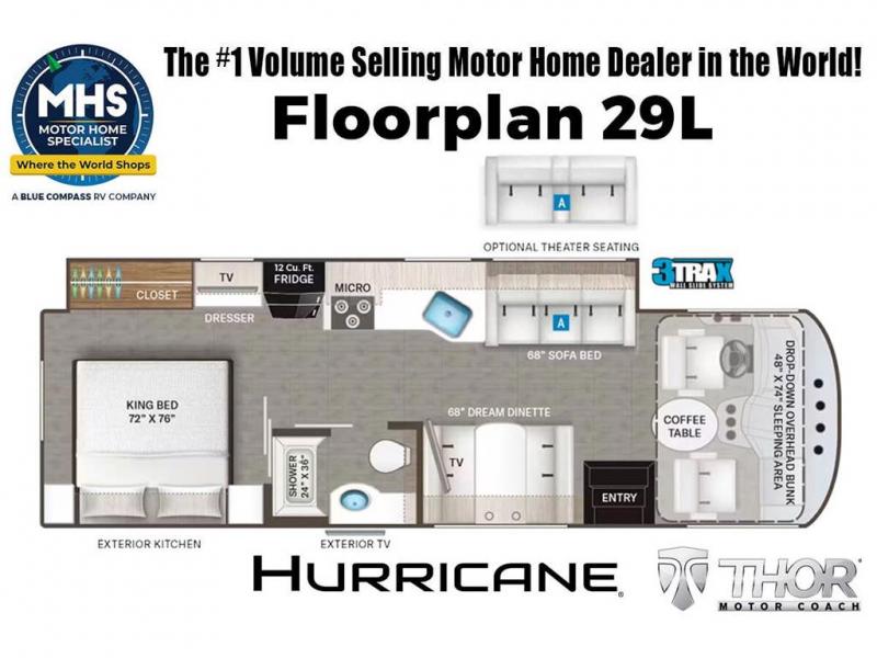 MSRP $216,804. New 2026 Thor Motor Coach Hurricane 29L is approximately 30 feet in length with 1 slides including a full wall slide, king size bed, exterior TV, exterior kitchen and automatic leveling jacks. This beautiful new motorhome also features the new Ford chassis with 7.3L PFI V-8, a 6-speed TorqShift® automatic transmission, an updated instrument cluster, automatic headlights and a tilt/telescoping steering wheel. The Thor Motor Coach Hurricane RV also features tinted one-piece windshield, multiple USB charging ports throughout, Winegard ConnecT WiFi extender +4G, heated and enclosed underbelly, black tank flush, LED ceiling lighting, bedroom TV, LED running and marker lights, power driver's seat, power overhead loft, power patio awning with LED lighting, night shades, flush covered glass stovetop, refrigerator, microwave, and much more. Optional features on this RV include frameless dual pane windows and leatherette theater seats with footrests. Shop hundreds of class A motorhomes all at 1 location! Choose from Thor A.C.E. – Resonate – Hurricane – Windsport – Luminate – Indigo – Vegas – Axis – Challenger – Miramar Fleetwood Flair – Fortis – Flex – Bounder - Forest River Georgetown - FR3 – Entegra Coach Vision – Vision XL – Emblem – Holiday Rambler Admiral – Eclipse – Invicta – Vacationer - and much more. We also sell quality pre-owned models such as Jayco Alante SE – Alante – Precept – Precept Prestige – Tiffin Allegro Open Road – Newmar Canyon Star – Bay Star – Winnebago Vista – Sunstar – Adventurer – Coachmen Mirada – Pursuit - Encore and much more. Visit MHSRV.com for our complete line-up and the sale prices that have made us the #1 volume selling motor home dealership in the world 12 years in a row! For additional details on this unit and our entire inventory including brochures, window sticker, videos, photos, reviews & testimonials as well as additional information about Motor Home Specialist and our manufacturers please visit us at MHSRV.com or call 800-335-6054. At Motor Home Specialist, we DO NOT charge any prep or orientation fees like you will find at other dealerships. All sale prices include a 200-point inspection, interior & exterior wash, detail service and a fully automated high-pressure rain booth test and coach wash that is a standout service unlike that of any other in the industry. You will also receive a thorough coach orientation with an MHSRV technician, a night stay in our delivery park featuring landscaped and covered pads with full hook-ups and much more! Read Thousands upon Thousands of 5-Star Reviews at MHSRV.com and See What They Had to Say About Their Experience at Motor Home Specialist. WHY PAY MORE? WHY SETTLE FOR LESS?