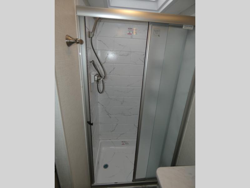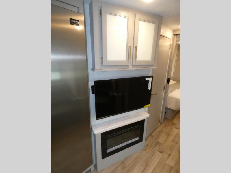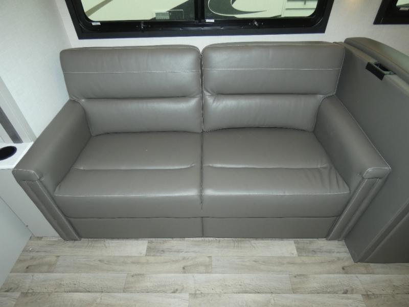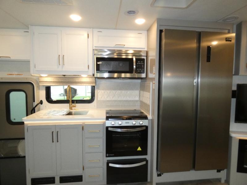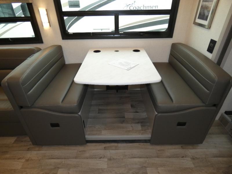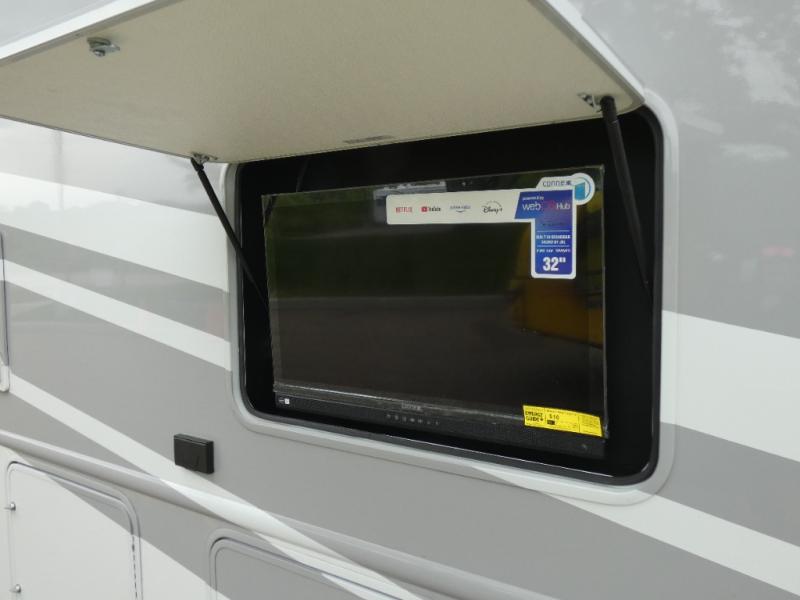 A bath and a half in this coach make it perfect for trips with friends and family. You will have tons of space provided by the two slide outs, plus a sleeping capacity of six to seven people each night. The expanding sofa bed has a great view of the 40" LED Smart TV, and the Dream Dinette will be great for meal times and game night. Whip up a hearty meal on the three burner gas cooktop, or use the convenient over-the-range microwave oven. There is also a 19 cu. ft. residential double door stainless refrigerator and a pantry for food storage. You'll be very pleased with the master bedroom that includes a king bed, a 32" LED Smart TV, and a closet to keep your clothes wrinkle-free.