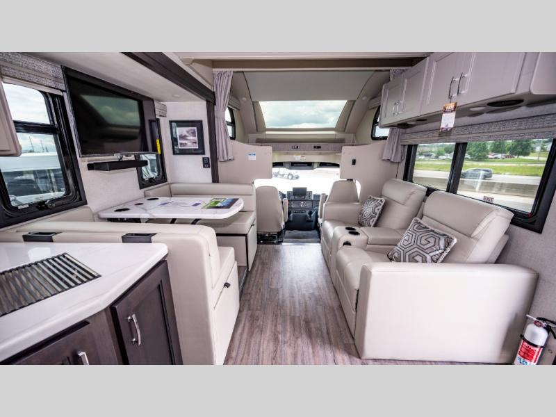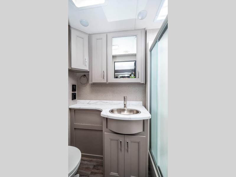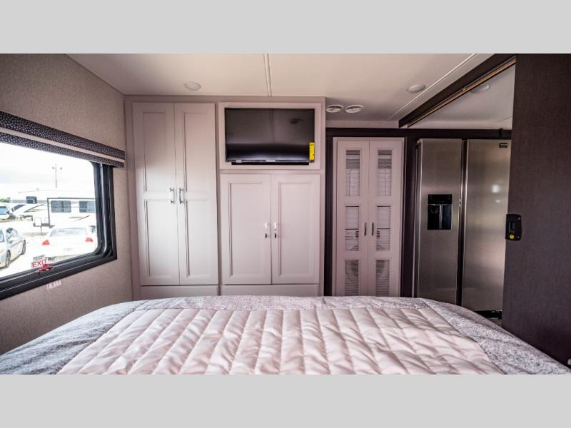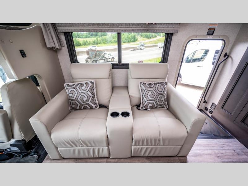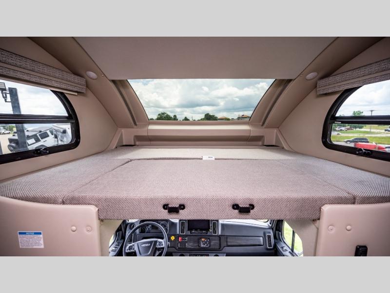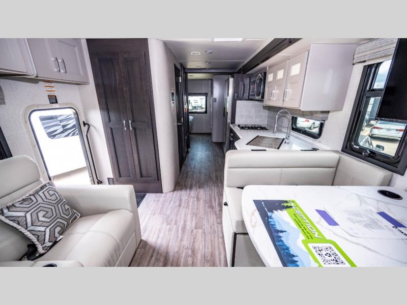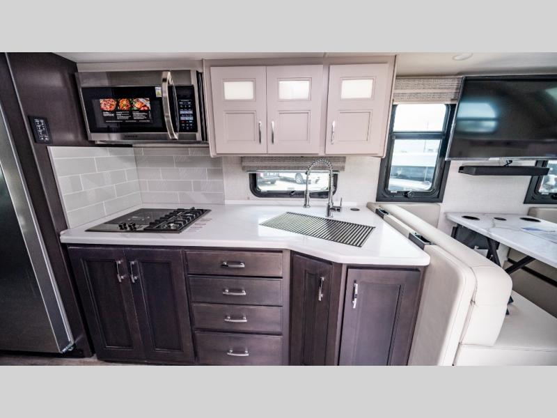 You won't even feel like you're traveling in this motorhome! The rear private bedroom offers at-home comforts with a Tilt-A-View inclining king bed slide, a closet, and a 32" Smart TV to watch movies in bed, plus there is a stackable washer and dryer for added convenience. The kiddos will want to draw straws for who gets to sleep on the 52" x 80" bunk over cab. Everyone can freshen up each morning in the full bathroom with 30" x 36" shower which has a skylight above, an Oxygenics shower head, and fiberglass shower with a glass door. Prepare your best home cooked meals with the two burner high output gas range top with single induction cooktop and enjoy them at the 72" Dream Dinette. The theater seating has the perfect view of the 42" Smart TV above the dinette.