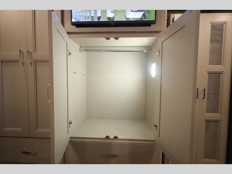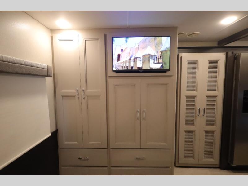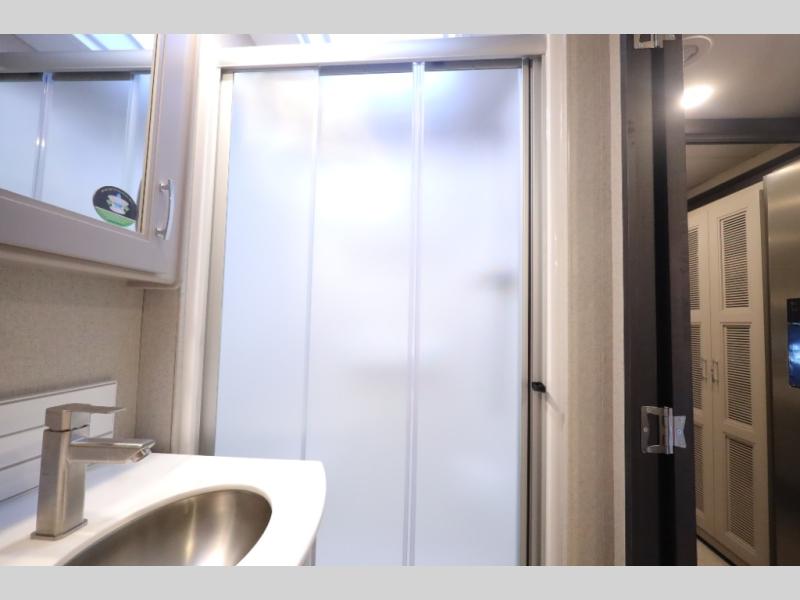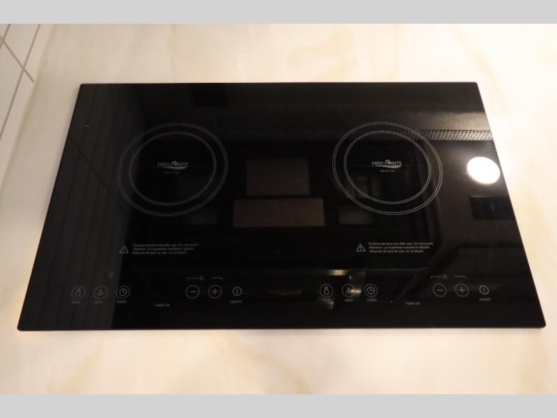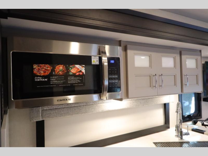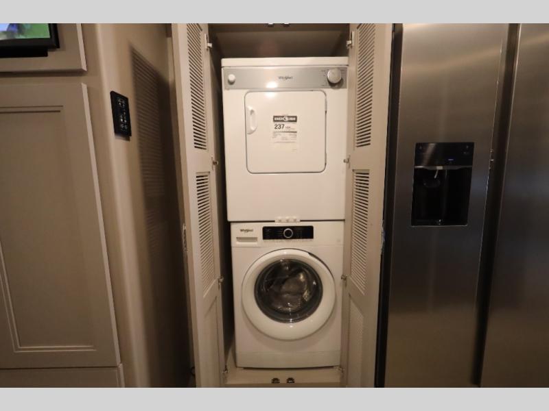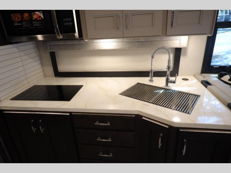 You won't even feel like you're traveling in this motorhome! The rear private bedroom offers at-home comforts with a Tilt-A-View inclining king bed slide, a closet, and a 32" Smart TV to watch movies in bed, plus there is a stackable washer and dryer for added convenience. The kiddos will want to draw straws for who gets to sleep on the 52" x 80" bunk over cab. Everyone can freshen up each morning in the full bathroom with 30" x 36" shower which has a skylight above, an Oxygenics shower head, and fiberglass shower with a glass door. Prepare your best home cooked meals with the two burner high output gas range top with single induction cooktop and enjoy them at the 72" Dream Dinette. The theater seating has the perfect view of the 42" Smart TV above the dinette.