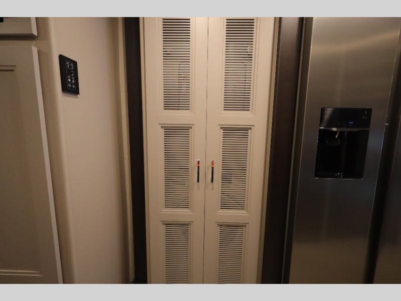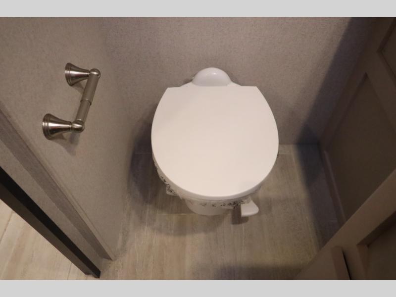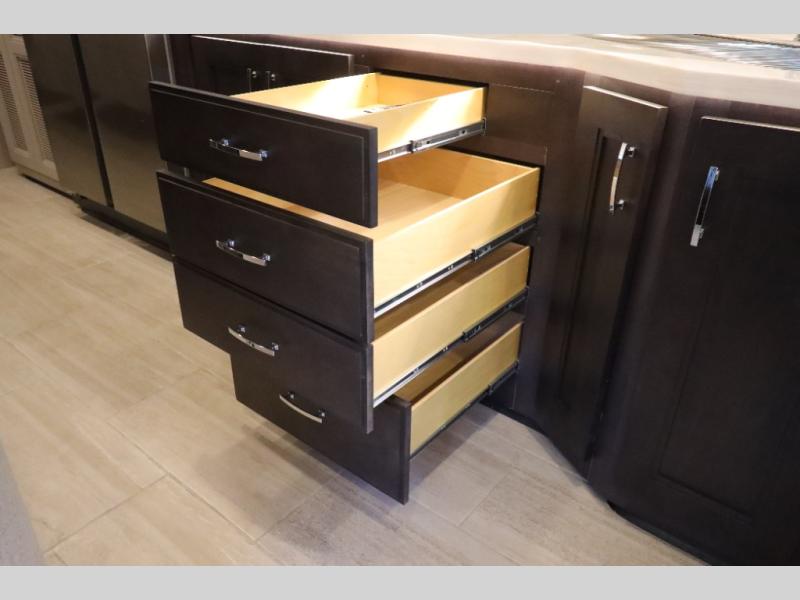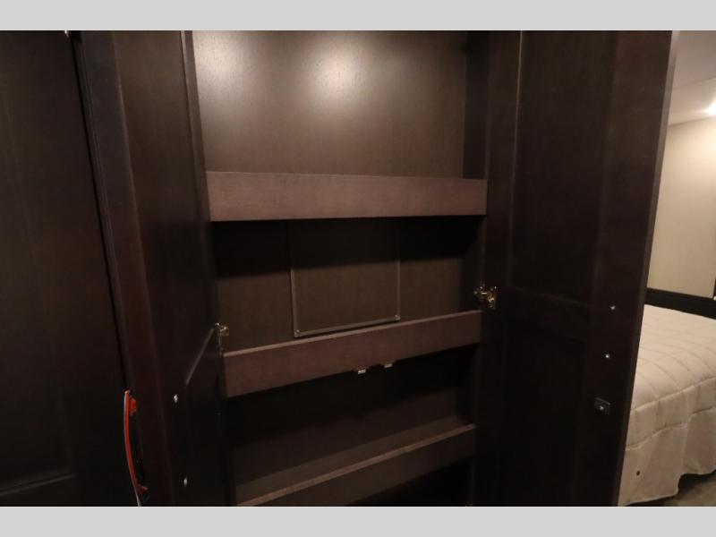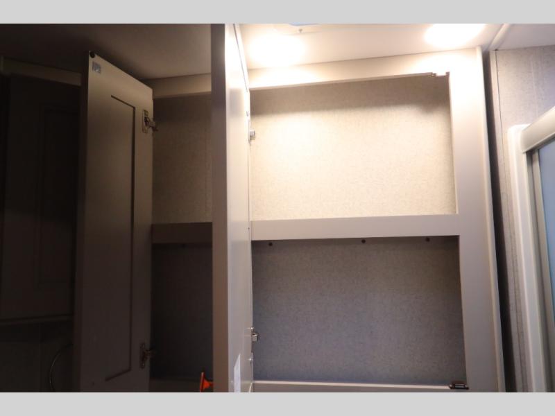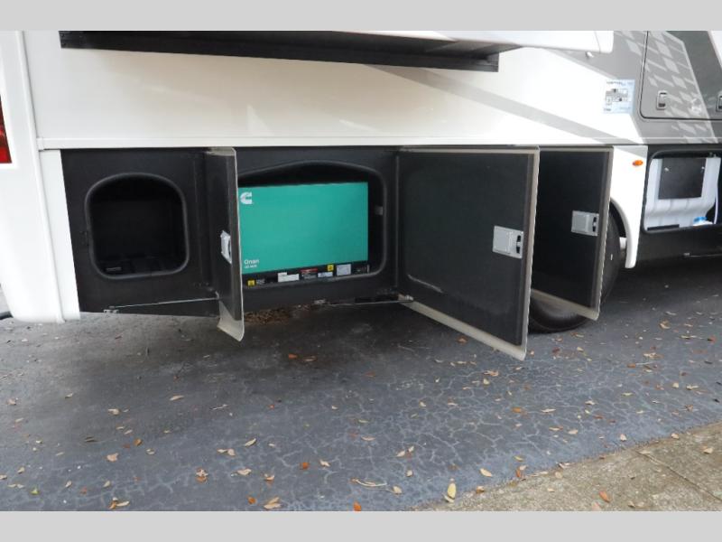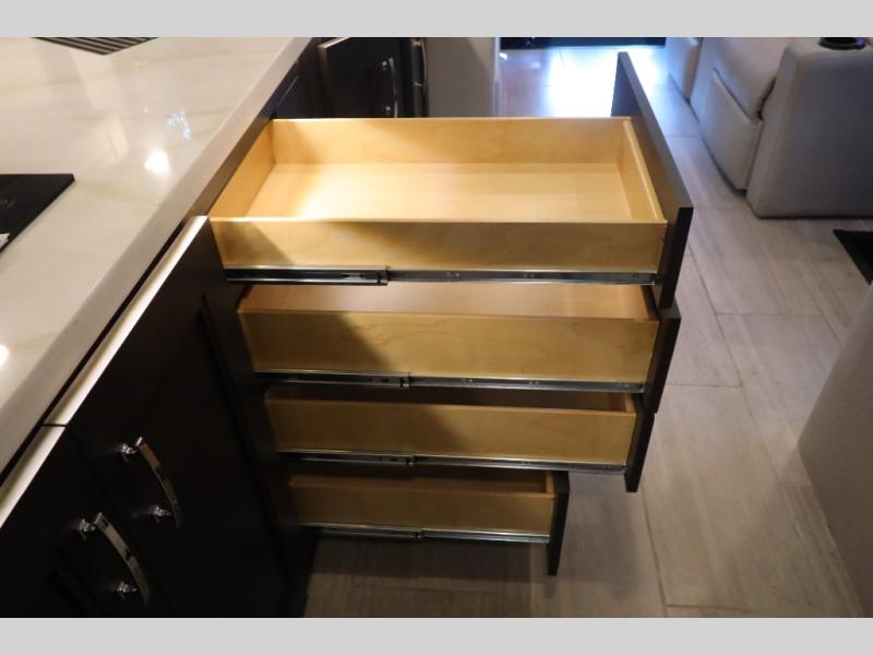You won't even feel like you're traveling in this motorhome! The rear private bedroom offers at-home comforts with a Tilt-A-View inclining king bed slide, a closet, and a 32" Smart TV to watch movies in bed, plus there is a stackable washer and dryer for added convenience. The kiddos will want to draw straws for who gets to sleep on the 52" x 80" bunk over cab. Everyone can freshen up each morning in the full bathroom with 30" x 36" shower which has a skylight above, an Oxygenics shower head, and fiberglass shower with a glass door. Prepare your best home cooked meals with the two burner high output gas range top with single induction cooktop and enjoy them at the 72" Dream Dinette. The theater seating has the perfect view of the 42" Smart TV above the dinette.