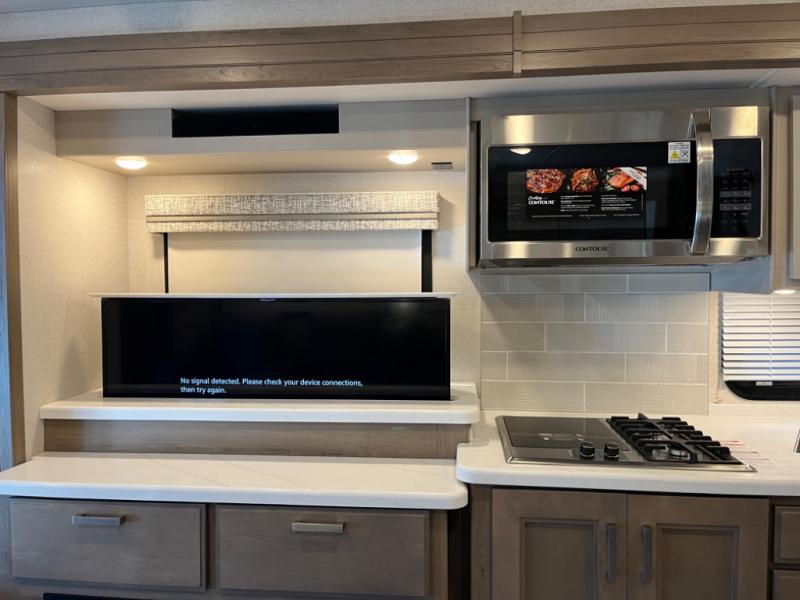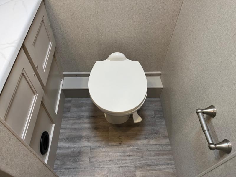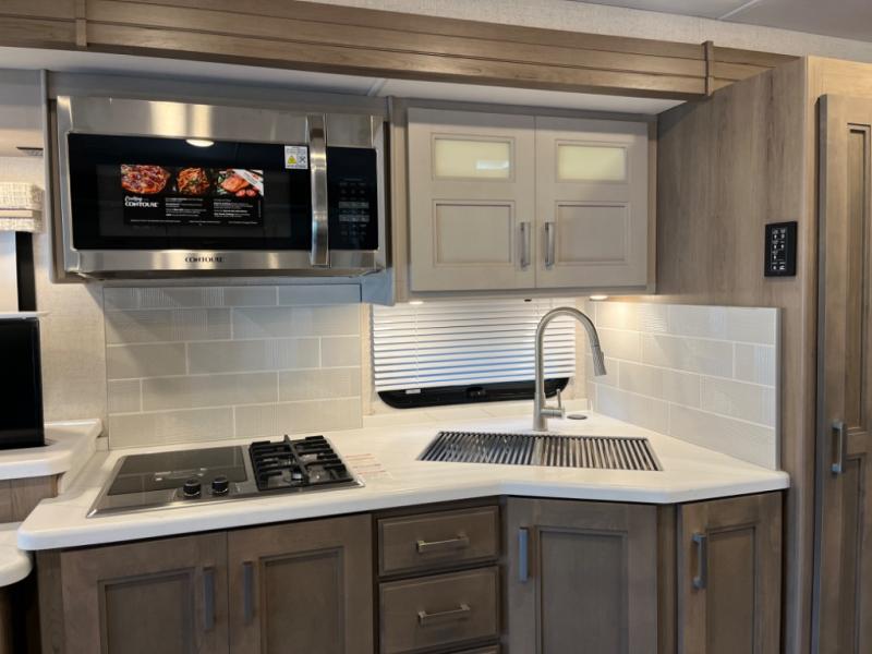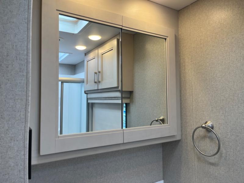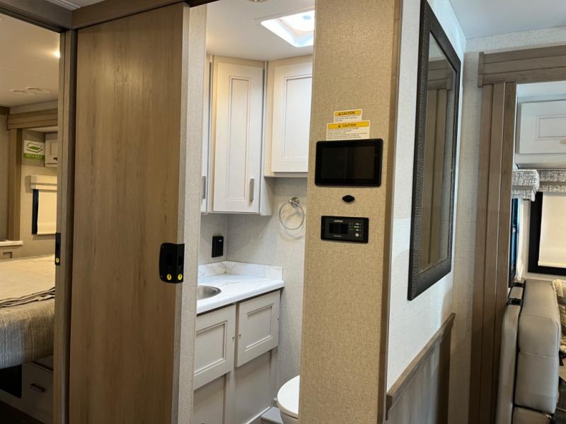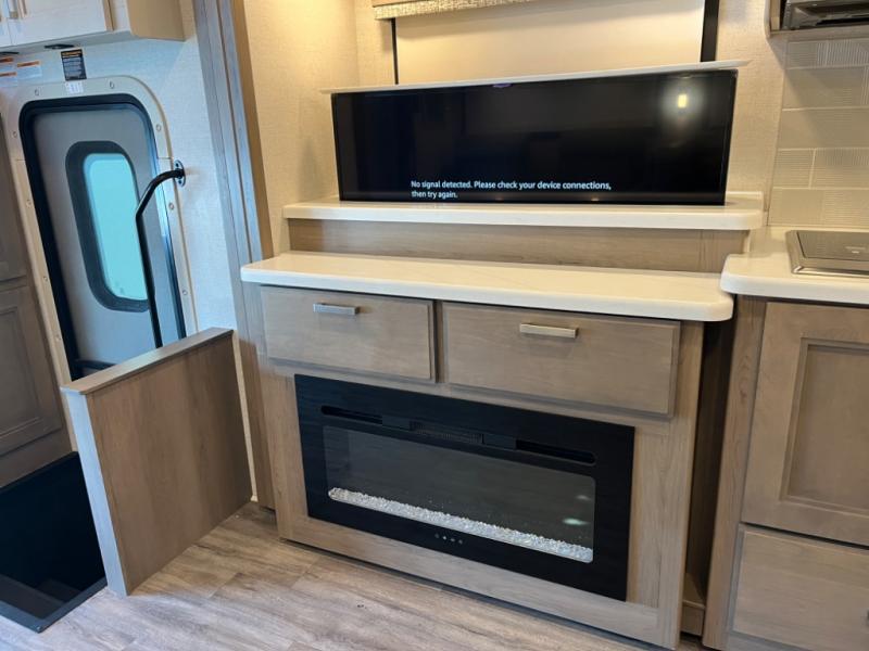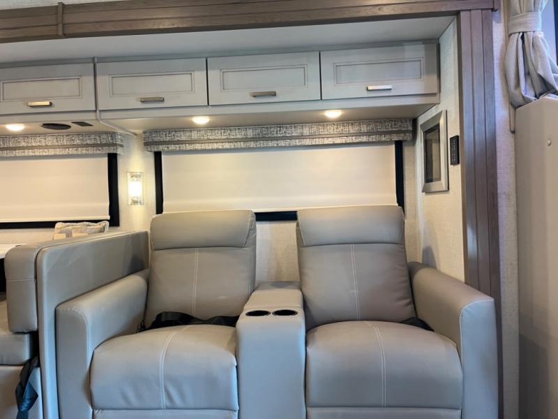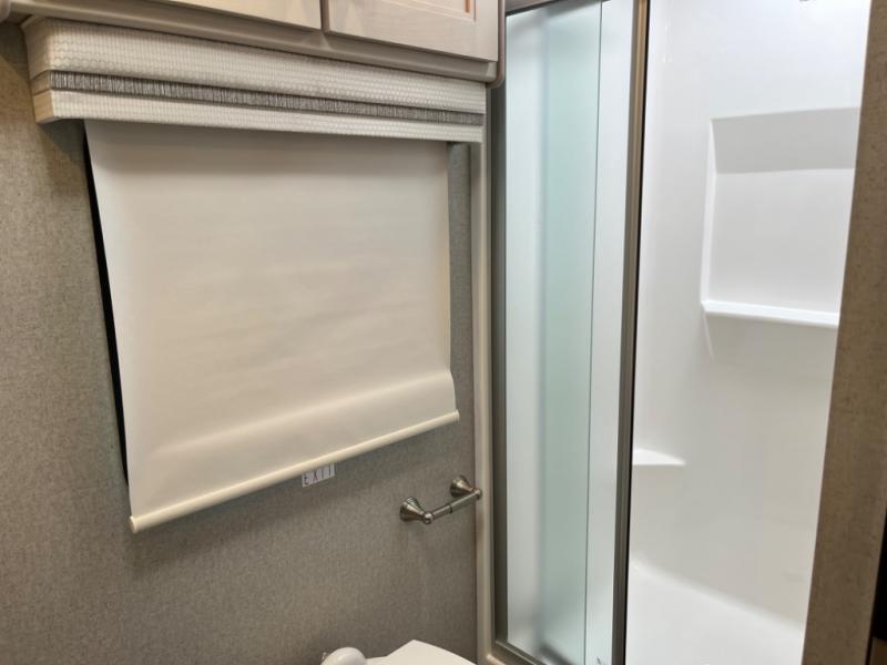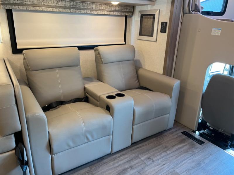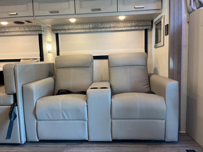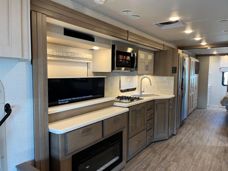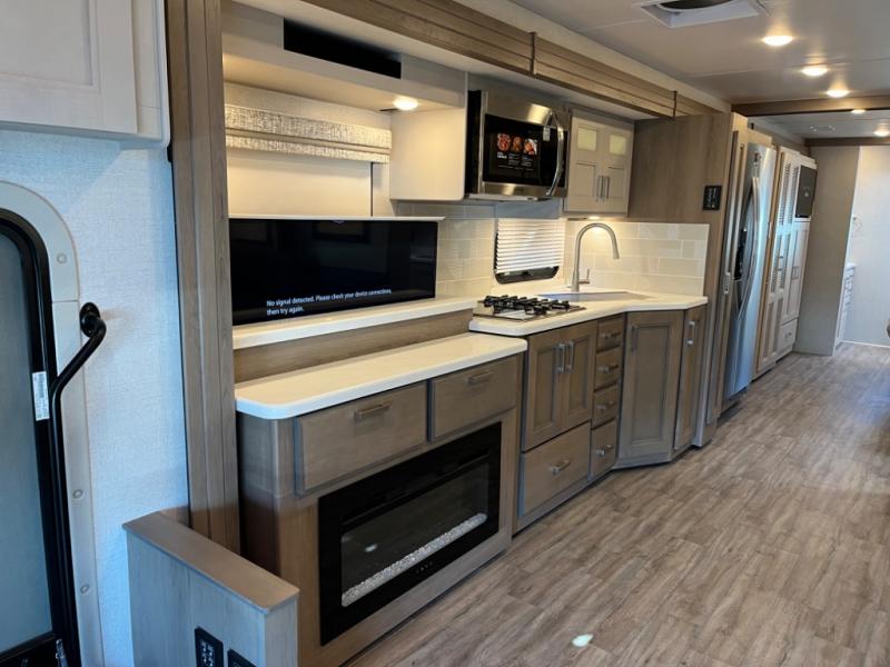 It's a clean decision to take this motorhome on your next trip with the bath and a half! The master suite offers at home comforts with a Tilt-A-View inclining king bed slide, a chest of drawers, a closet, and a 32" TV to watch movies in bed. The guests can sleep on the 52" x 80" bunk over cab and even convert the 72" Dream Dinette. Everyone can freshen up each morning in the full bathroom with the 30" x 36" shower which has a skylight above, an Oxygenics shower head, and a fiberglass shower with a glass door. Prepare your best home cooked meals with the two burner high output gas range top with single induction cooktop and easily take a bathroom break with the half bathroom nearby. The theater seating has the perfect view of the fireplace with a TV above it.