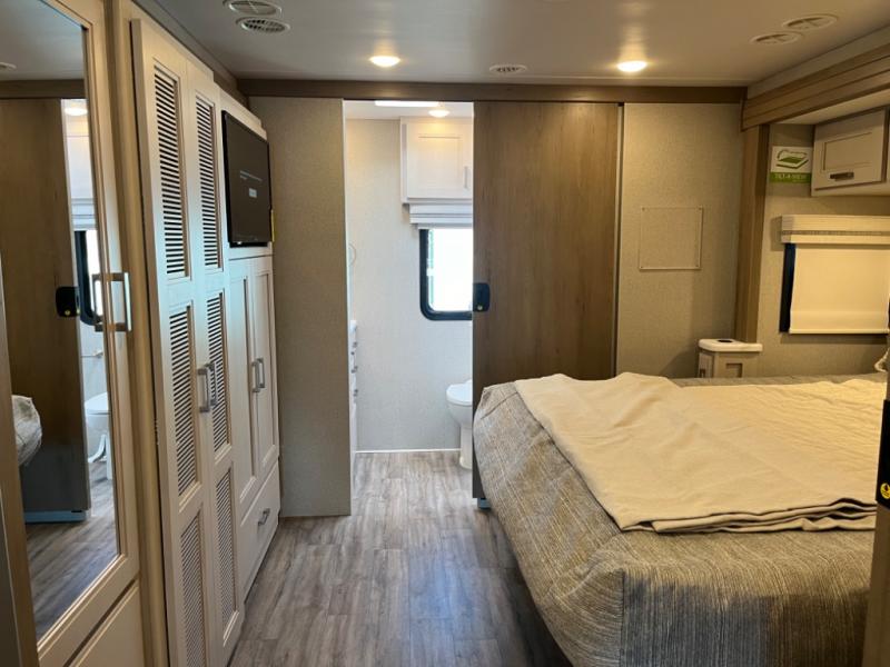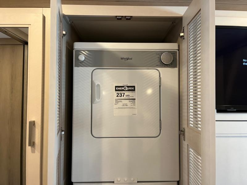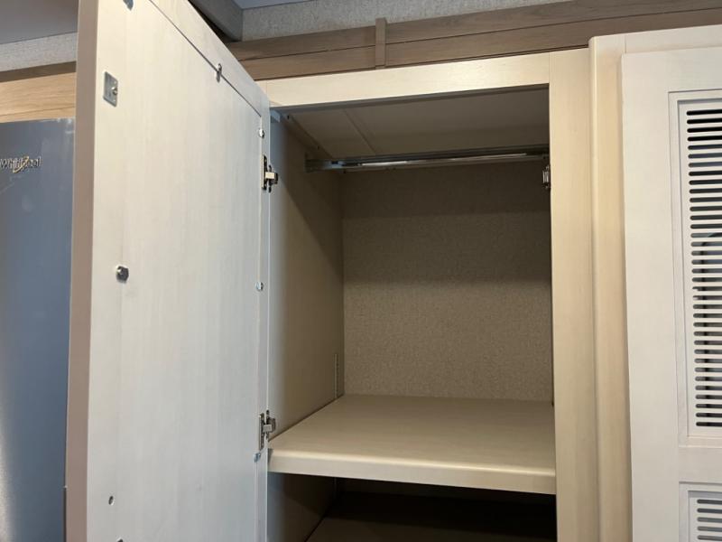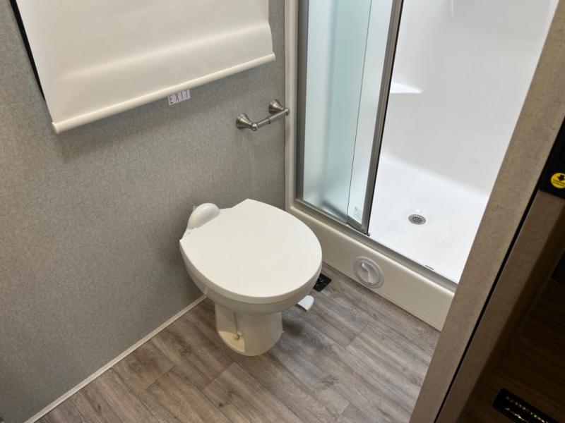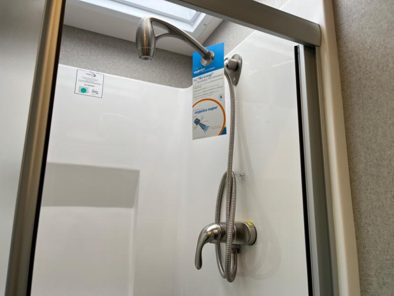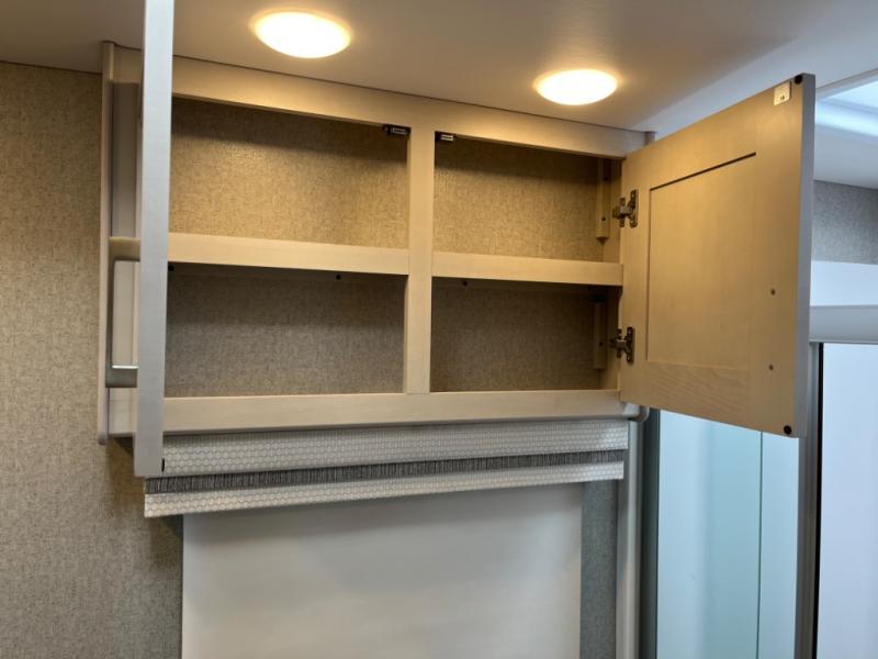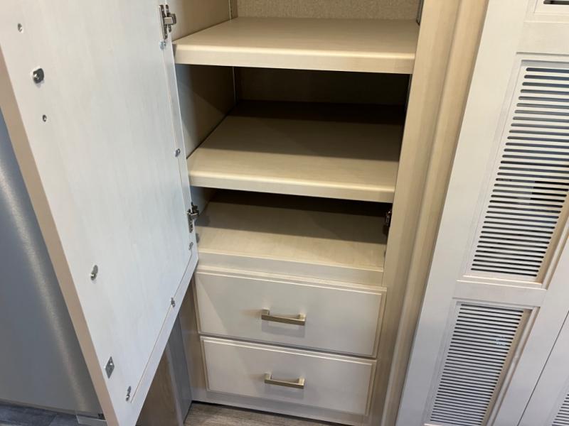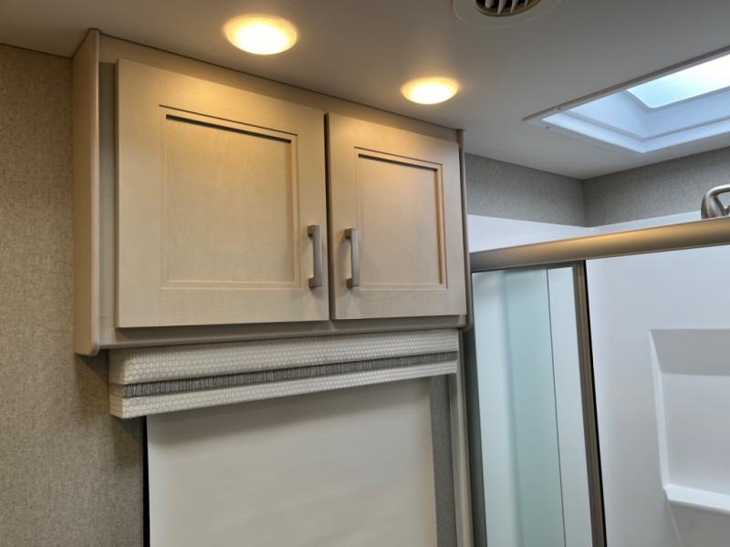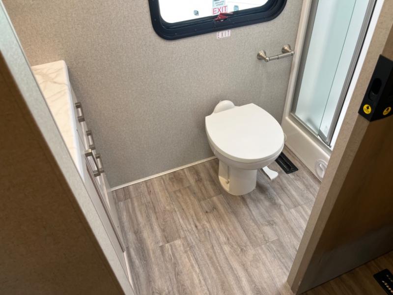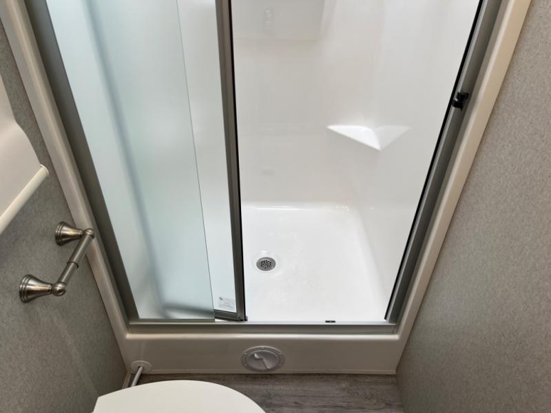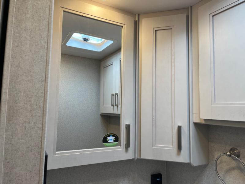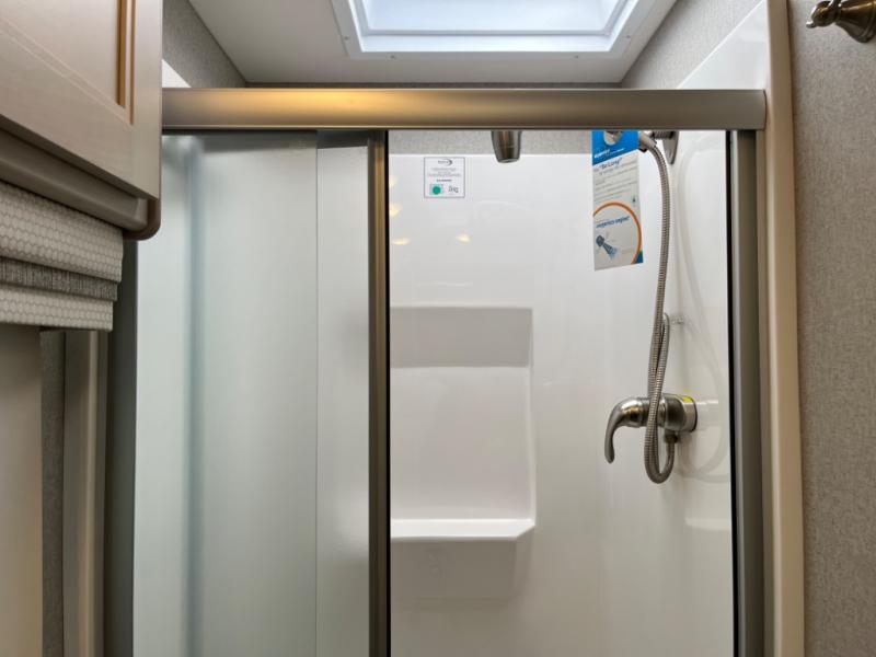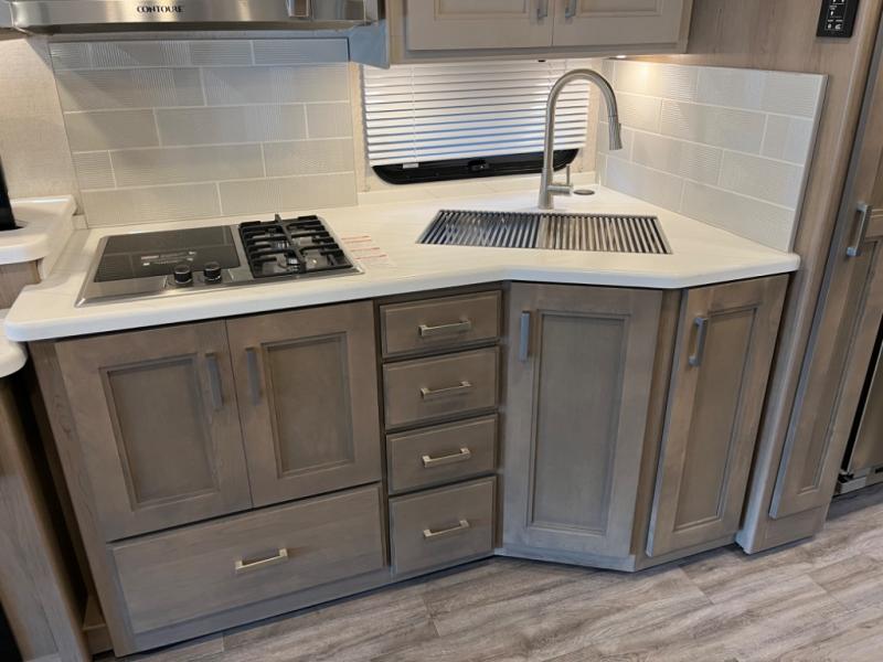 It's a clean decision to take this motorhome on your next trip with the bath and a half! The master suite offers at home comforts with a Tilt-A-View inclining king bed slide, a chest of drawers, a closet, and a 32" TV to watch movies in bed. The guests can sleep on the 52" x 80" bunk over cab and even convert the 72" Dream Dinette. Everyone can freshen up each morning in the full bathroom with the 30" x 36" shower which has a skylight above, an Oxygenics shower head, and a fiberglass shower with a glass door. Prepare your best home cooked meals with the two burner high output gas range top with single induction cooktop and easily take a bathroom break with the half bathroom nearby. The theater seating has the perfect view of the fireplace with a TV above it.