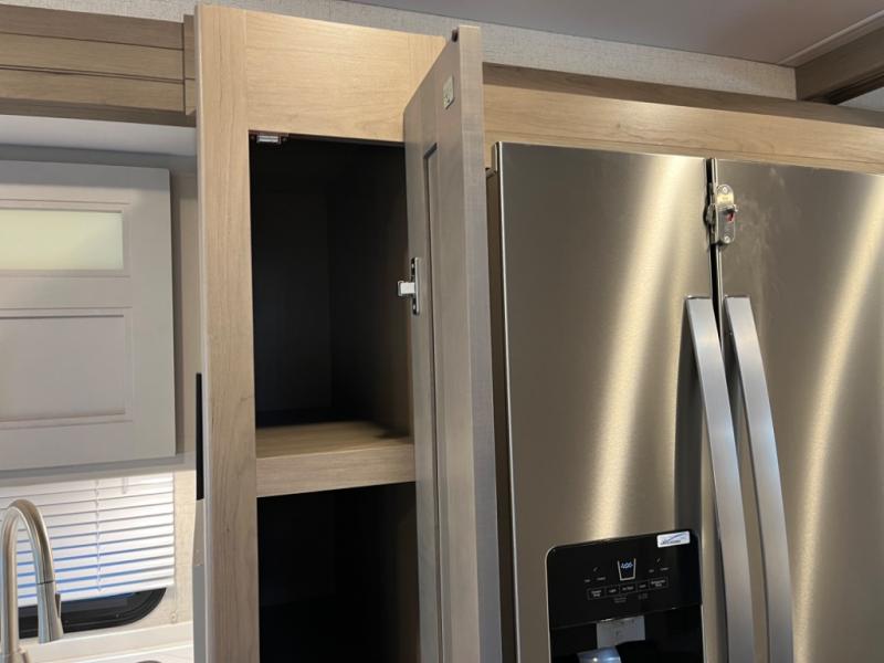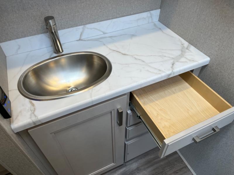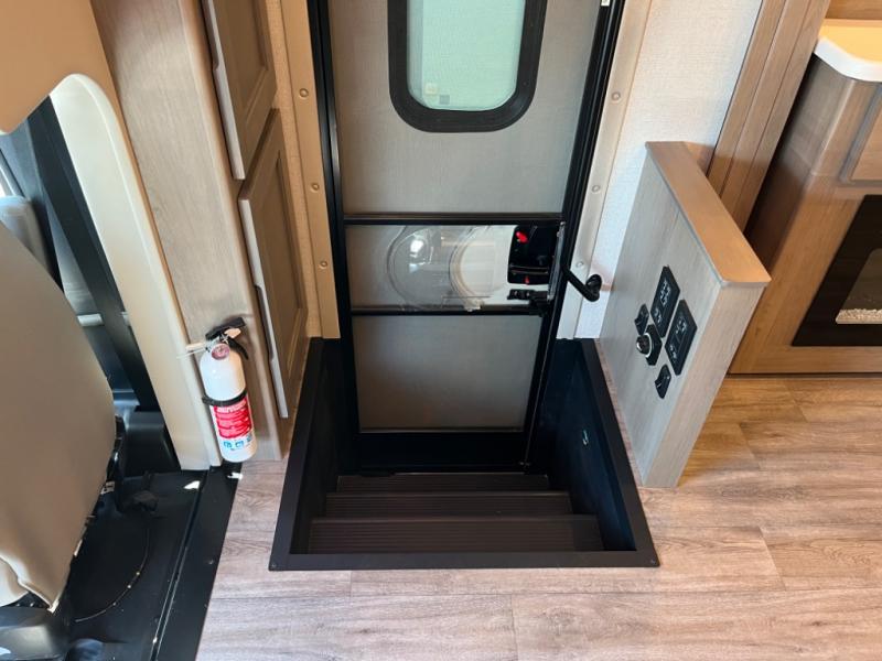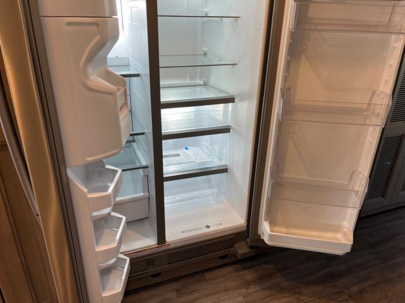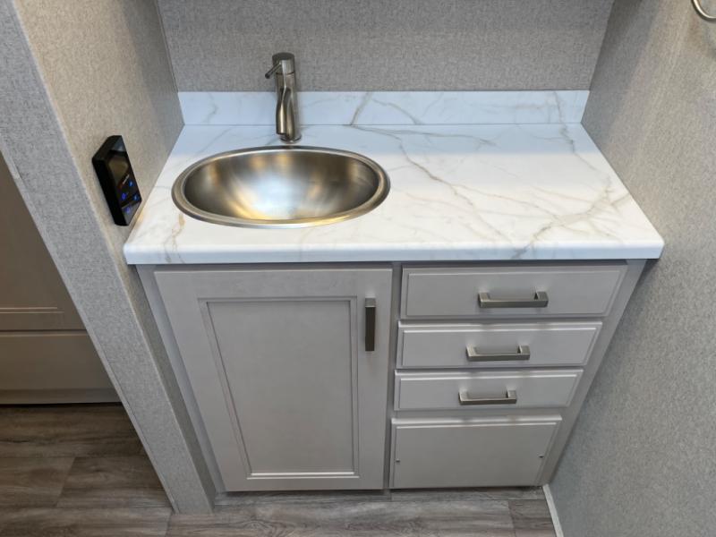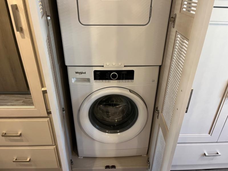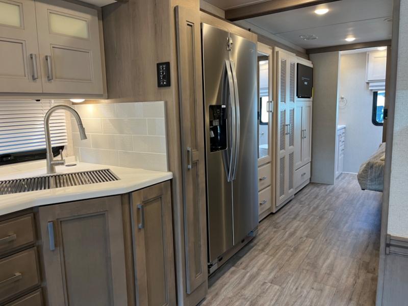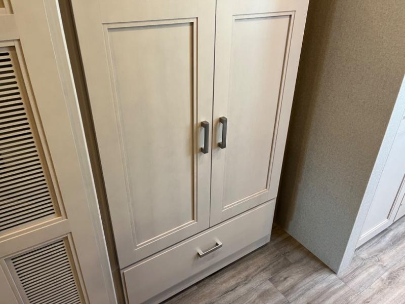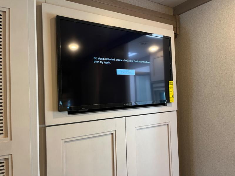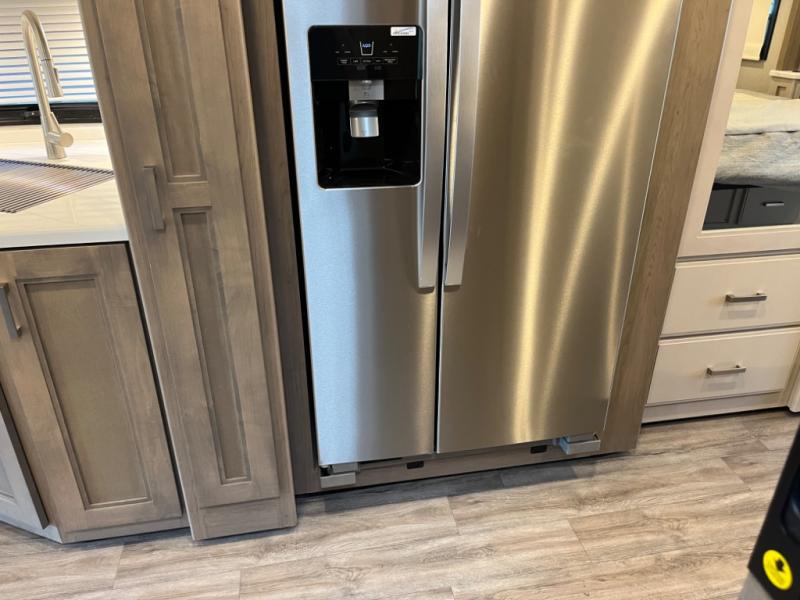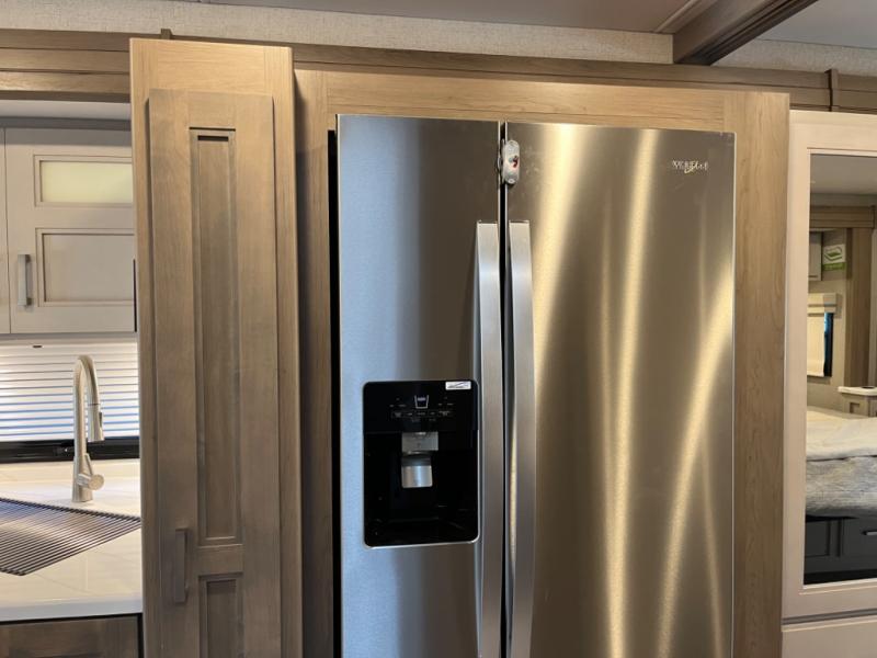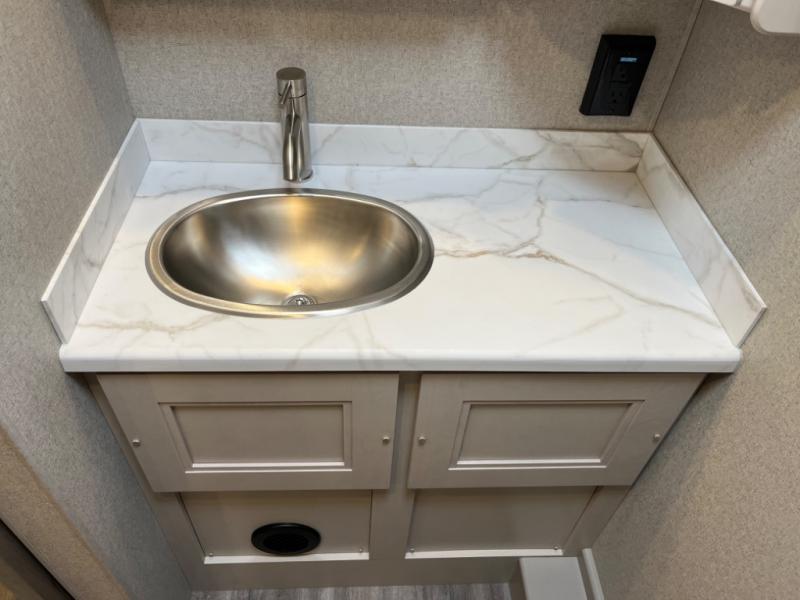 It's a clean decision to take this motorhome on your next trip with the bath and a half! The master suite offers at home comforts with a Tilt-A-View inclining king bed slide, a chest of drawers, a closet, and a 32" TV to watch movies in bed. The guests can sleep on the 52" x 80" bunk over cab and even convert the 72" Dream Dinette. Everyone can freshen up each morning in the full bathroom with the 30" x 36" shower which has a skylight above, an Oxygenics shower head, and a fiberglass shower with a glass door. Prepare your best home cooked meals with the two burner high output gas range top with single induction cooktop and easily take a bathroom break with the half bathroom nearby. The theater seating has the perfect view of the fireplace with a TV above it.