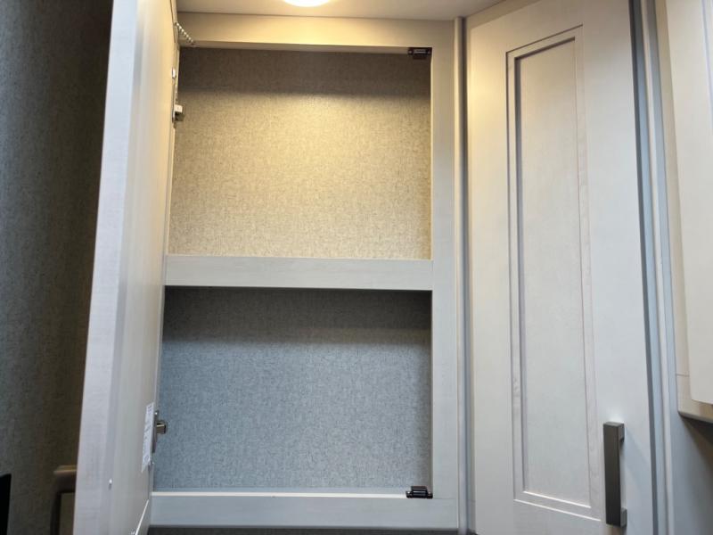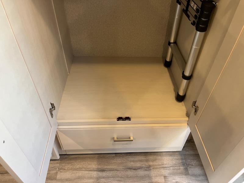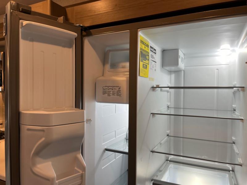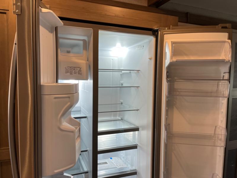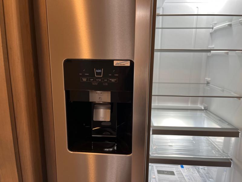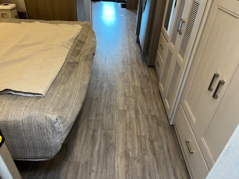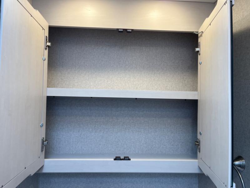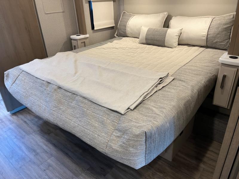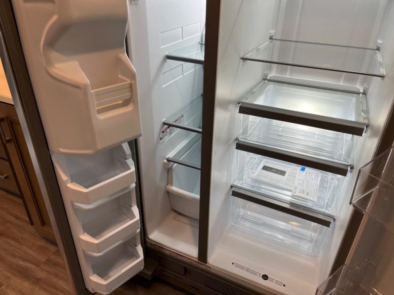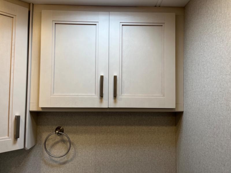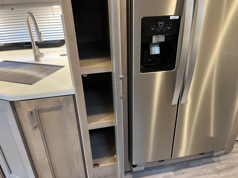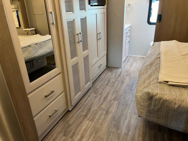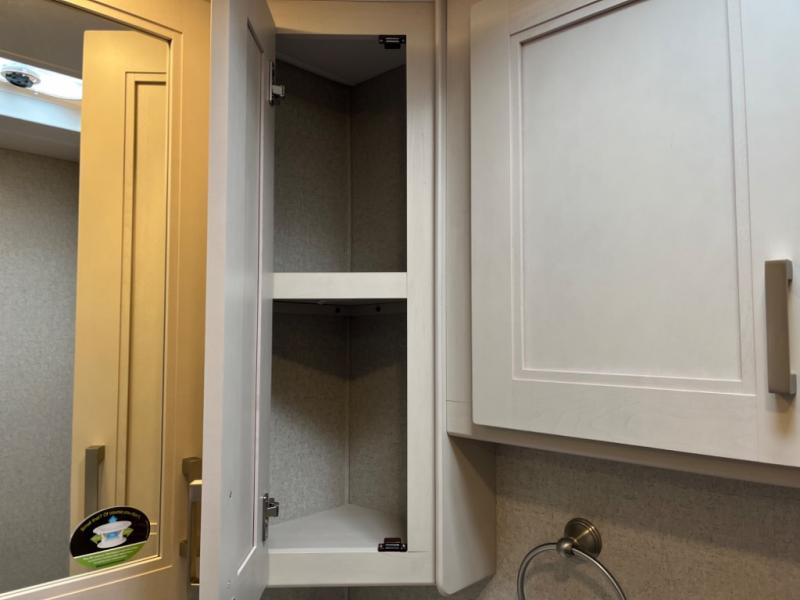 It's a clean decision to take this motorhome on your next trip with the bath and a half! The master suite offers at home comforts with a Tilt-A-View inclining king bed slide, a chest of drawers, a closet, and a 32" TV to watch movies in bed. The guests can sleep on the 52" x 80" bunk over cab and even convert the 72" Dream Dinette. Everyone can freshen up each morning in the full bathroom with the 30" x 36" shower which has a skylight above, an Oxygenics shower head, and a fiberglass shower with a glass door. Prepare your best home cooked meals with the two burner high output gas range top with single induction cooktop and easily take a bathroom break with the half bathroom nearby. The theater seating has the perfect view of the fireplace with a TV above it.