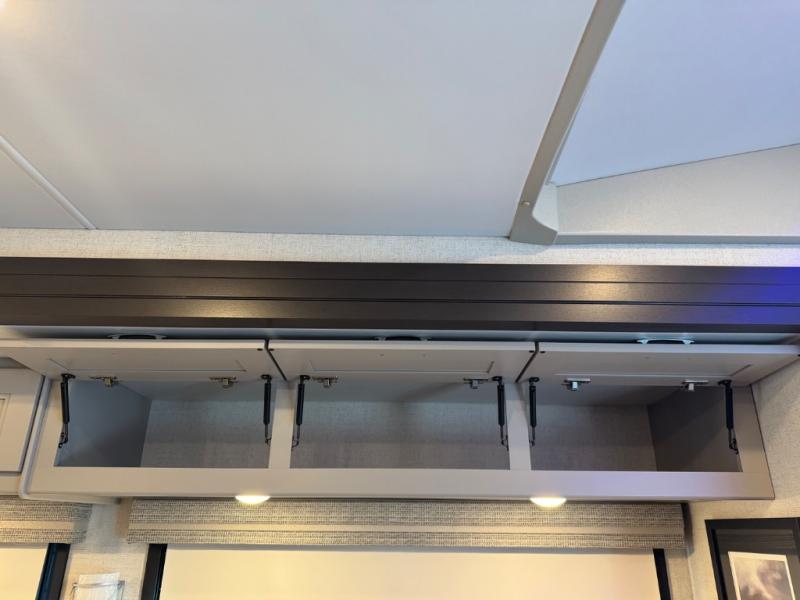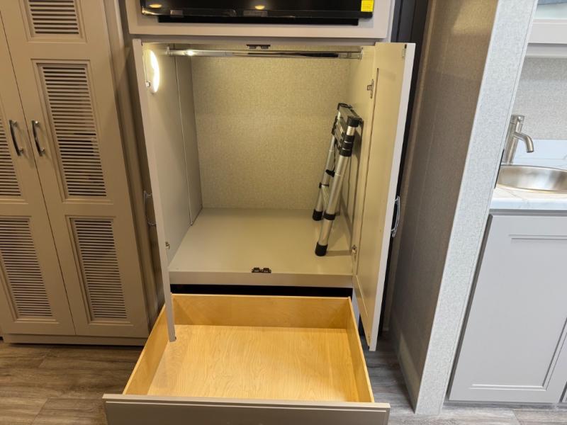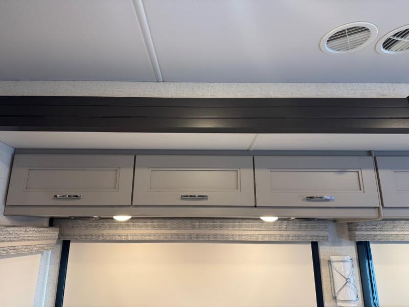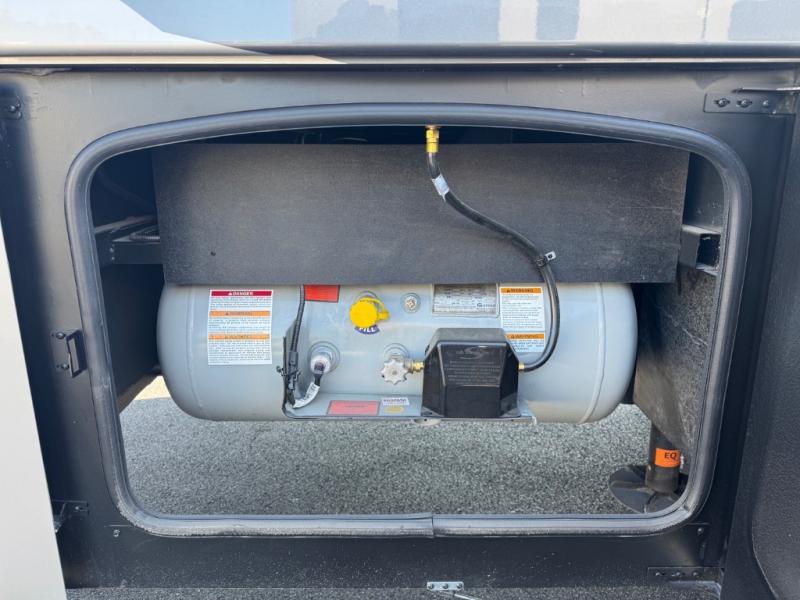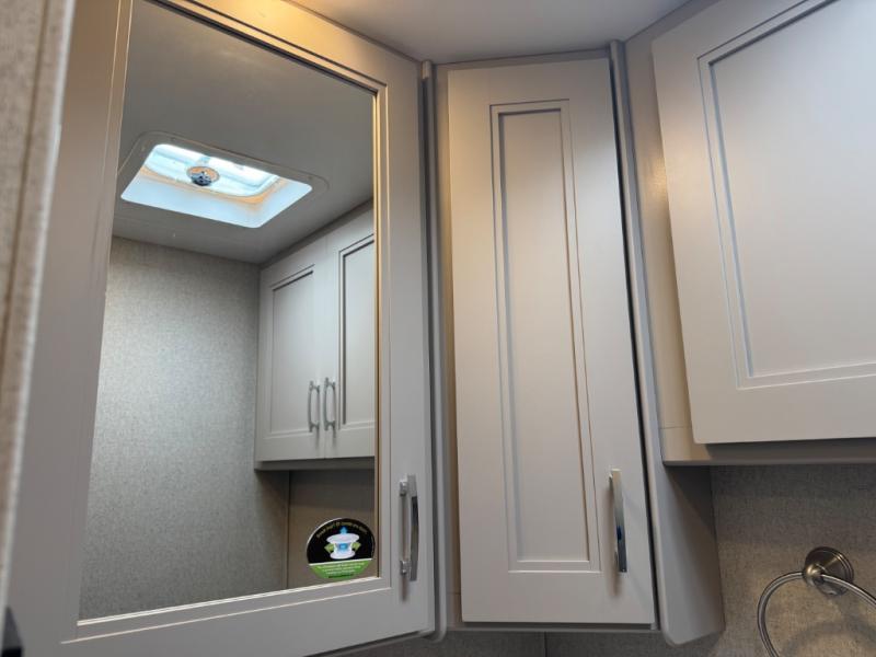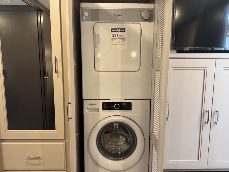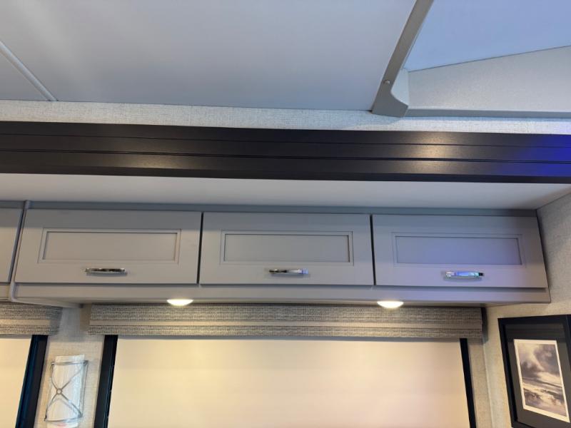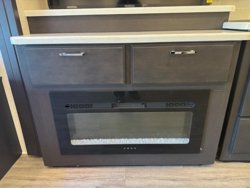 It's a clean decision to take this motorhome on your next trip with the bath and a half! The master suite offers at home comforts with a Tilt-A-View inclining king bed slide, a chest of drawers, a closet, and a 32" TV to watch movies in bed. The guests can sleep on the 52" x 80" bunk over cab and even convert the 72" Dream Dinette. Everyone can freshen up each morning in the full bathroom with the 30" x 36" shower which has a skylight above, an Oxygenics shower head, and a fiberglass shower with a glass door. Prepare your best home cooked meals with the two burner high output gas range top with single induction cooktop and easily take a bathroom break with the half bathroom nearby. The theater seating has the perfect view of the fireplace with a TV above it.