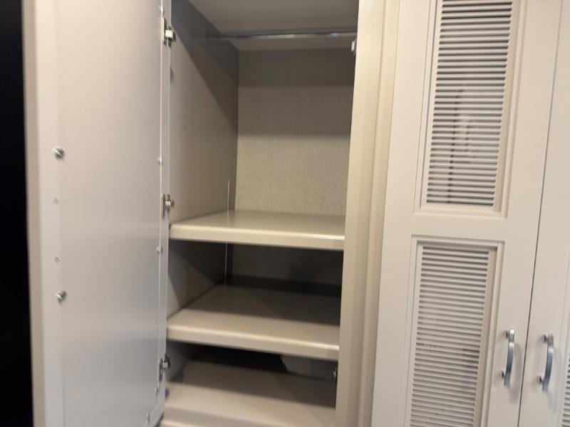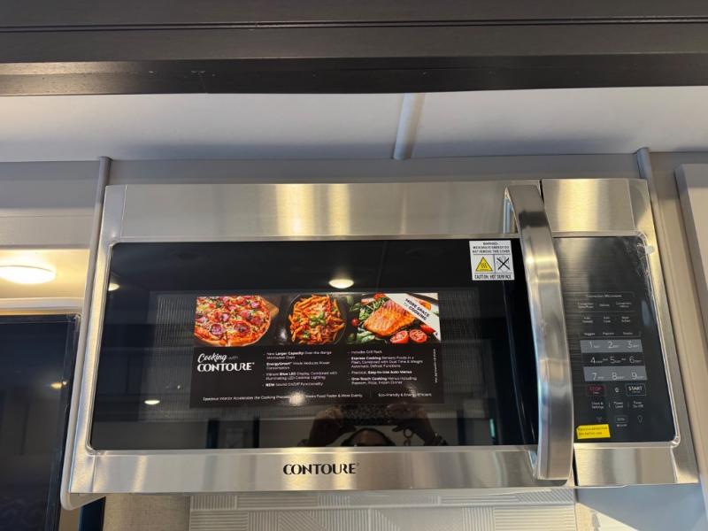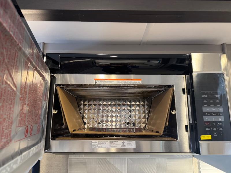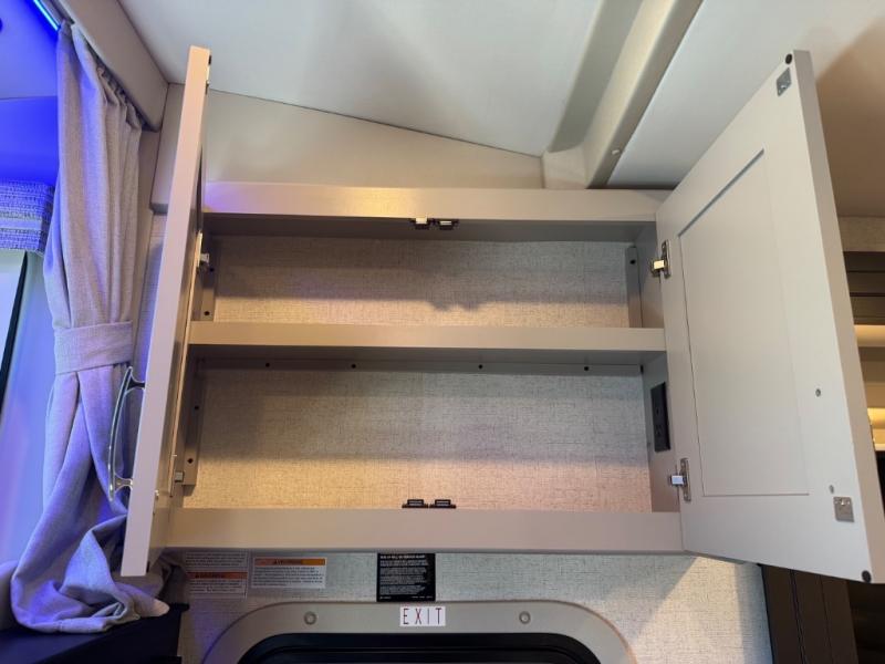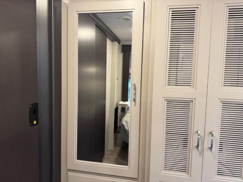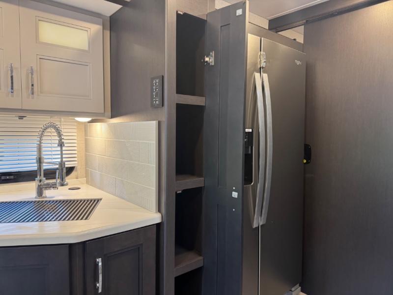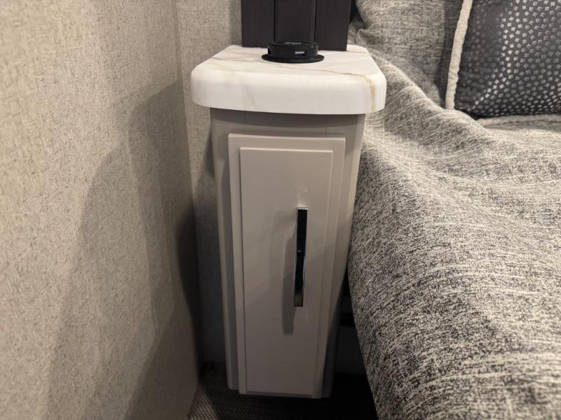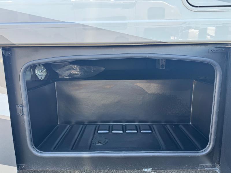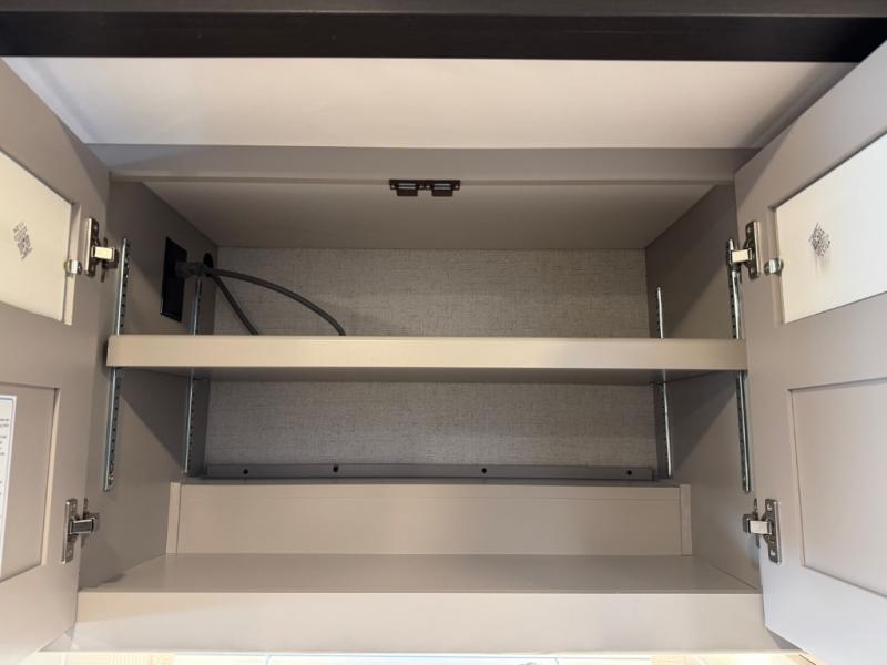It's a clean decision to take this motorhome on your next trip with the bath and a half! The master suite offers at home comforts with a Tilt-A-View inclining king bed slide, a chest of drawers, a closet, and a 32" TV to watch movies in bed. The guests can sleep on the 52" x 80" bunk over cab and even convert the 72" Dream Dinette. Everyone can freshen up each morning in the full bathroom with the 30" x 36" shower which has a skylight above, an Oxygenics shower head, and a fiberglass shower with a glass door. Prepare your best home cooked meals with the two burner high output gas range top with single induction cooktop and easily take a bathroom break with the half bathroom nearby. The theater seating has the perfect view of the fireplace with a TV above it.