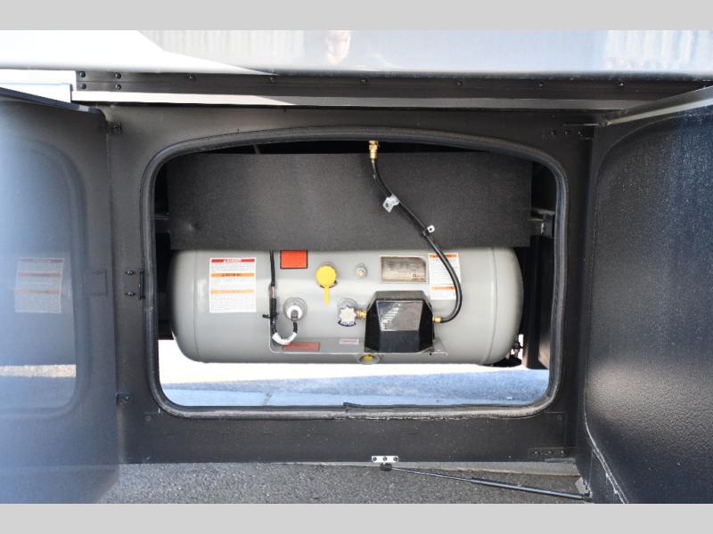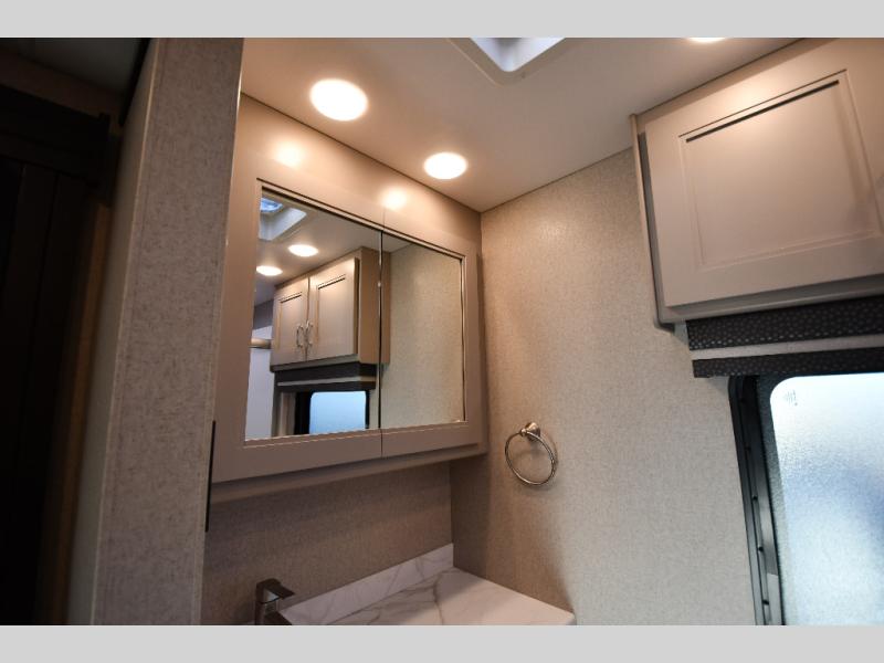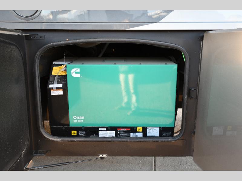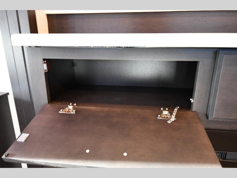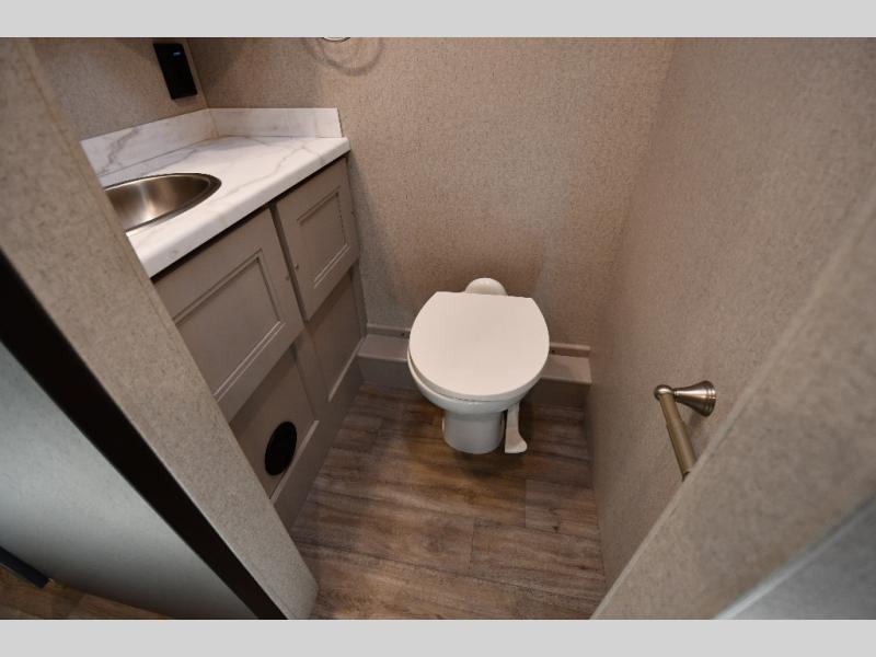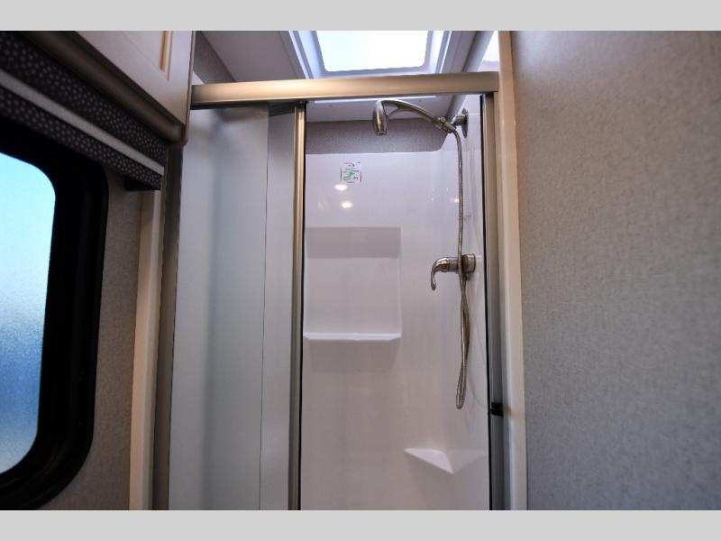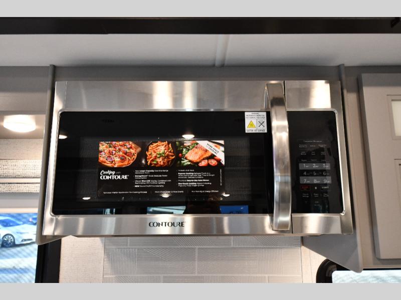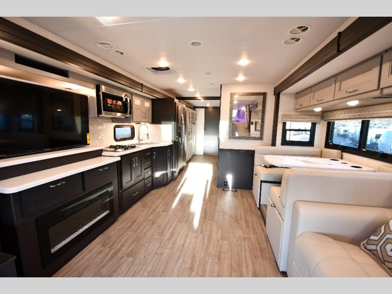 It's a clean decision to take this motorhome on your next trip with the bath and a half! The master suite offers at home comforts with a Tilt-A-View inclining king bed slide, a chest of drawers, a closet, and a 32" TV to watch movies in bed. The guests can sleep on the 52" x 80" bunk over cab and even convert the 72" Dream Dinette. Everyone can freshen up each morning in the full bathroom with the 30" x 36" shower which has a skylight above, an Oxygenics shower head, and a fiberglass shower with a glass door. Prepare your best home cooked meals with the two burner high output gas range top with single induction cooktop and easily take a bathroom break with the half bathroom nearby. The theater seating has the perfect view of the fireplace with a TV above it.