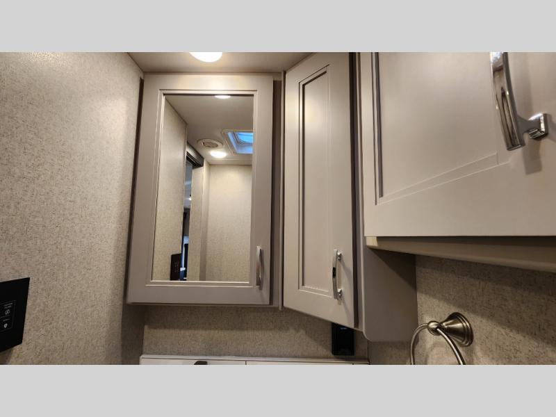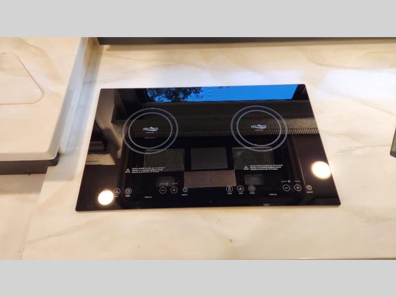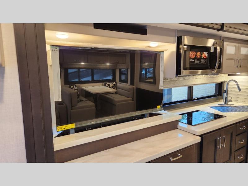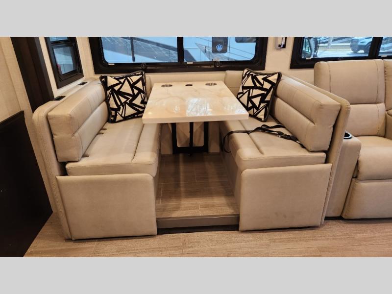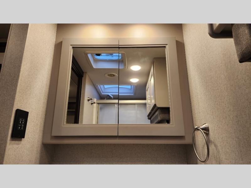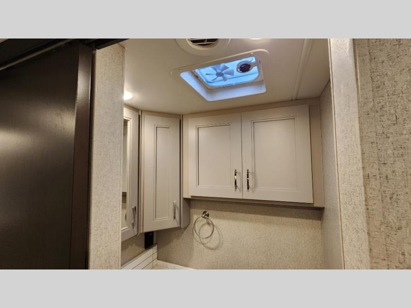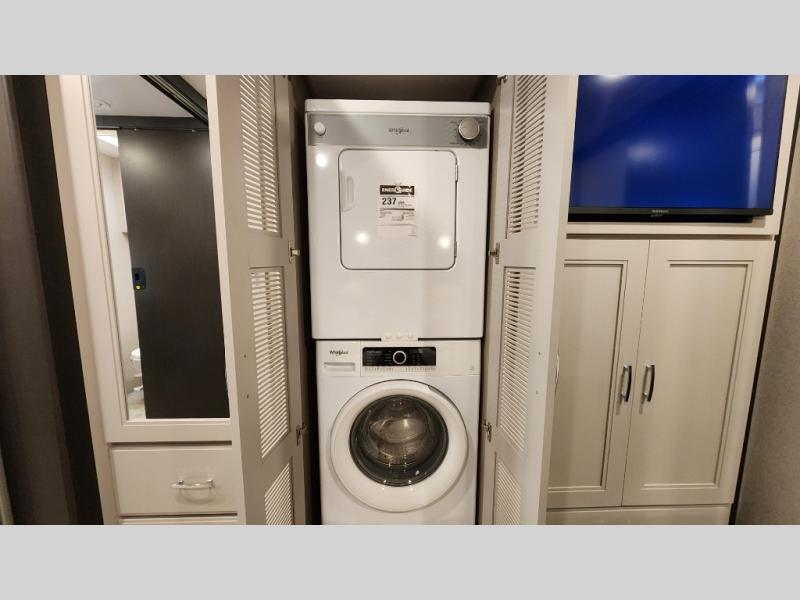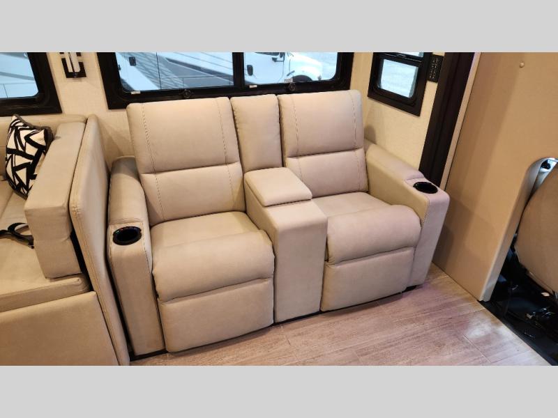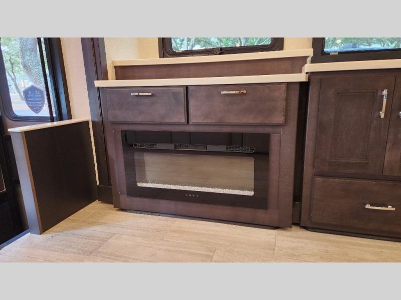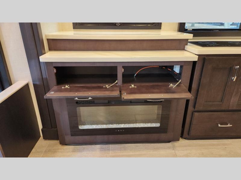 It's a clean decision to take this motorhome on your next trip with the bath and a half! The master suite offers at home comforts with a Tilt-A-View inclining king bed slide, a chest of drawers, a closet, and a 32" TV to watch movies in bed. The guests can sleep on the 52" x 80" bunk over cab and even convert the 72" Dream Dinette. Everyone can freshen up each morning in the full bathroom with the 30" x 36" shower which has a skylight above, an Oxygenics shower head, and a fiberglass shower with a glass door. Prepare your best home cooked meals with the two burner high output gas range top with single induction cooktop and easily take a bathroom break with the half bathroom nearby. The theater seating has the perfect view of the fireplace with a TV above it.